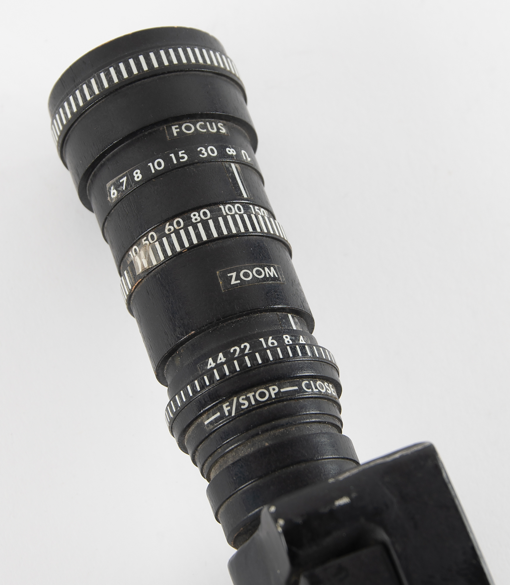 Apollo/Skylab Data Acquisition Camera (DAC) training mock-up, measuring approximately 12.5˝ x 4.5˝ x 2.5˝, featuring a wooden 'dummy' lens appropriately labeled for "Focus," "Zoom," and "F/Stop," swivel latch with thumbwheel securing a mock-up film magazine, two electrical connectors representing 'power' and 'remote,' and metal mounting plate on the bottom. In very good to fine condition.