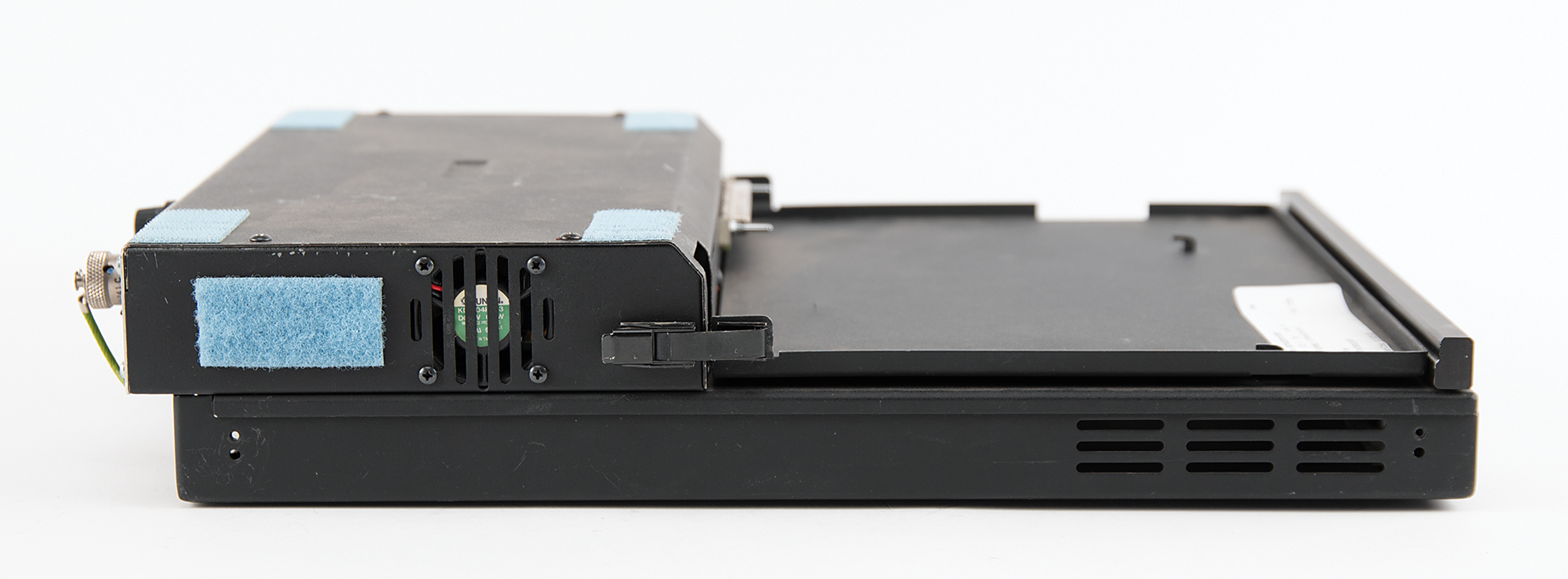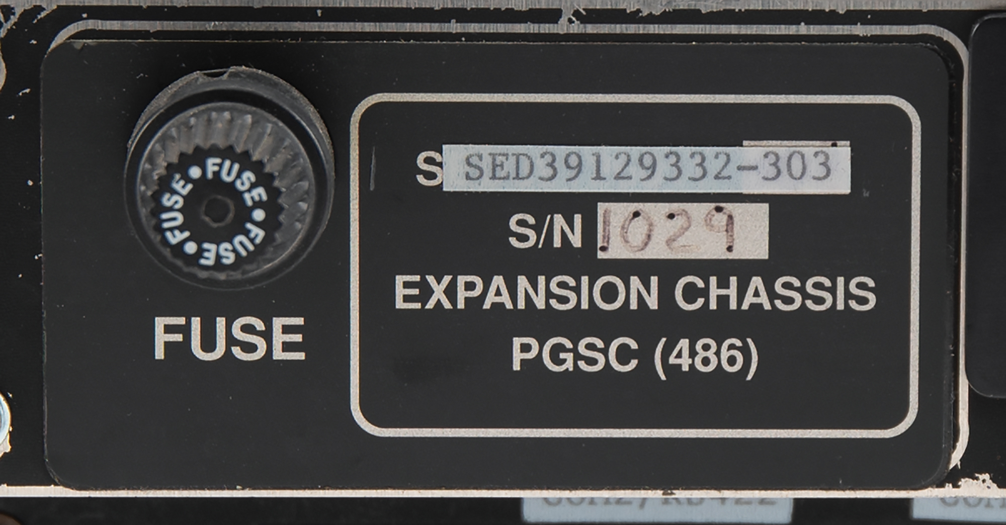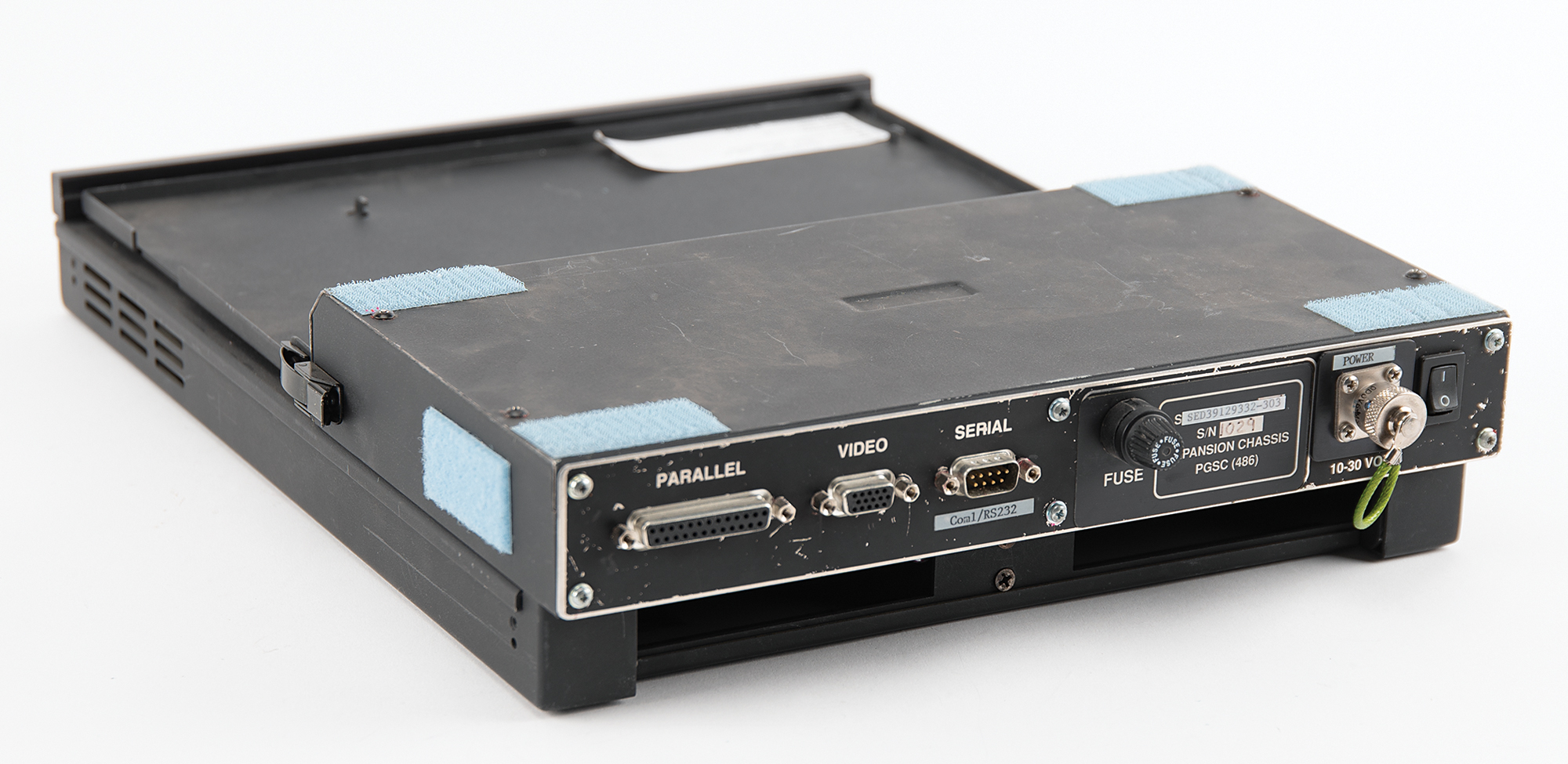 Docking station built for use on the Space Shuttle with modified IBM ThinkPad laptops known as Space Shuttle Payload and General Support Computers (PGSC), measuring approximately 12˝ x 15.25˝ x 3˝, labeled on the rear panel: "SED39129332-303, S/N 1029, Expansion Chassis, PGSC (486)." The chassis carries ports for "Parallel," "Video," "Serial," and "Power," with several affixed swatches of Velcro on the top, bottom, and sides.