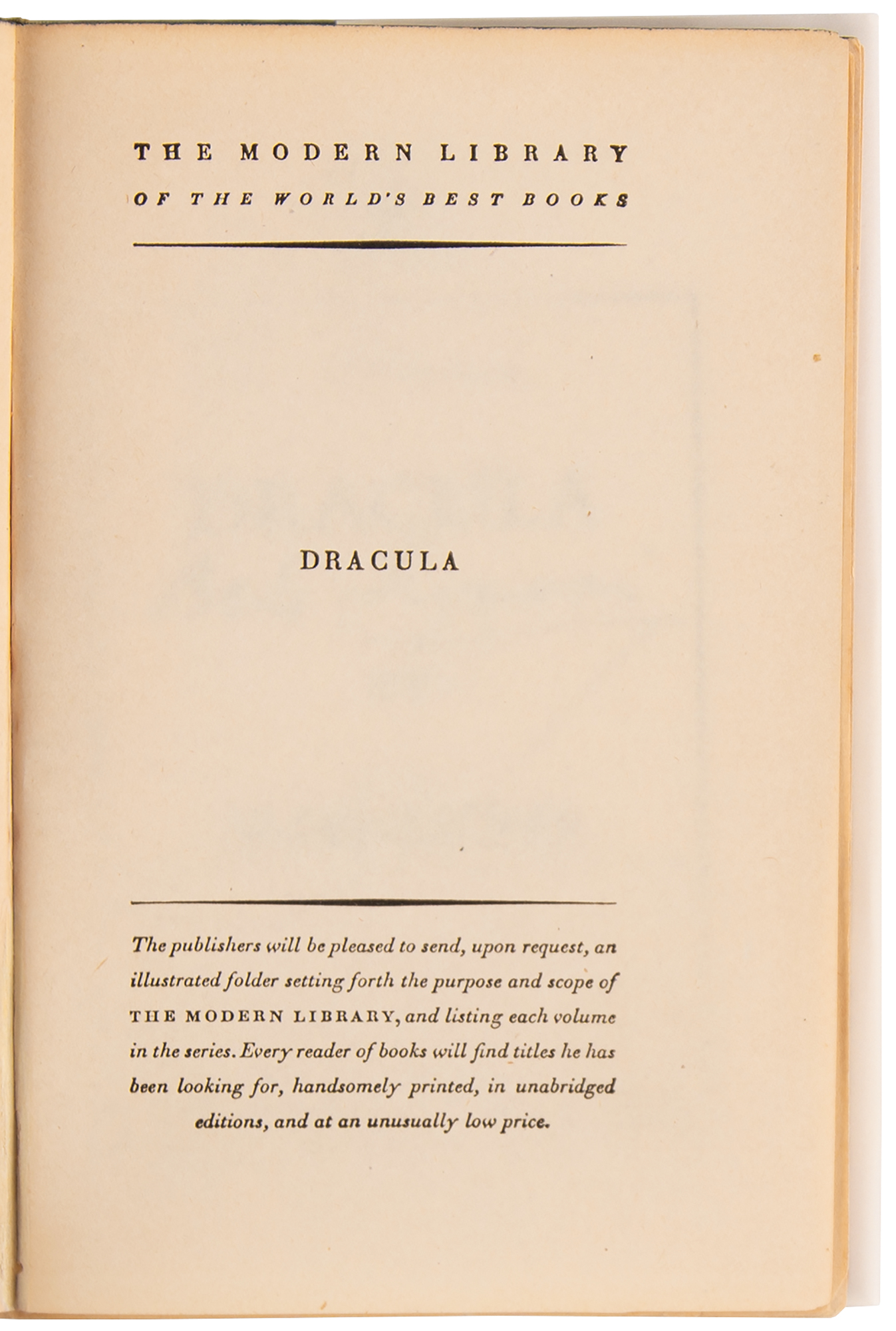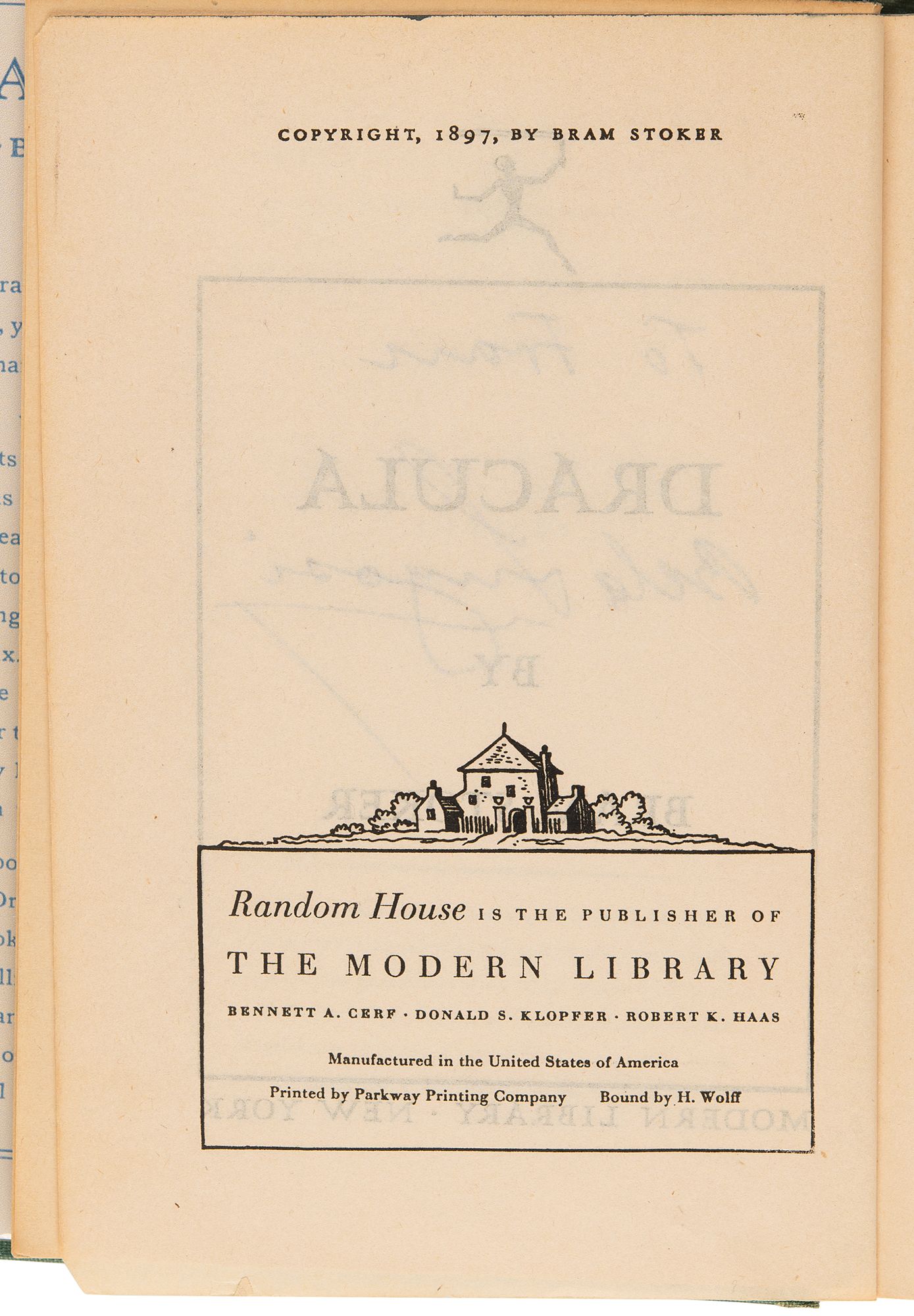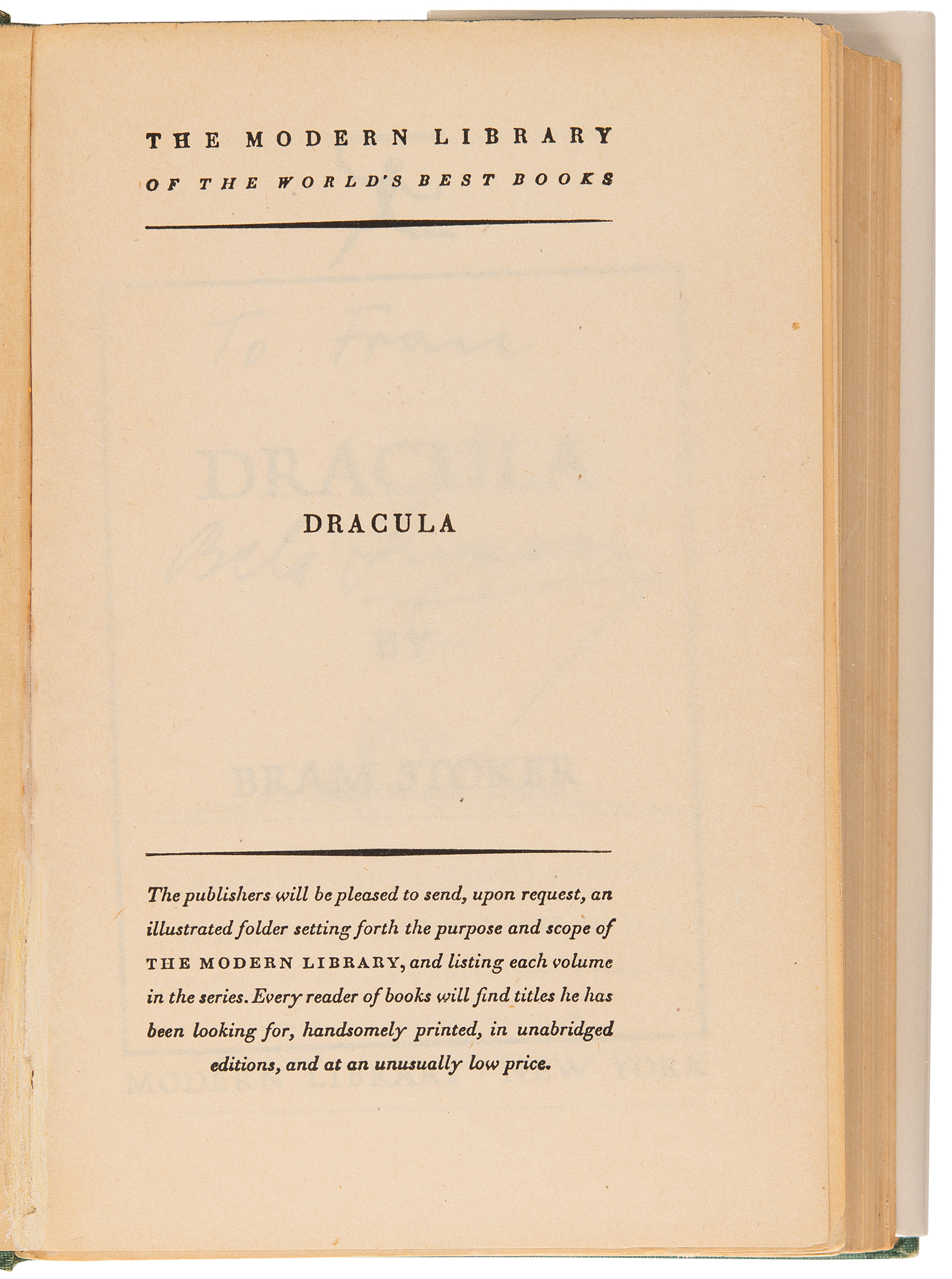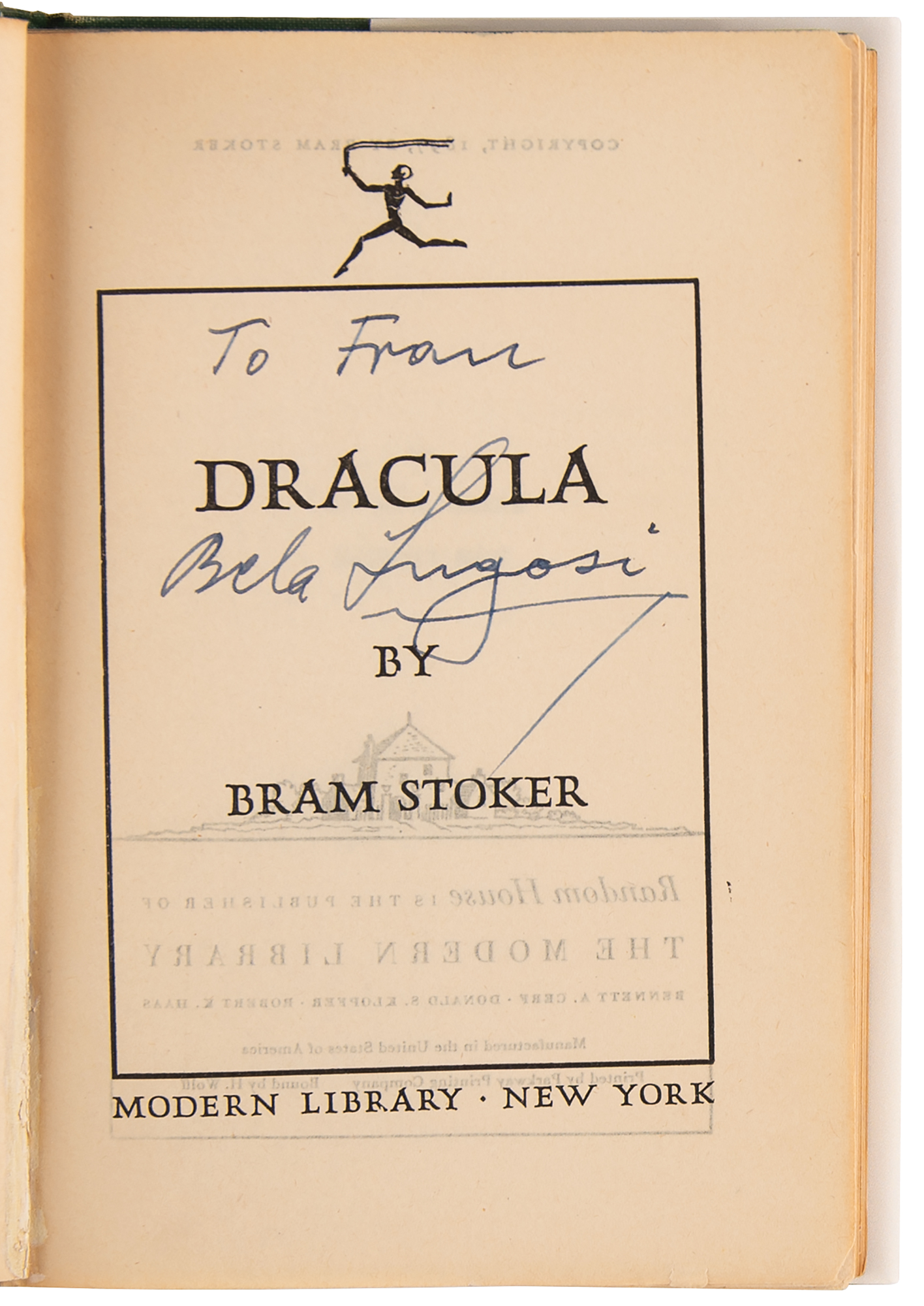 Signed book: Dracula by Bram Stoker. Later printing. NY: Modern Library (Random House). Hardcover with modern facsimile dust jacket, 5.25 x 7.25, 418 pages. Signed and inscribed on the title page in black ink, "To Fran, Bela Lugosi." Autographic condition: fine. Book condition: VG-/None, with cracked hinges, edgewear, and rubbing to boards.