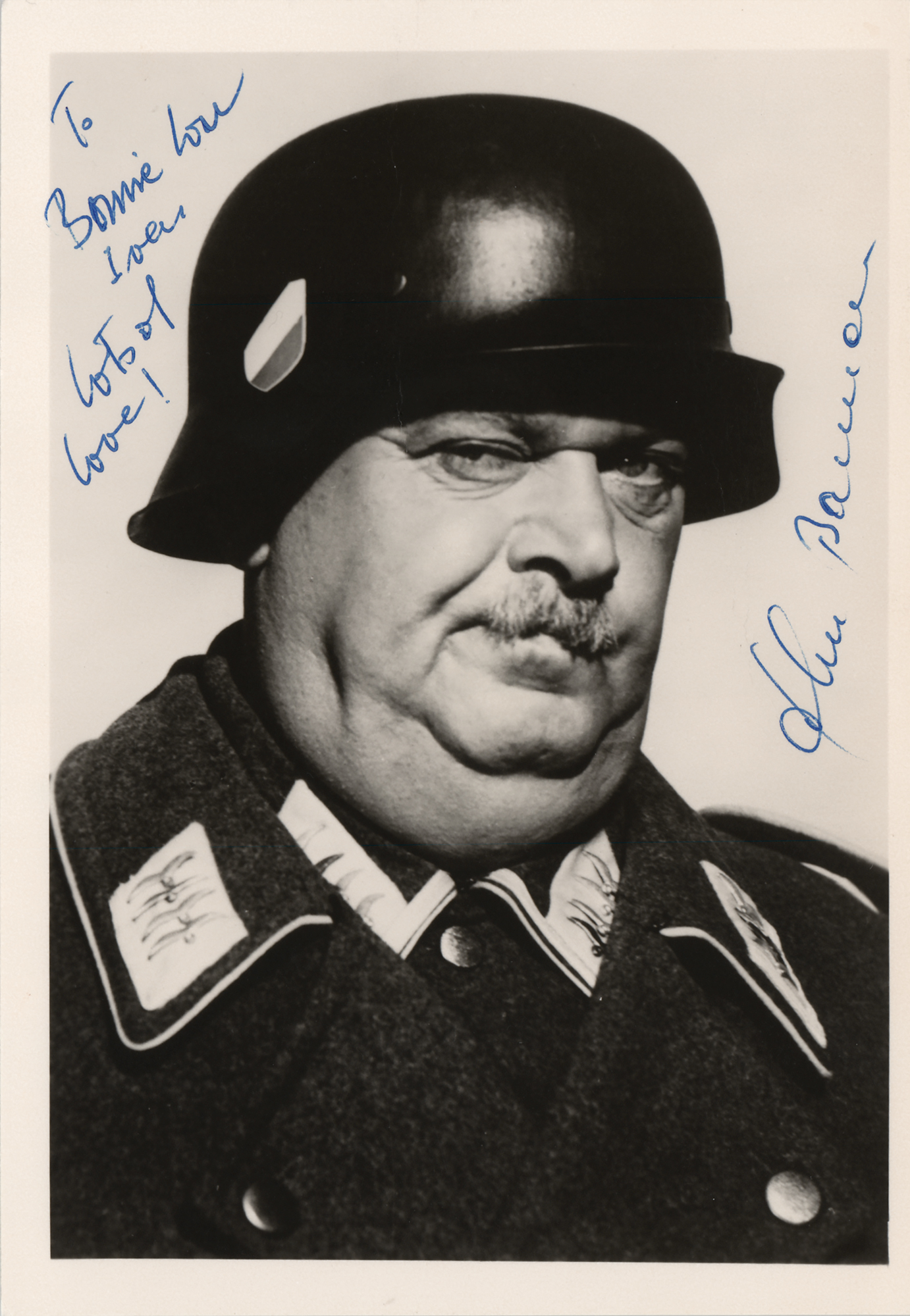 Vintage matte-finish 4.75 x 7 photo of John Banner as Sergeant Hans Schultz from Hogan's Heroes, signed and inscribed in blue ballpoint, “To Bonnie Lou Ivers, lots of love! John Banner.” In very good to fine condition, with a couple of creases touching Banner's helmet.