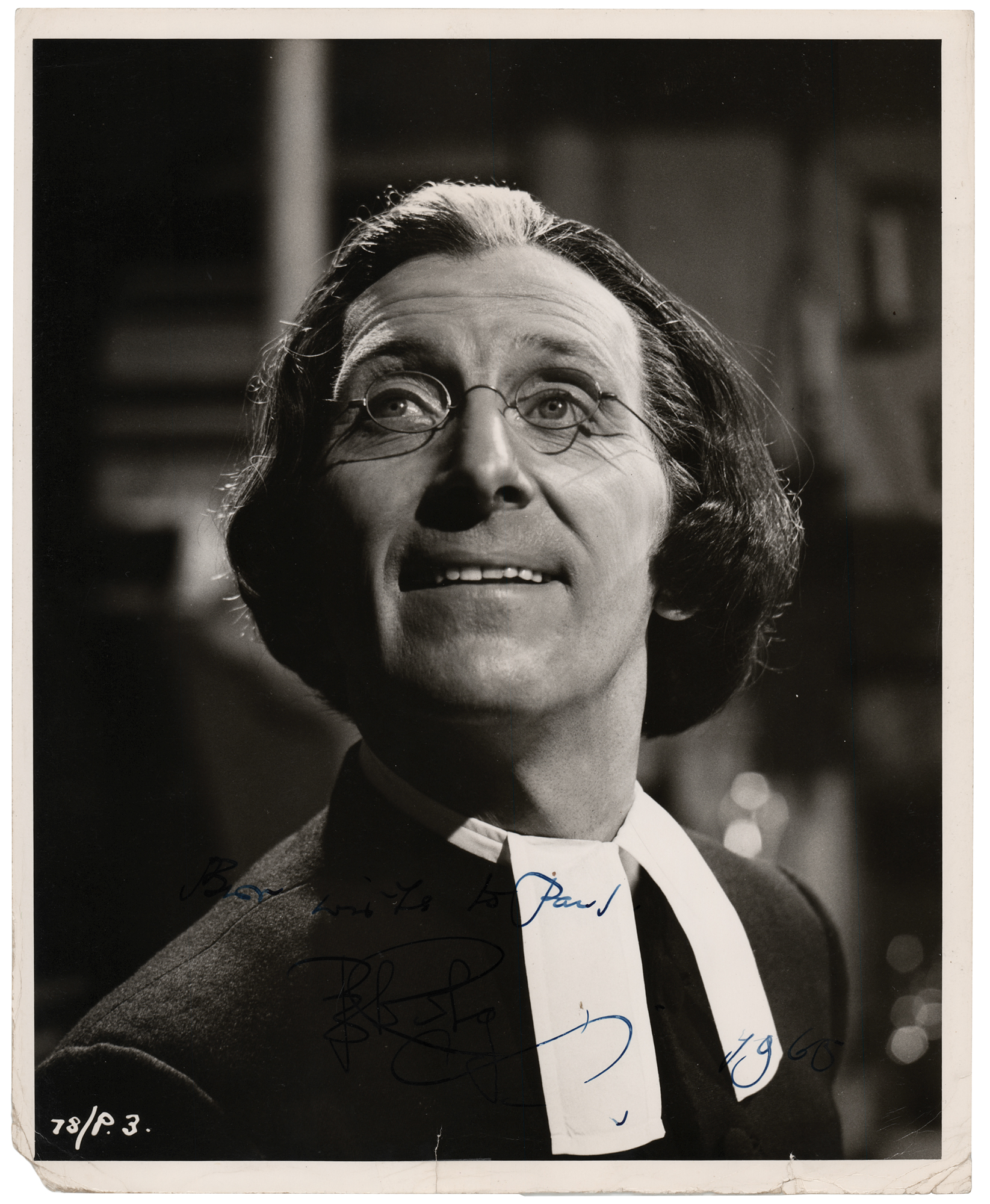 Vintage glossy 8 x 10 close-up photo of Peter Cushing as Parson Blyss in the 1962 film Captain Clegg, signed and inscribed in fountain pen, "Best wishes to Paul, Peter Cushing, 1965.” In very good to fine condition, with scattered light creasing (heavier to the bottom edge), loss to the lower left corner, and poor signature contrast.