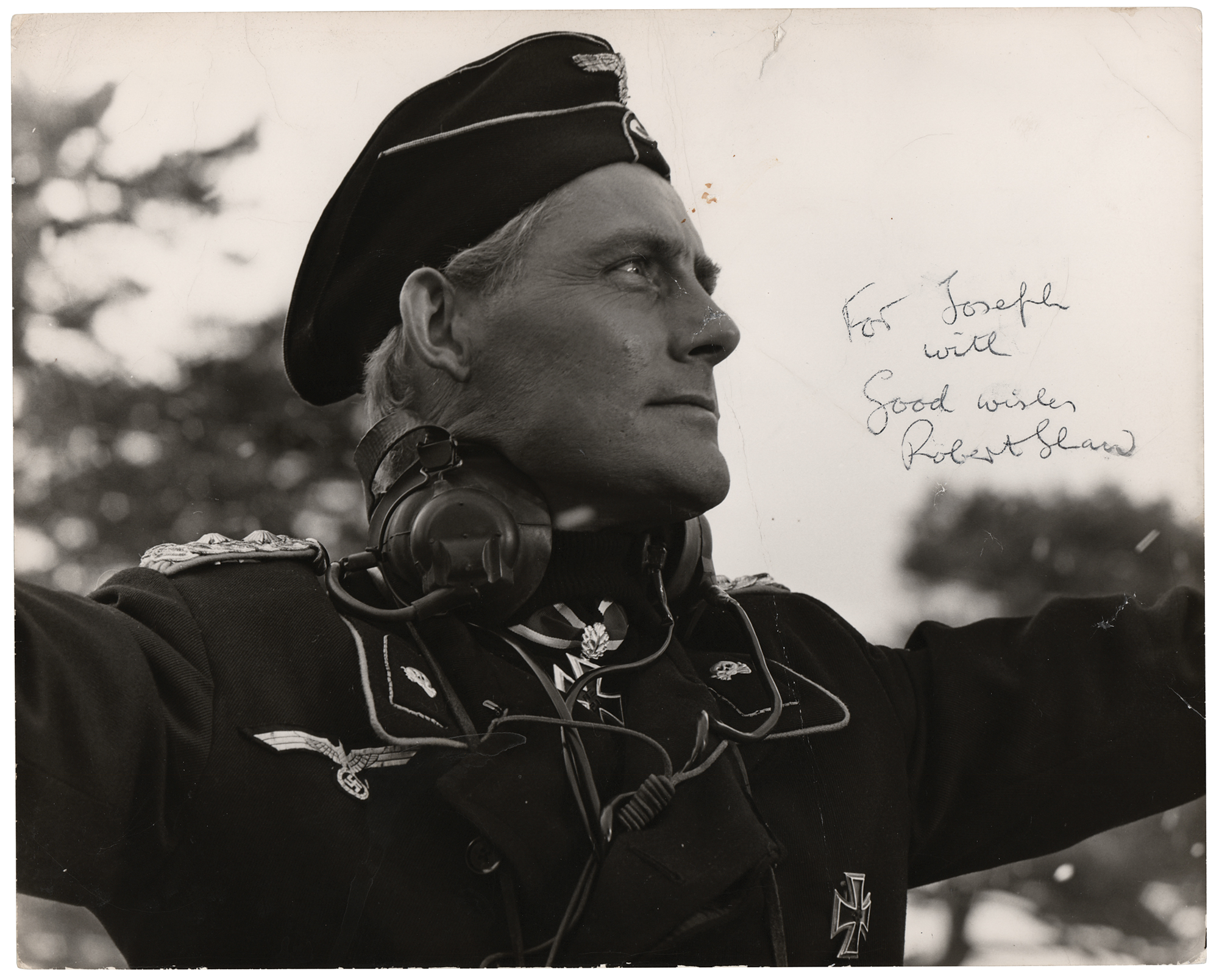 Glossy 10 x 8 profile photo of Shaw as ruthless German Panzer commander Colonel Hessler in the 1965 film Battle of the Bulge, signed and inscribed in black ink, "For Joseph Wite, Good wishes, Robert Shaw.” In good to very good condition, with very heavy overall creasing, affecting appearance.