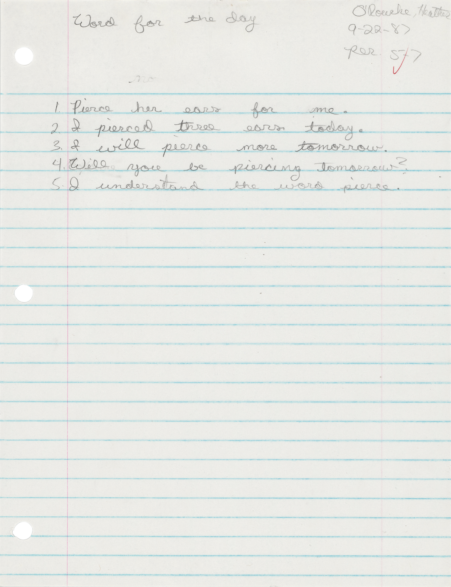 American actress (1975-1988), best remembered for her memorable performance in the horror classic Poltergeist, who tragically died at the age of 12. Handwritten school assignment in pencil by an 11-year-old Heather O'Rourke, one page, 8 x 10.5, signed in the upper right corner, "O'Rourke, Heather, 9-22-87, Per. 5-7.” The assignment is headed “Word for the day,” and contains five sentences that include the word ‘pierce.’ In fine condition.