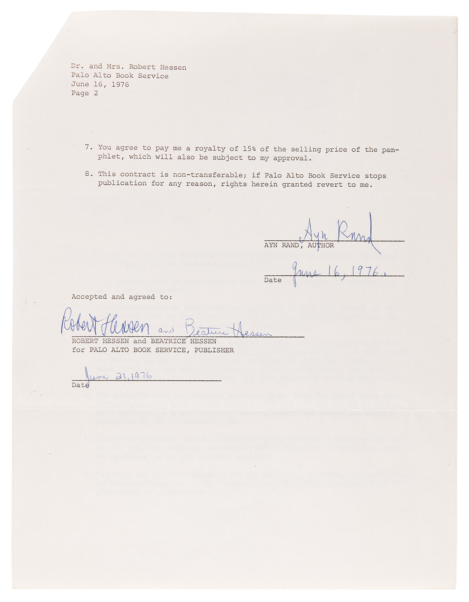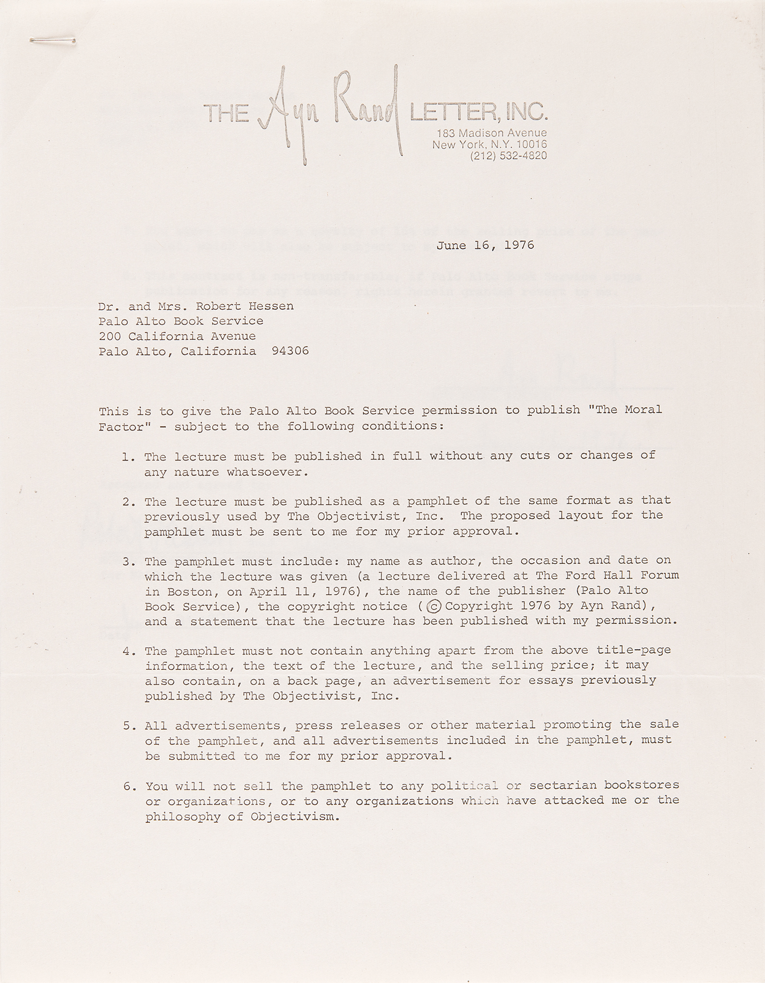 DS, two pages, 8.5 x 11, The Ayn Rand Letter, Inc. letterhead, June 16, 1976. Contract between Ayn Rand and the Palo Alto Book Service, allowing them to print The Moral Factor, a lecture that Ayn Rand gave at the Ford Hall Forum in Boston, Massachusetts, on April 11, 1976. In part: “1. The lecture must be published in full without any cuts or changes… 2. The lecture must be published as a pamphlet of the same format as that previously used by The Objectivist, Inc.…6. You will not sell the pamphlet to any political or sectarian bookstores or organizations, or to any organizations which have attacked me or the philosophy of Objectivism.” Signed and dated at the conclusion in blue ballpoint by Rand. In fine condition. In honor of the 200th anniversary of the Declaration of Independence, Ayn Rand delivered her speech ‘The Moral Factor,’ which contrasted the Founding Fathers’ principled concern for individual rights with the unprincipled views of voters and candidates in the 1976 presidential election. Rand also dissects the evils of the welfare state, focusing on Sweden as its exemplar, and calls for Americans to observe the Bicentennial by discovering and upholding the nation’s founding ideals.