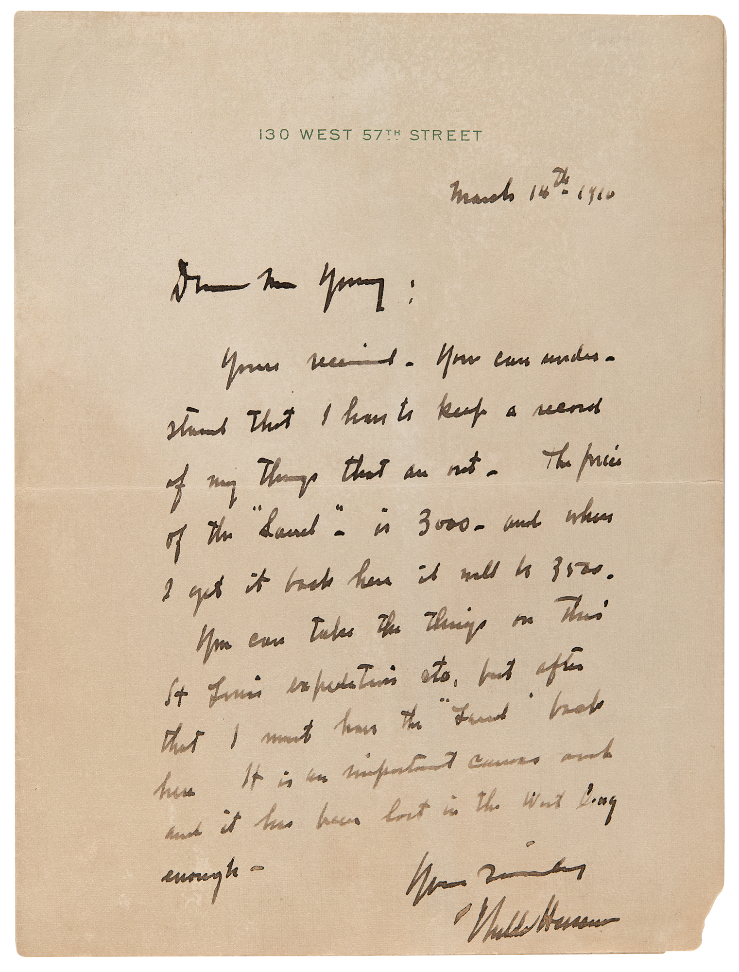 Painter (1859–1935) who helped introduce Impressionism to Americans, best known for his urban and coastal scenes. ALS, one page, 4.75 x 6.5, 130 West 57th Street letterhead, March 14, 1910. Handwritten letter to an exhibition curator, in full: “Yours received. You can understand that I have to keep a record of my things that are out. The price of the 'Laurel,' is 3,000, and when I get it back here it will be 3,500. You can take the things on this St. Louis exposition, etc., but after that I must have the 'Laurel' back here. It is an important canvas and it has been lost in the West long enough." In very good to fine condition, with faint dampstaining, and minor loss to the lower right corner tip. Painted by Hassam in 1906, his artwork ‘Laurel on the Ledges’ captures a lush, verdant woodland scene, where the artist masterfully employs light and shadow to juxtapose the rich foliage. The overall composition immerses the viewer in a tranquil forest setting, invoking the serene beauty and intricate detail of nature.
