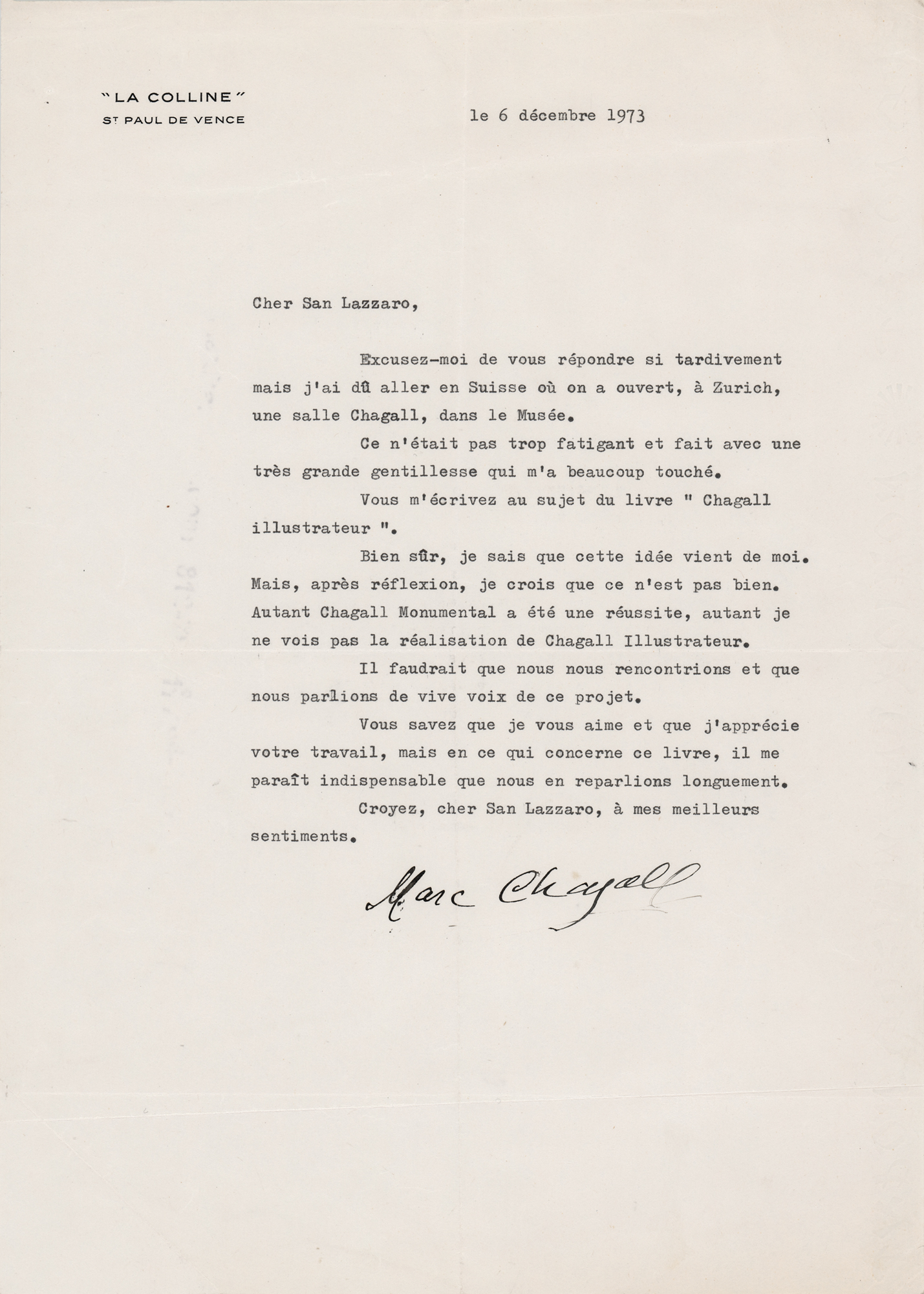 TLS in French, one page, 8.25 x 11.75, 'La Colline' letterhead, December 6, 1973. Letter to San Lazzaro, his book publisher, in full (translated): “Forgive me for replying so late, but I had to go to Switzerland, where a Chagall room has opened in the Museum in Zurich. It wasn't too tiring and was done with great kindness, which touched me deeply. You are writing to me about the book ‘Chagall Illustrator.’ Of course, I know this idea came from me. But, after reflection, I think it's not right. As much as Chagall Monumental was a success, I don't see Chagall Illustrator being a success. We should meet and discuss this project face to face. You know that I love you and appreciate your work, but regarding this book, it seems essential that we discuss it at length. Please accept, dear San Lazzaro, my best regards.’ In fine condition.