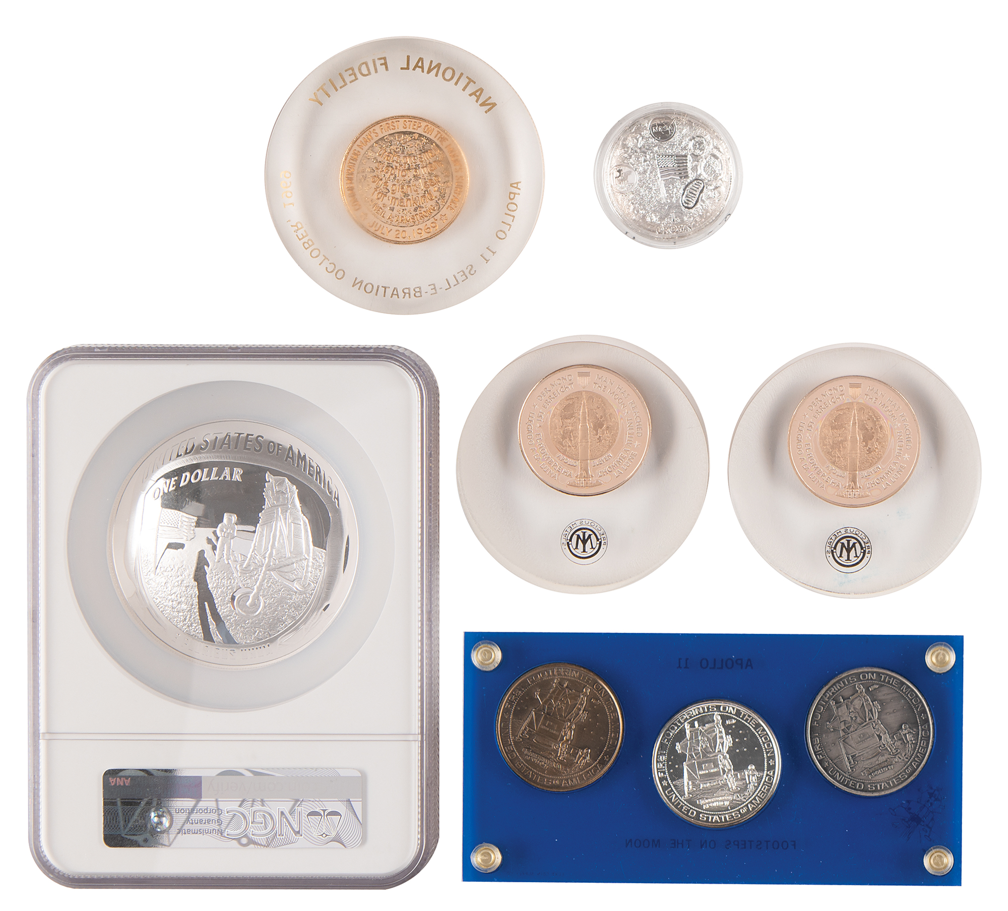 Great collection of eight Apollo 11 commemorative coins, including: a five-ounce proof silver dollar coin honoring the 50th anniversary of the Apollo 11 mission, encapsulated and graded by NGC as "PF 70 Ultra Cameo"; a two-ounce proof silver coin by the Pobjoy Mint honoring the 50th anniversary of the first man on the moon, complete with its original box and certificate; two medallions honoring Buzz Aldrin and Michael Collins, encased in 3˝-diameter Lucites marked "Precious Metals"; a medallion honoring the Apollo 11 Lunar Module 'Eagle,' encased in a 3.25˝-diameter Lucite, marked in gold, "National Fidelity, Apollo 11 Sell-E-Bration October 1969"; and a trio of three "Apollo 11, Footsteps on the Moon" medallions in their original display case. In overall fine condition.