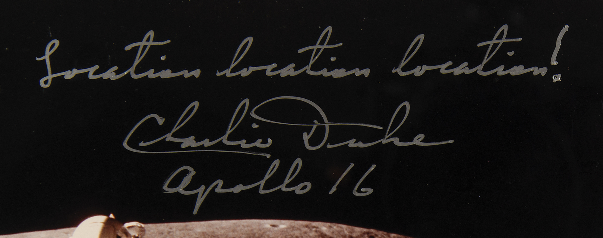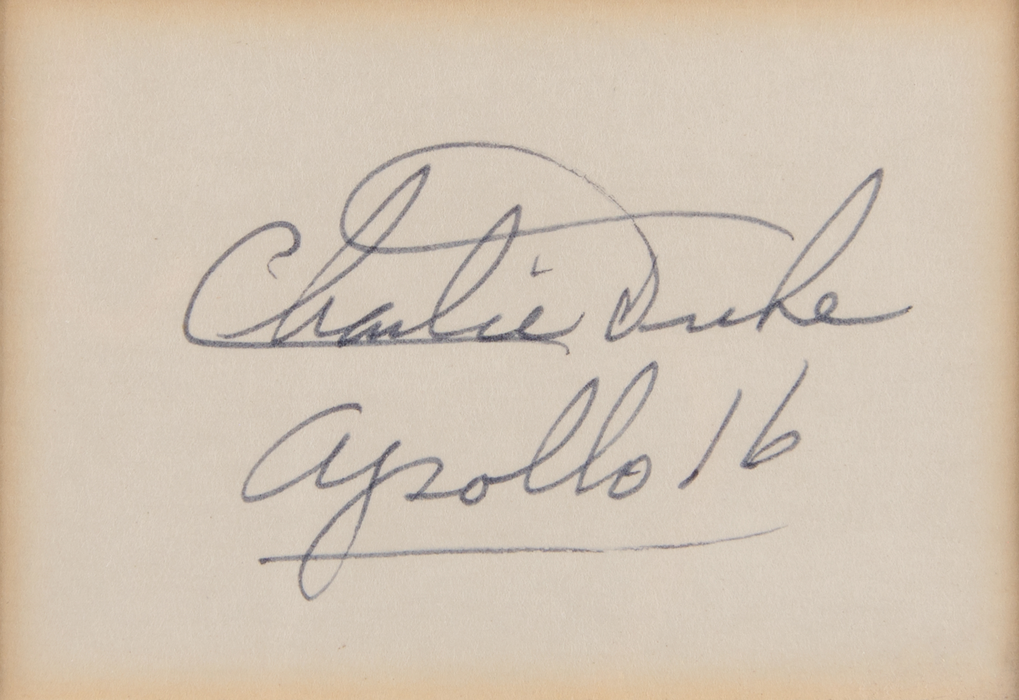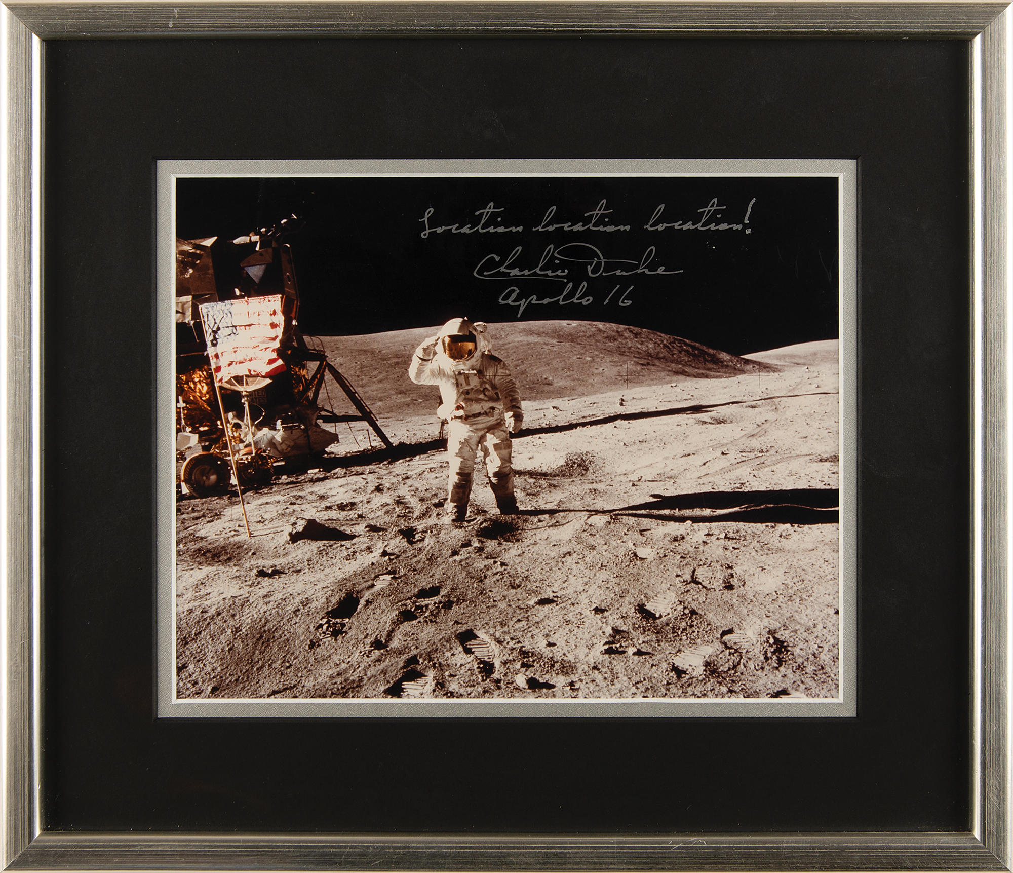 Two items: a color satin-finish 9.25 x 7.5 photo of Duke saluting the American flag on the lunar surface, signed in silver ink, "Location location location! Charlie Duke, Apollo 16," double-matted and framed to an overall size of 14 x 12; and a felt tip signature, "Charlie Duke, Apollo 16," on an off-white card, matted and framed to an overall size of 8 x 10. In overall fine condition, with toning to edges of the signed card.