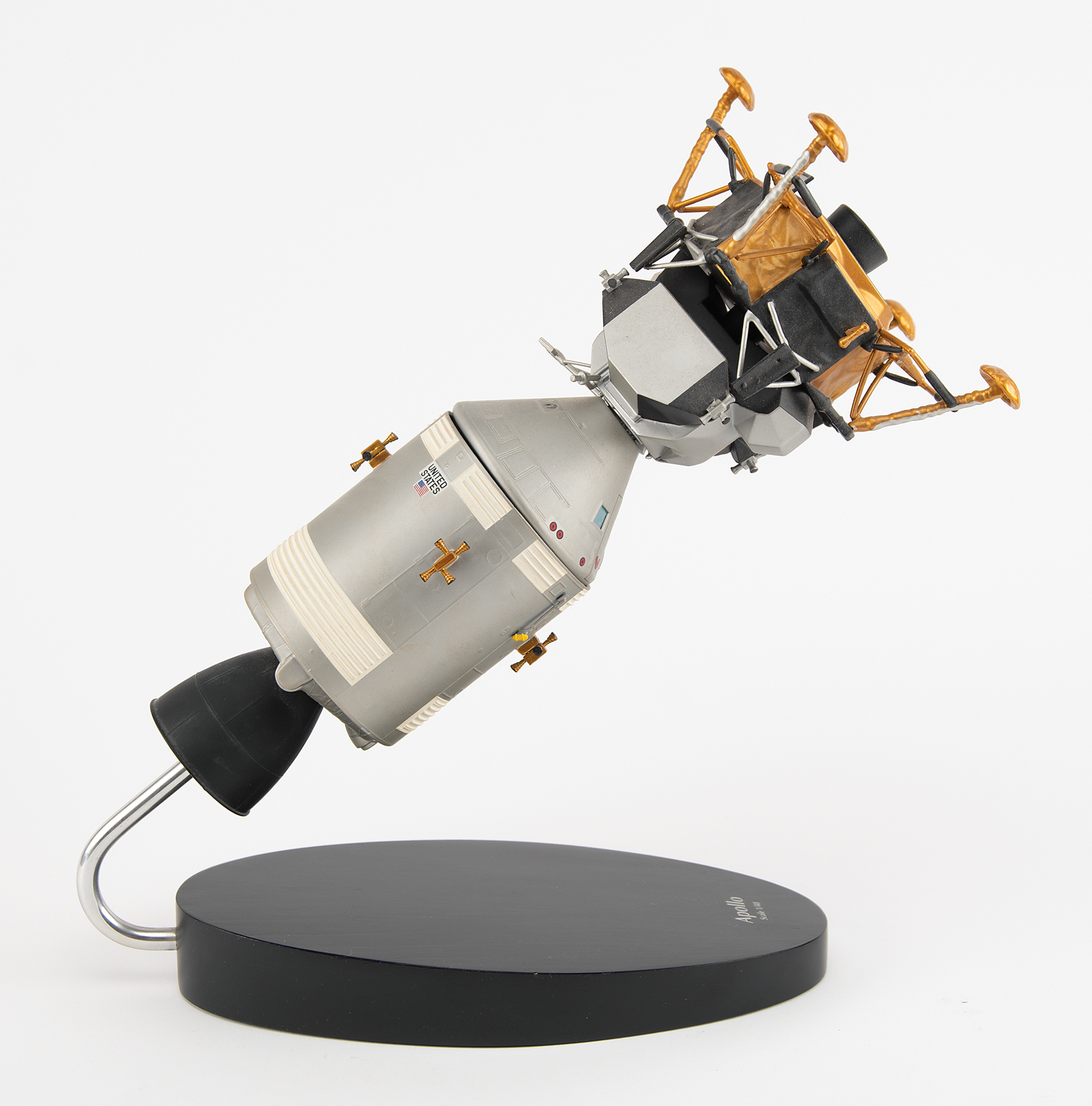 Handsome 1:48 scale model of the Apollo Lunar Module docked with the Command and Service Module, measuring approximately 14˝ x 5.5˝ x 5.5˝, made by in the Philippines by the Toys & Models Corporation. Set upon an oval black base, standing an overall 14.5˝ tall. In fine condition.