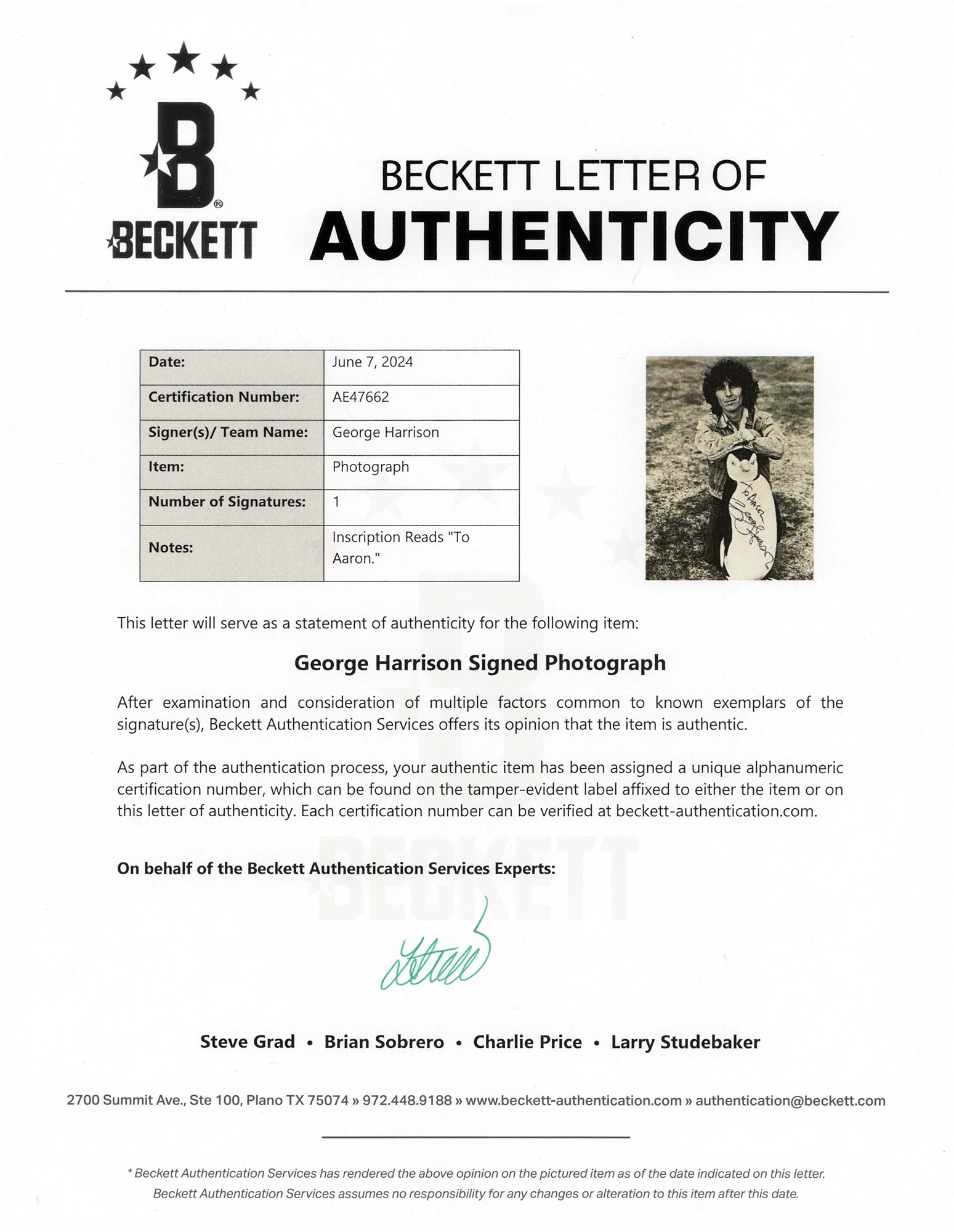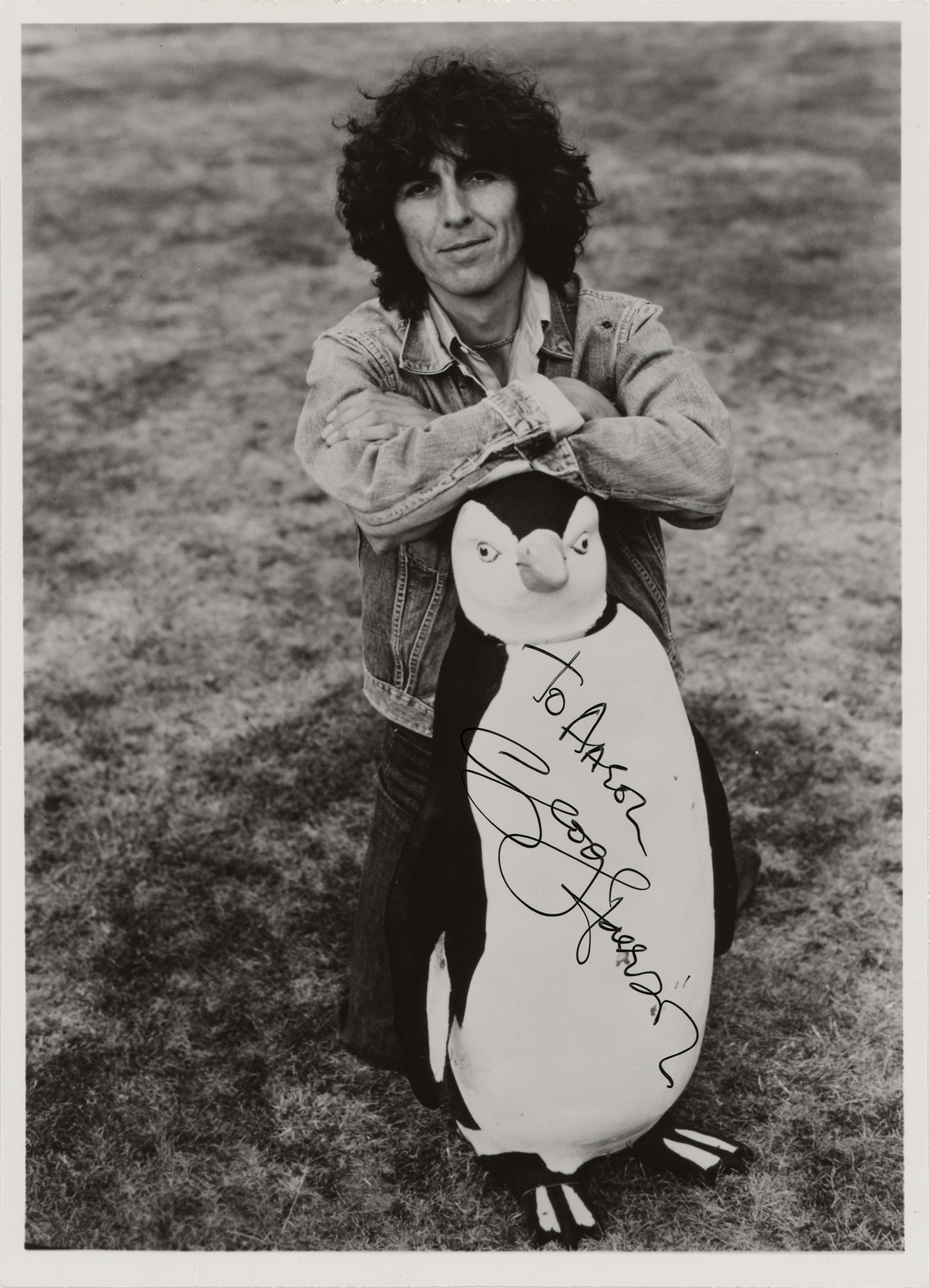 Glossy 7 x 9.75 photo of the Beatles guitarist posing with a large stuffed penguin during his Thirty Three & ⅓ period, boldly signed and inscribed in black ink, "To Aaron, George Harrison." In fine condition, with a Beckett label affixed to the reverse. Accompanied by a full letter of authenticity from Beckett Authentication Services.