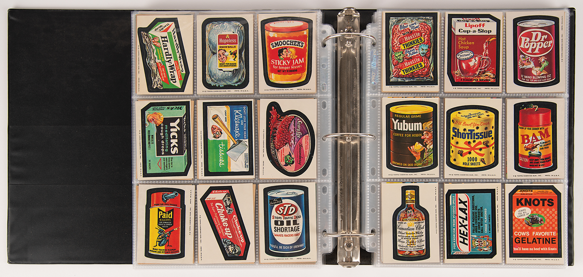 Scarce original set of the legendary first 15 series of Topps Wacky Packages Stickers, produced by the company between 1973 and 1975, each including their 9-card puzzle set. The collection contains a total of 592 stickers and puzzle pieces—457 stickers and 135 checklist puzzle pieces—all of which are housed in a three-ring binder. It includes the short printed Band-Ache, Mutt's, Lavrius and Paul Maul stickers. It is only missing the rare 1976 16th Series set. In overall fine condition.