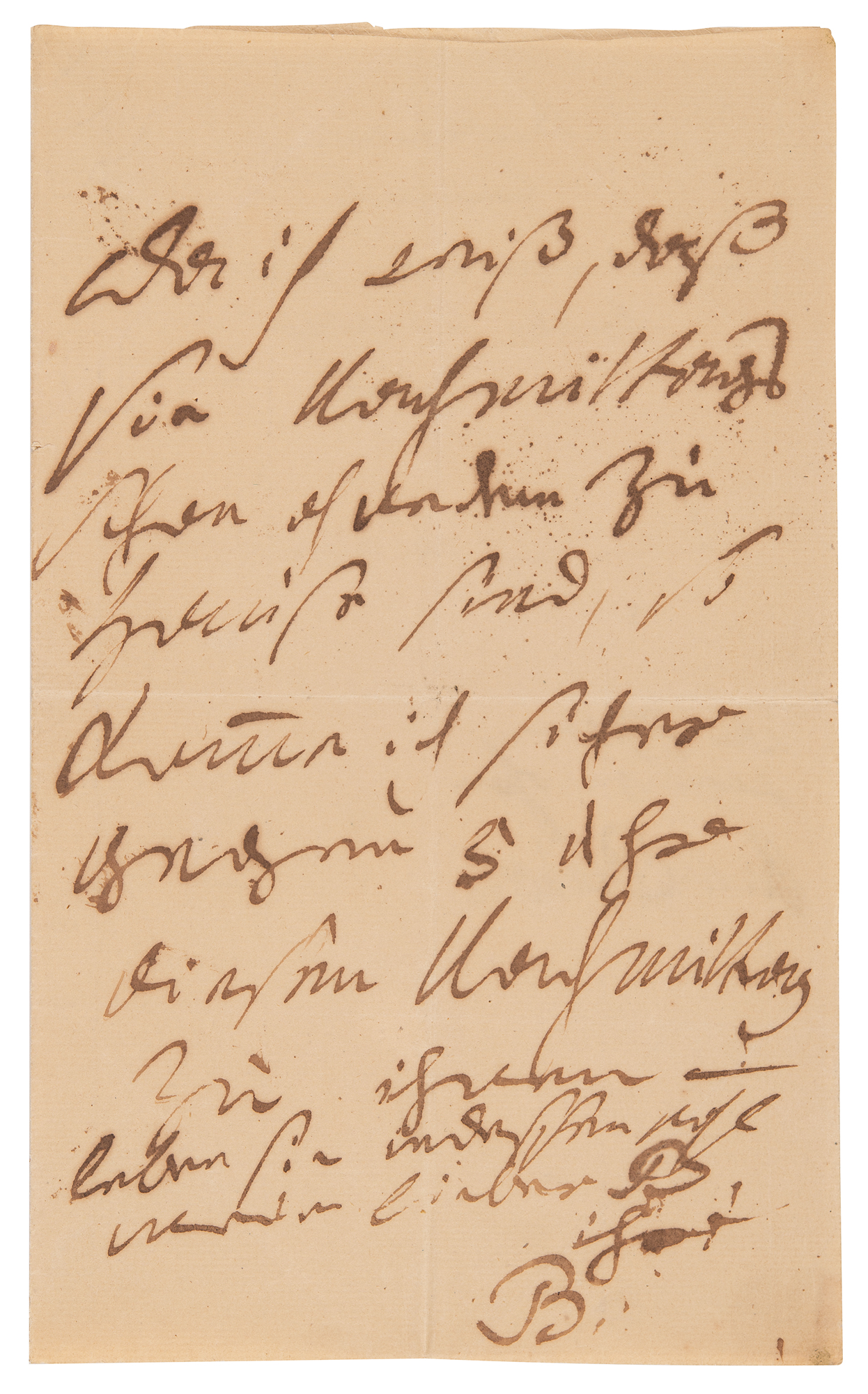 ALS in German, signed “Ihr, B,” one page, 4.75 x 7.75, no date but likely circa 1817–1818. Handwritten letter by Ludwig van Beethoven to the father of child prodigy pianist Leopoldine Blahetka. In full (translated): "As I know that you will be at home in the afternoon anyway, I will definitely come to you around 5 o'clock this afternoon—in the meantime, farewell, my dear B[lahetka]." Addressed on the integral leaf in Beethoven's own hand, "an Seine Wohlgebohrn H: v. Blahetka." In fine condition, with a small area of seal-related paper loss to the adjoining sheet.