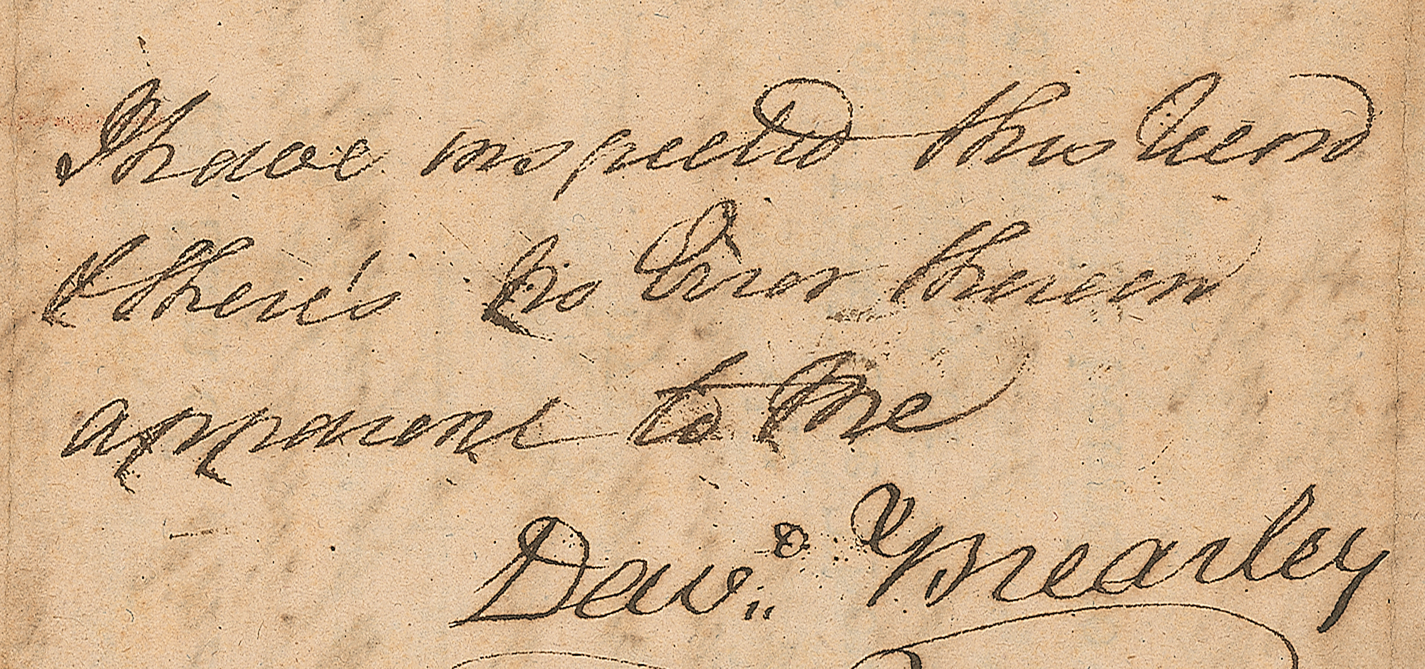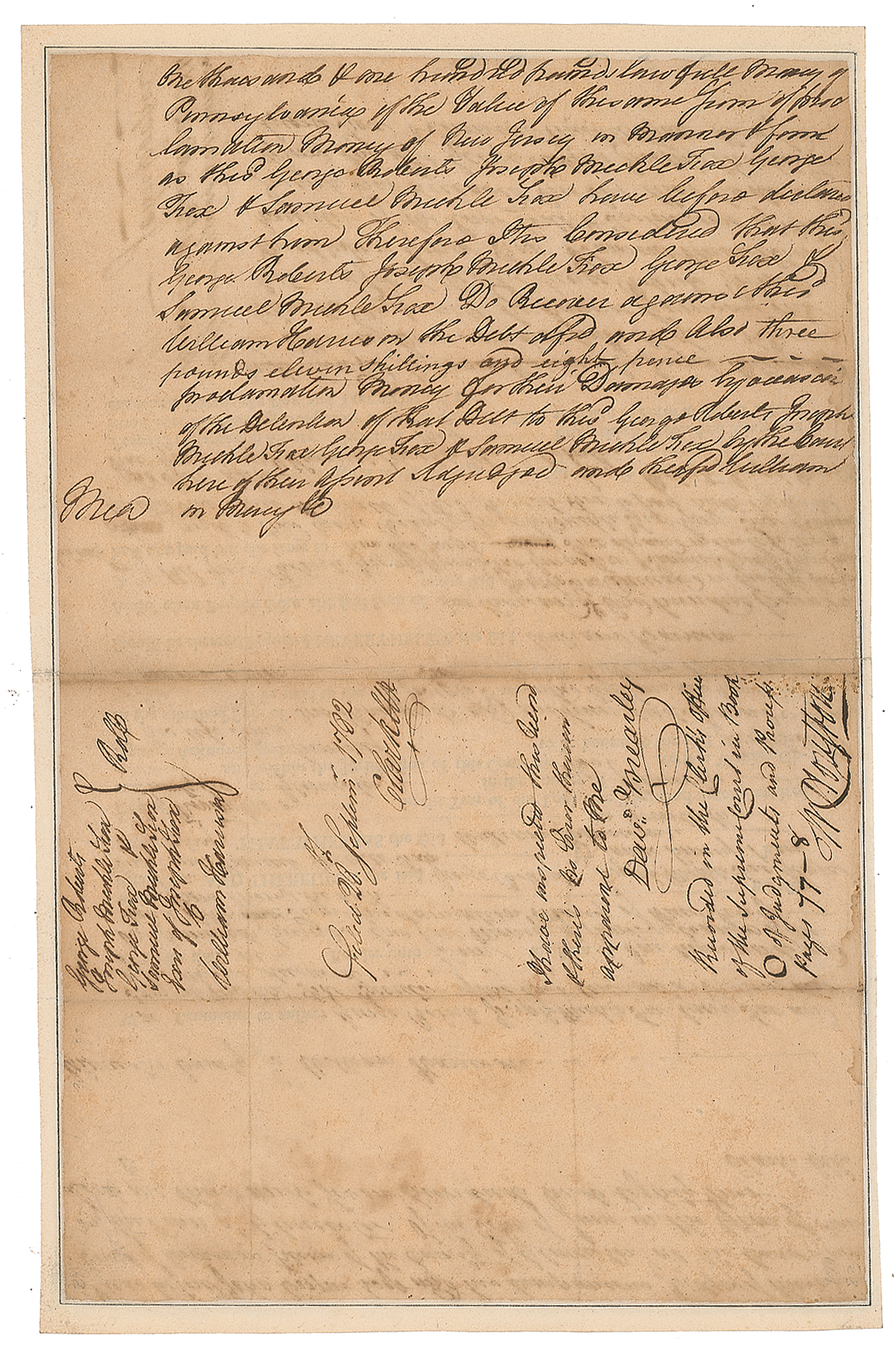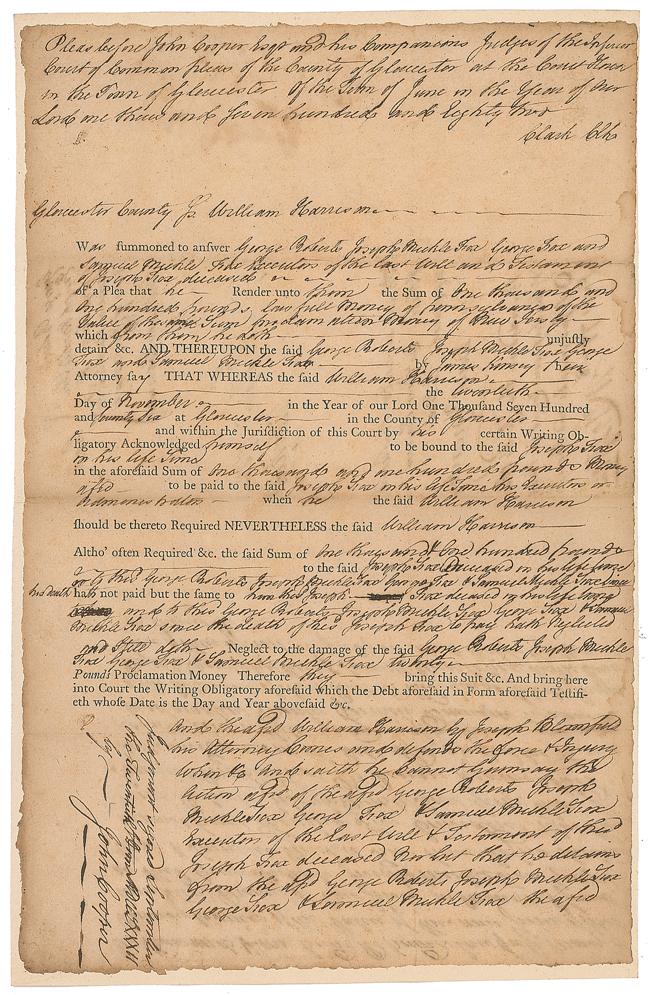 Signer of the US Constitution from New Jersey (1745–1790). Handwritten endorsement signed “Dav'd Brearley,” penned on the reverse of a partly-printed document, one page both sides, 8.25 x 12.75, June 1784, which asserts that a William Harrison pay the executors of Joseph Fox "the Sum of One thousand and one hundred pounds law full money." Brearley's endorsement, in full: "I have inspected this Record & there's no Error therein apparent to me." Professionally inlaid into a slightly larger sheet. In fine condition.