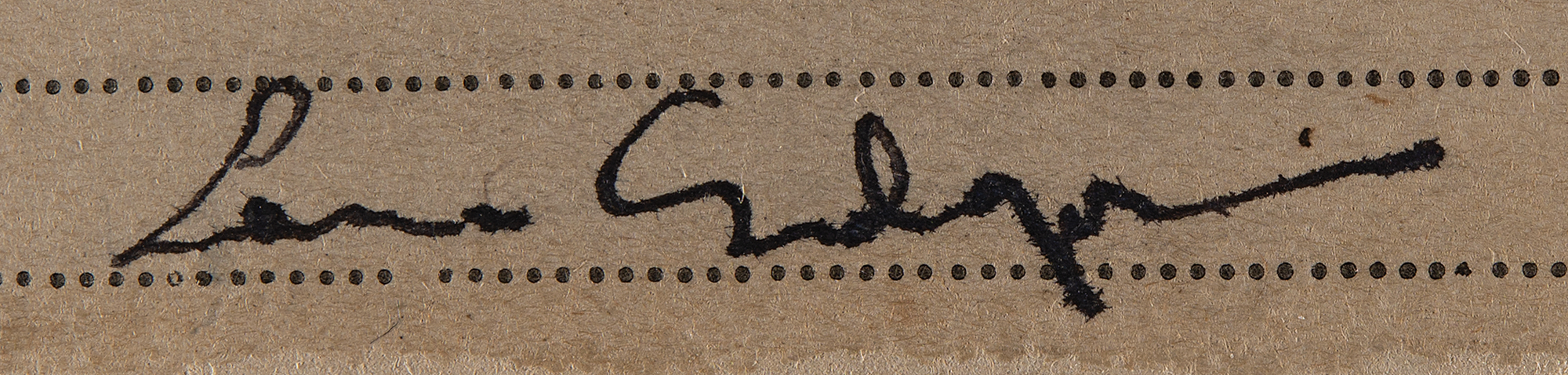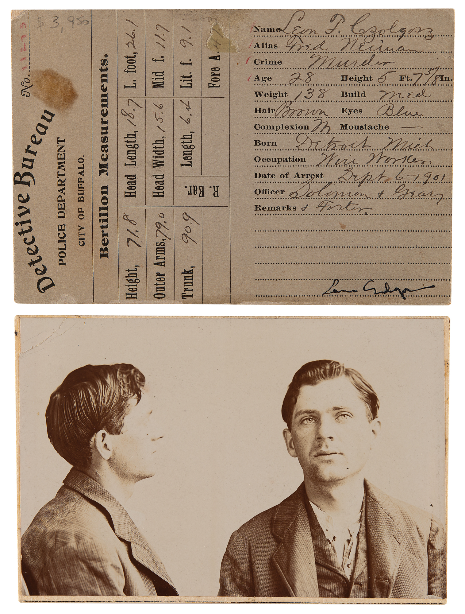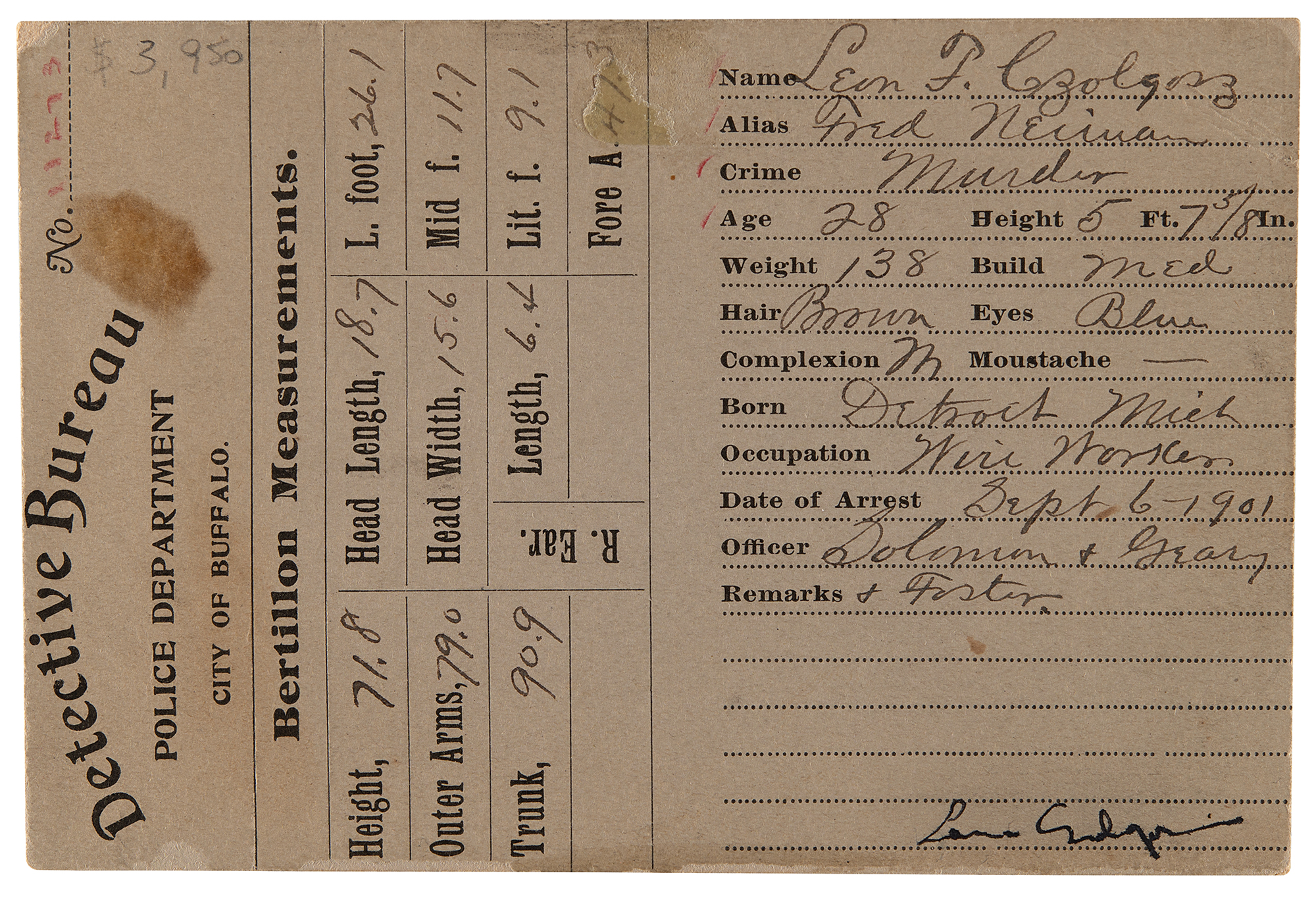 American wireworker and anarchist (1873-1901) who shot President William McKinley on September 6, 1901, in Buffalo, New York. McKinley died on September 14 after his wound became infected. Caught in the act, Czolgosz was tried, convicted, and executed by the State of New York seven weeks later on October 29, 1901. Partly-printed document, one page, 4.75 x 3.25, no date [late September-early October 1901]. Detective Bureau identification card from the Police Department of Buffalo, New York, No. 11273, containing the Bertillon measurements, physical traits, and personal details of Leon Czolgosz, the convicted assassin of President William McKinley. The right side is filled out in a clerical hand and lists fields like name (“Leon F. Czolgosz”), alias (“Fred Nieman”), age (“28”), crime (“murder”), and date of arrest (“Sept. 6, 1901”). The lower right corner bears what may be an original black ink signature of McKinley's assassin, although this cannot be authenticated due to a lack of accepted comparables. In fine condition, with a few small stains. Accompanied by a period glossy 4.75 x 3 mugshot photo of Czolgosz after his arrest.