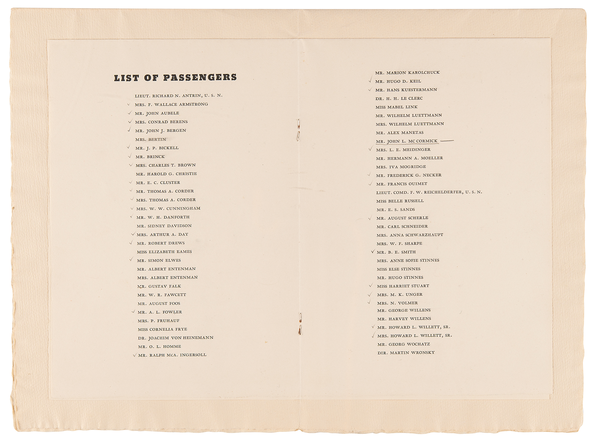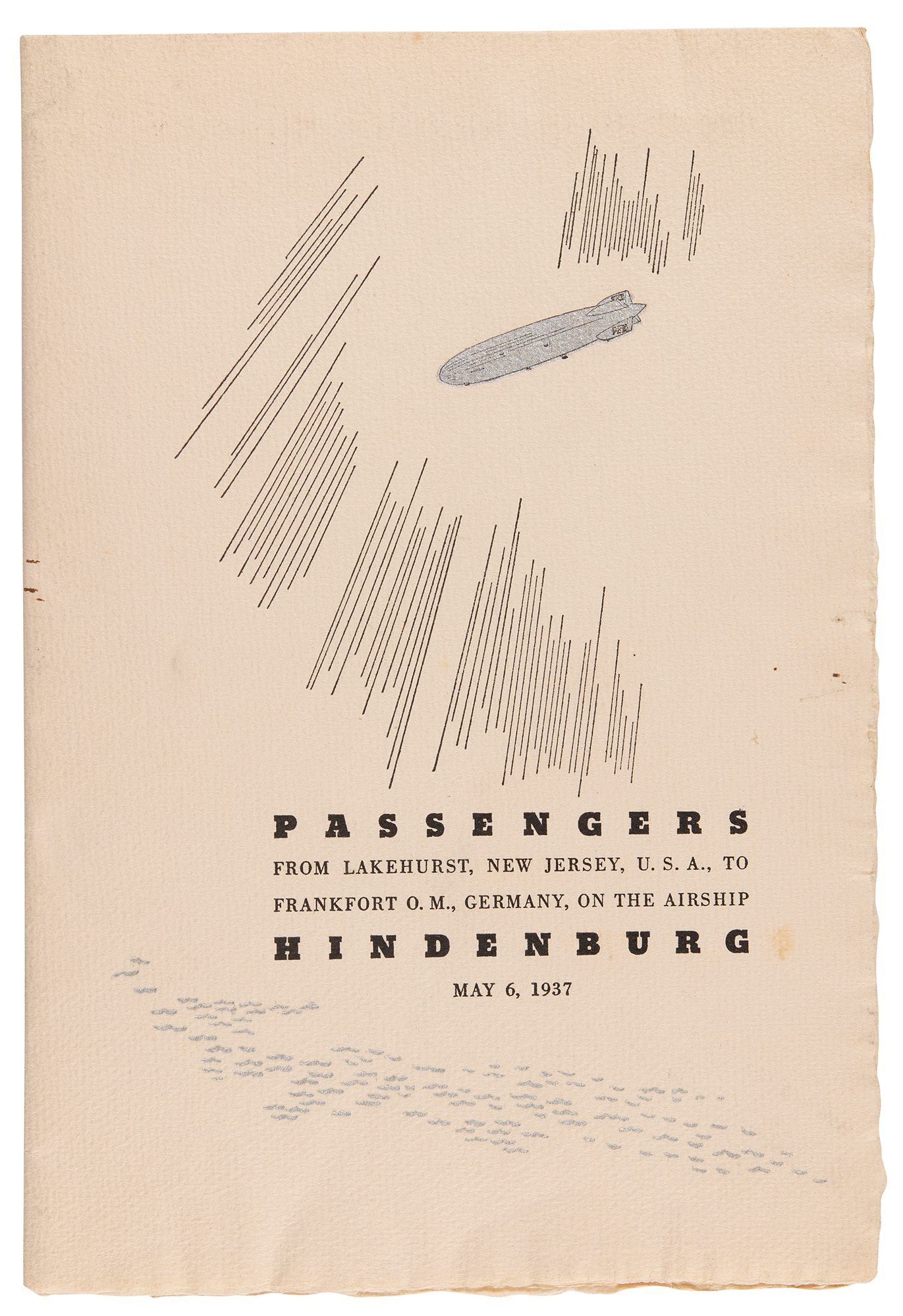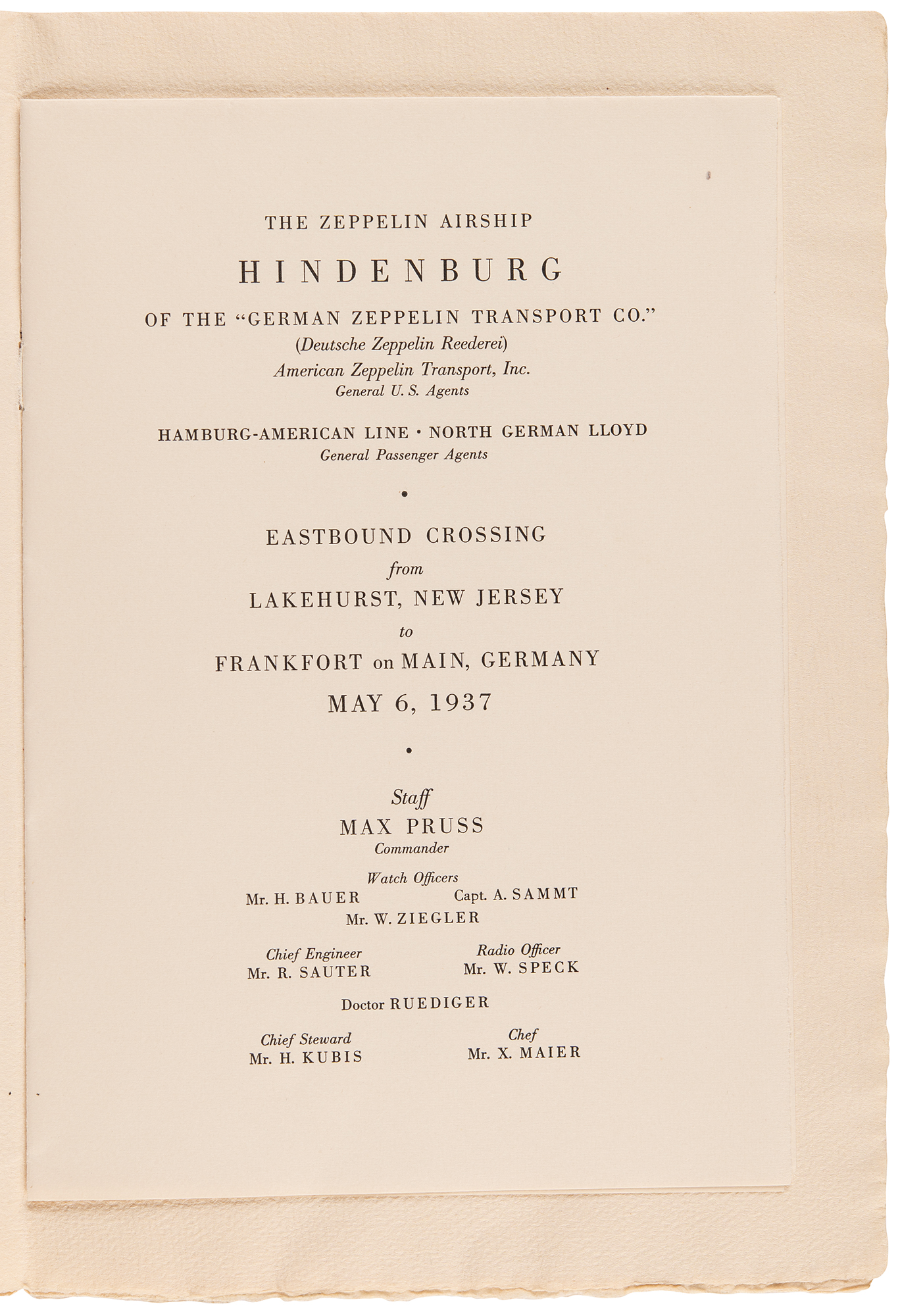 Remarkable original ‘passenger’ program for the Zeppelin airship Hindenburg for its scheduled ‘eastbound crossing’ flight from Lakehurst, New Jersey, to Frankfurt, Germany, on May 6, 1937. The program, three pages, 6.5 x 9.75, contains a fully booked list of the 65 passengers that had purchased tickets to fly back to Germany, many being celebrities, dignitaries, and other notables eager to return to Europe to attend the coronation of Britain's King George VI, which occurred on May 12, 1937. The title page features the names of several crew members, including Commander Max Pruss, with the upper portion reading: “The Zeppelin Airship, Hindenburg, of the ‘German Zeppelin Transport Co.’ / (Deutsche Zeppelin Reederei) / American Zeppelin Transport, Inc. / General U. S. Agents / Hamburg-American Line, North German Lloyd / General Passenger Agents / Eastbound Crossing From Lakehurst, New Jersey to Frankfort on Main, Germany, May 6, 1937.” The front cover features an image of a silver Zeppelin airship soaring high above the Atlantic Ocean, with cover text: “Passengers, from Lakehurst, New Jersey, U.S.A. to Frankfort O.M., Germany, on the Airship Hindenburg, May 6, 1937.” In fine condition. A rare printed artifact for the unrealized return flight of the Hindenburg.