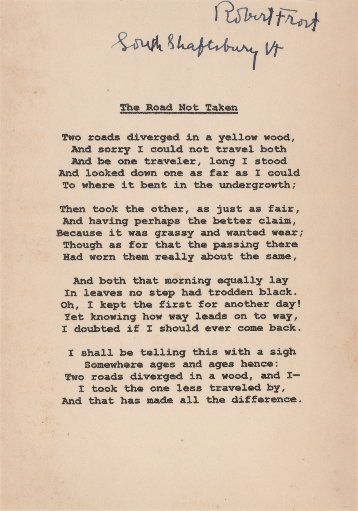 Fountain pen signature, "Robert Frost, South Shaftsbury, VT,” on an off-white 5 x 7 sheet imprinted with the text of his poem 'The Road Not Taken.' In fine condition.