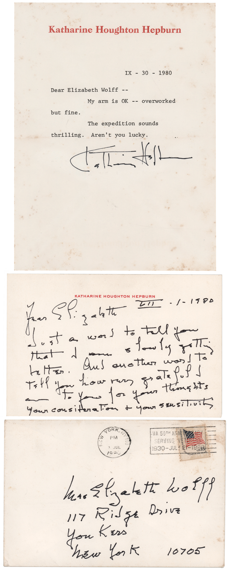 Two letters from Katharine Hepburn, both sent to Elizabeth Wolff, which include: an ALS, one page, both sides, 6.25 x 4.25, personal stationery card, July 1, 1980, the handwritten letter reads: “Just a word to tell you that I am slowly getting better. And another word to tell you how very grateful I am to you for your thoughts, your consideration + your sensitivity on my behalf. It made my hospital stay so much more comfortable than it might have been to have your loving care. Thank you from the bottom of my heart + if I can ever be of help to you let me know”; and a TLS, one page, 6 x 8, personal letterhead, September 30, 1980: “My arm is OK – overworked but fine. The expedition sounds thrilling. Aren’t you lucky.” In overall fine condition, with scattered light foxing to the typed letter, and a few small blots to the handwritten letter. Accompanied by the original mailing envelope for the July letter, which is addressed in Hepburn’s hand.