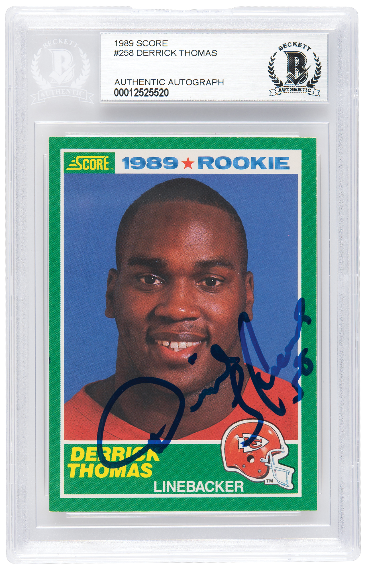1989 Score #258 rookie card of legendary Kansas City Chiefs linebacker Derrick Thomas, signed in blue felt tip, "Derrick Thomas, 58." In very fine condition. Encapsulated by Beckett Authentication Services.
