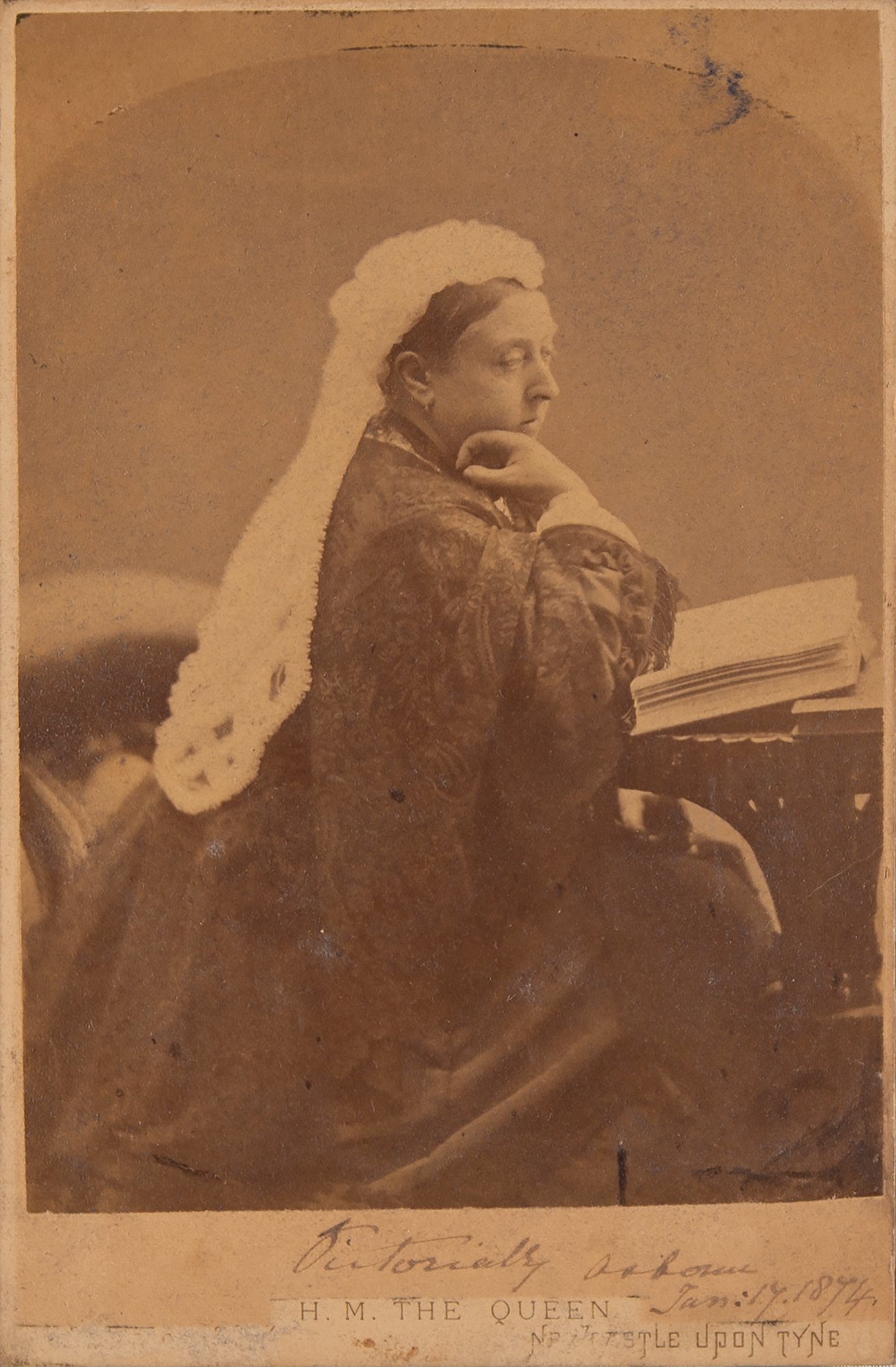 Outstanding 4.25 x 6.5 cabinet photo of Queen Victoria in a thoughtful, solemn pose, signed on the mount in ink, "Victoria R, Osborne, Jan: 17, 1874." Affixed to a silk moire backing within a unique 6 x 7.5 leather presentation frame, with an ornate "V.R." cast metal device at the top. In very good to fine condition, with light irregular toning, faint silvering, and wear to the original presentation frame.
