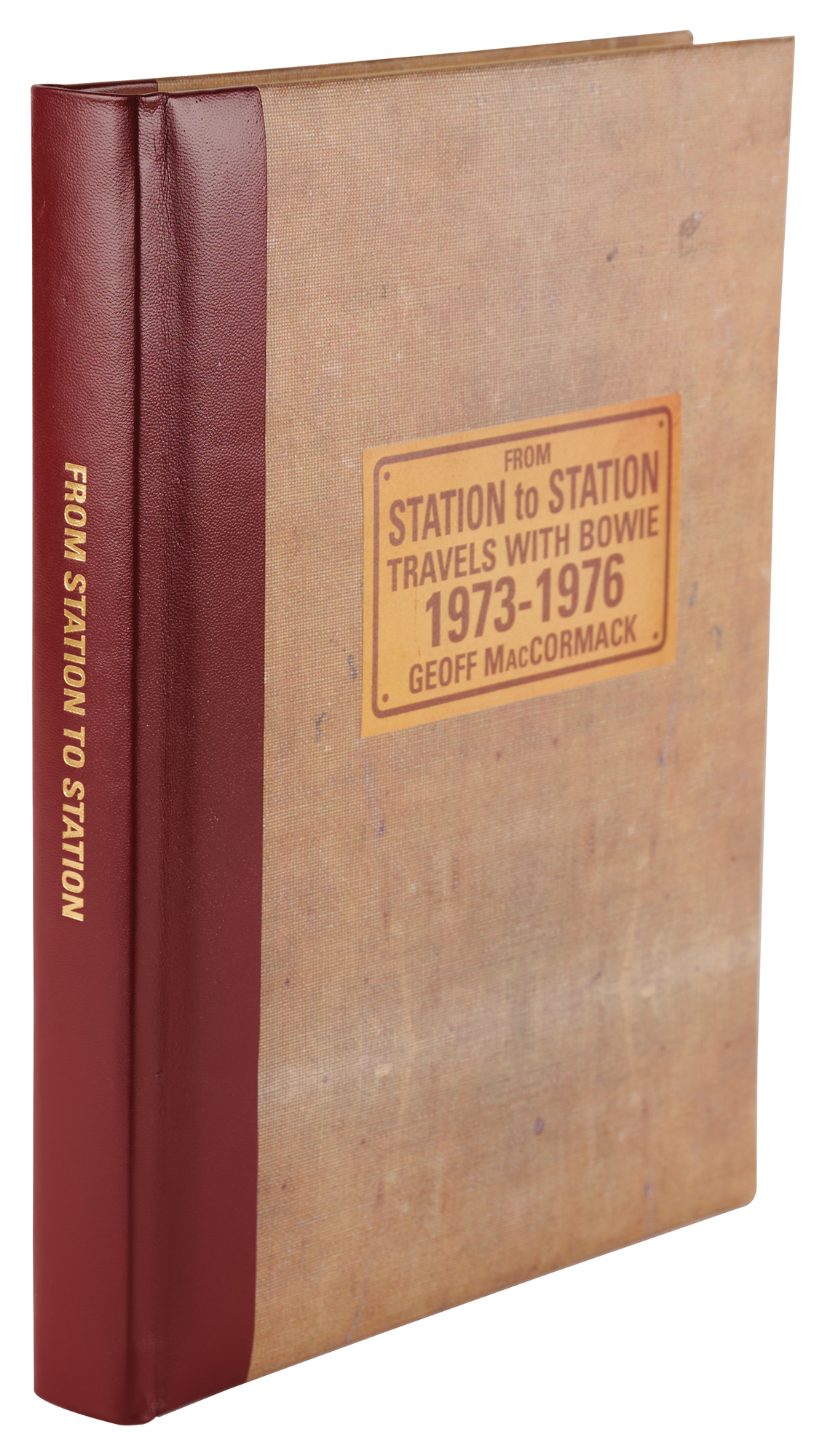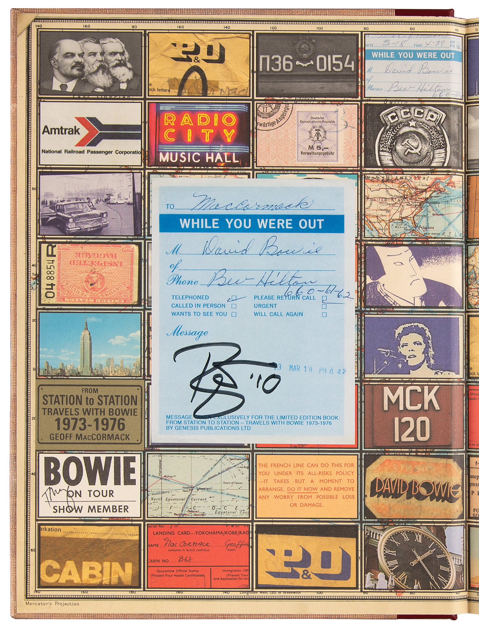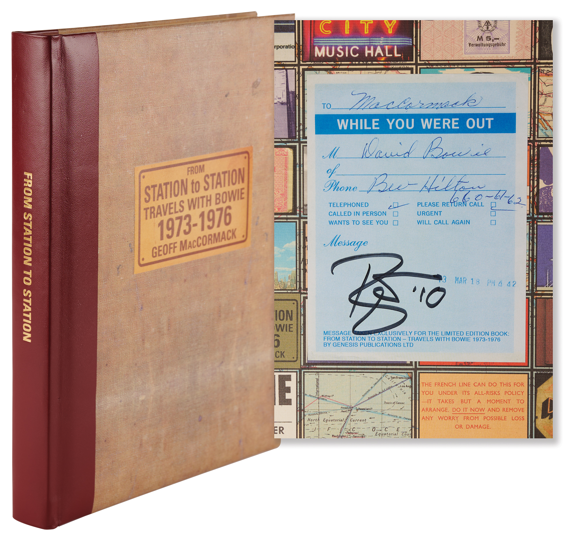 Signed book: From Station to Station: Travels with Bowie, 1973–1976, by Geoff MacCormack. First edition, limited issue, numbered 1838/2000. England: Genesis Publications, 2007. Hardcover with clamshell case, 10 x 13, 200 pages. Signed in black felt tip by David Bowie on a special 'While You Were Out' plate affixed to the front pastedown, and signed on the colophon in black felt tip by Geoff MacCormack. Complete with its drawstring bag. In very fine condition.