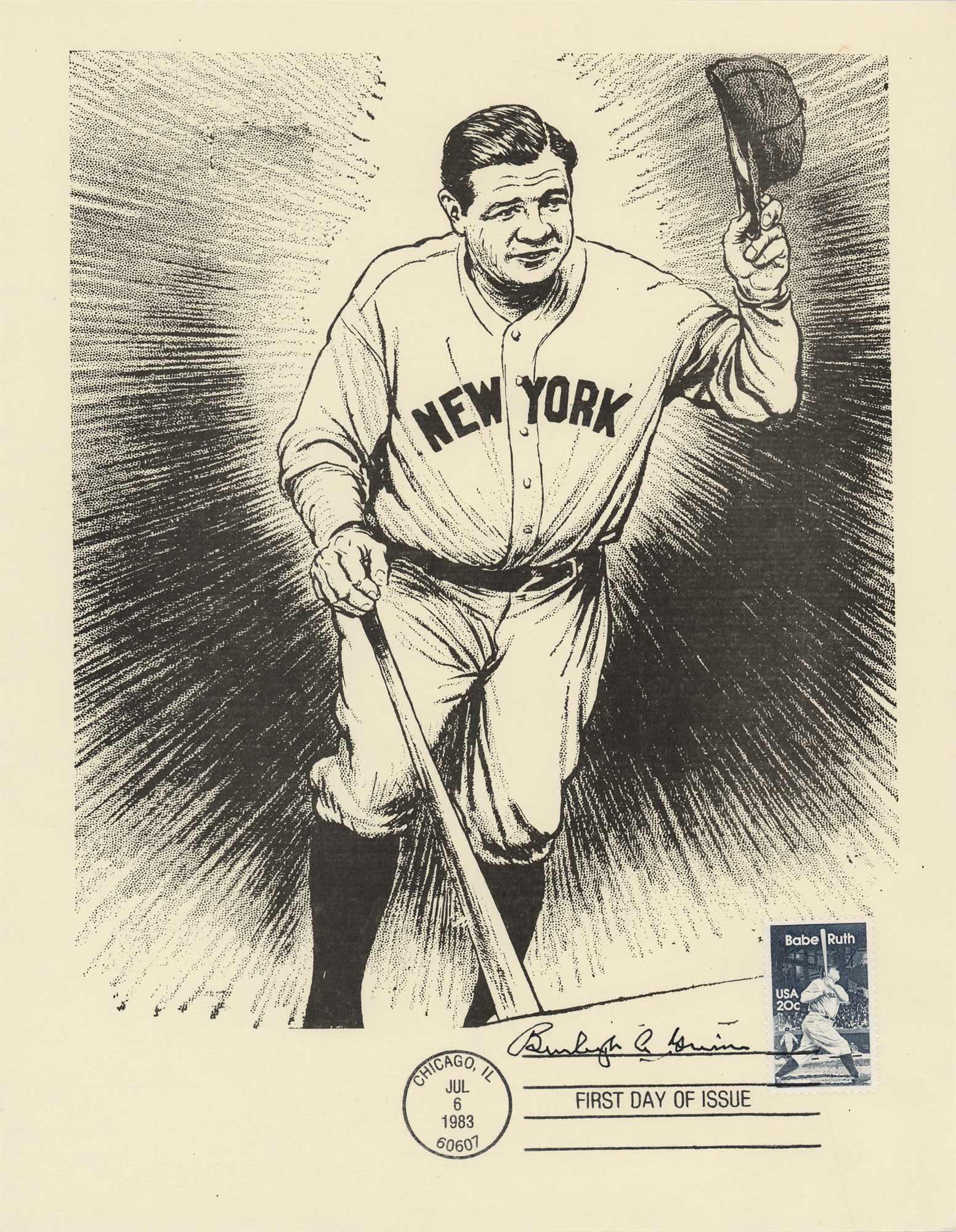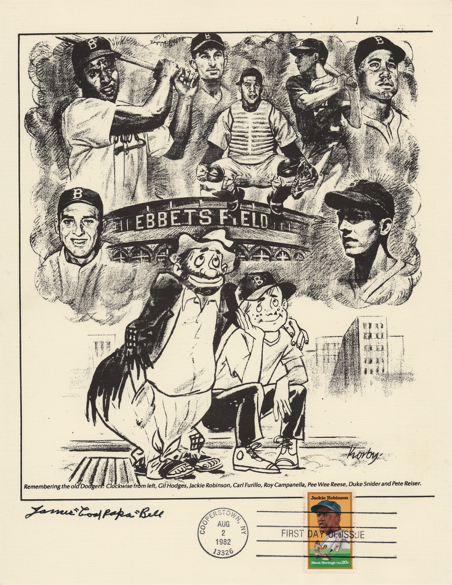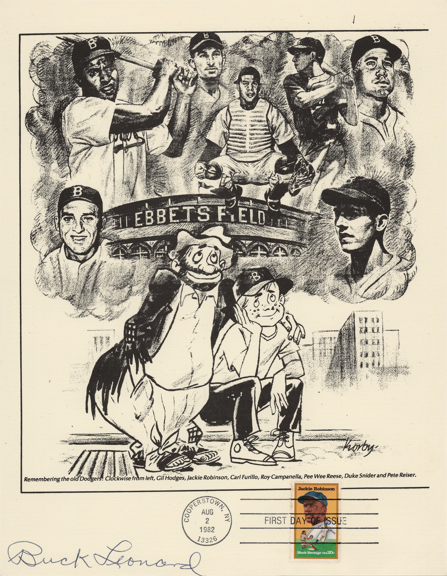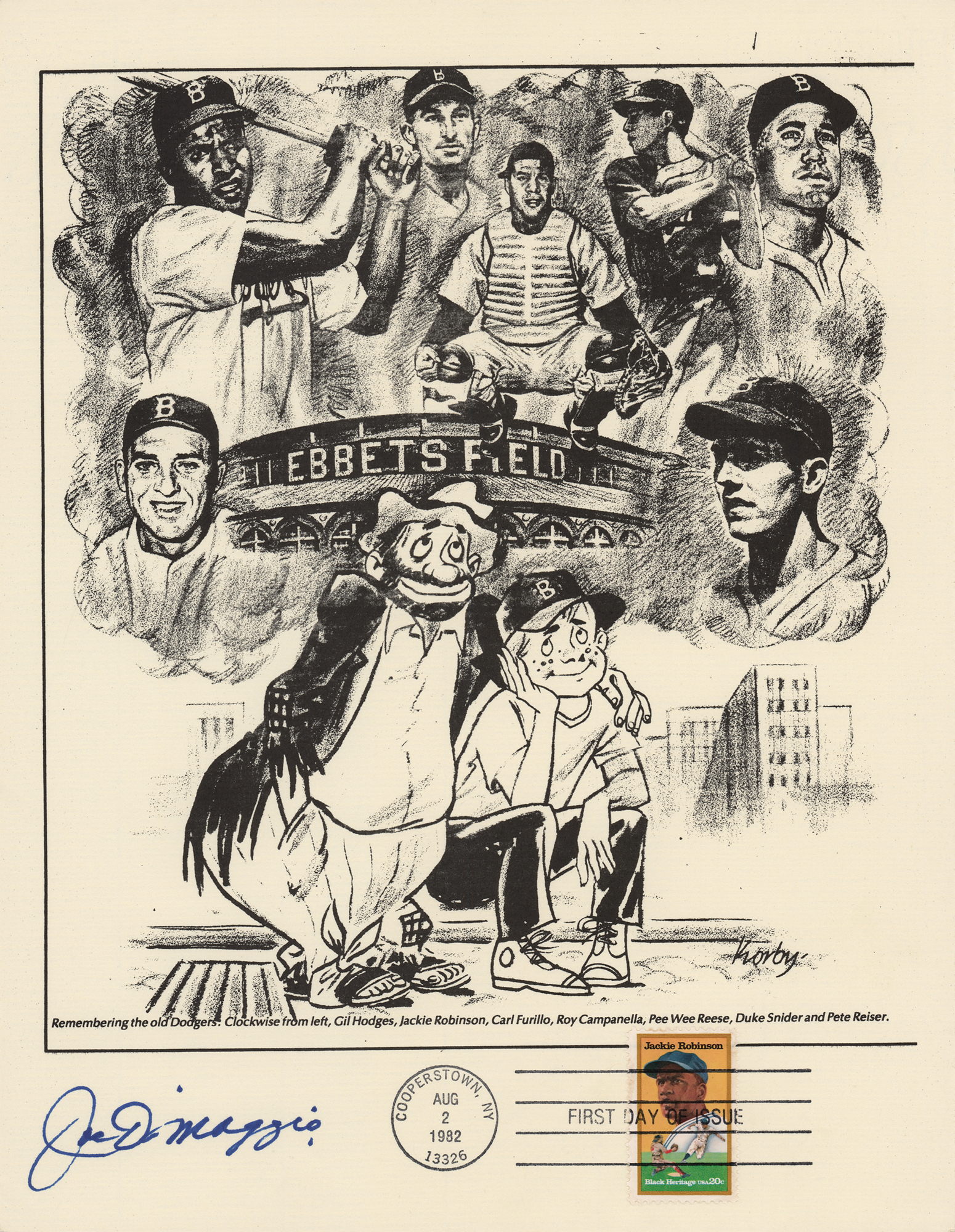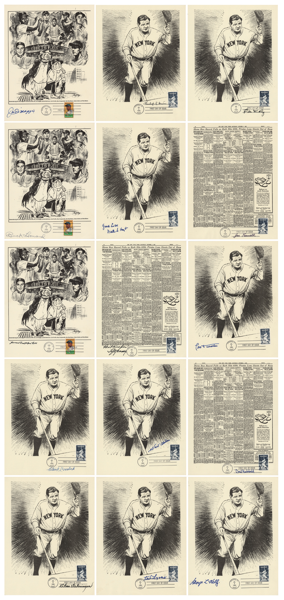 Group of 15 commemorative 8.5 x 11 prints honoring Babe Ruth and Ebbets Field, all carrying affixed postage stamps with first day cancellations, each signed in ink by a Hall of Famer. Signers are: Joe DiMaggio, George L. Kelly, Ted Lyons, Charlie Gehringer, Carl Hubbell, Walter Alston, Stanley Coveleski, Leo Durocher, Lefty Gomez, James 'Cool Papa' Bell, Joe Sewell, Waite Hoyt, Buck Leonard, Bill Dickey, and Burleigh Grimes. In fine condition. Also accompanied by a glossy 10 x 8 photo of Bobby Thomson celebrating his 'Shot Heard Round the World,' signed in blue felt tip by the New York Giants outfielder.