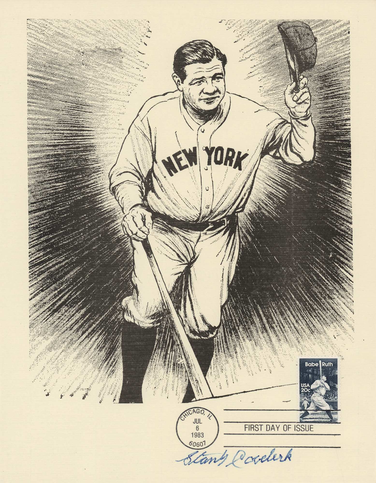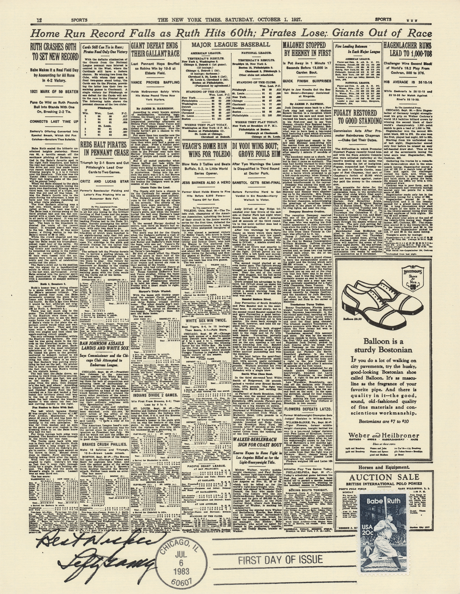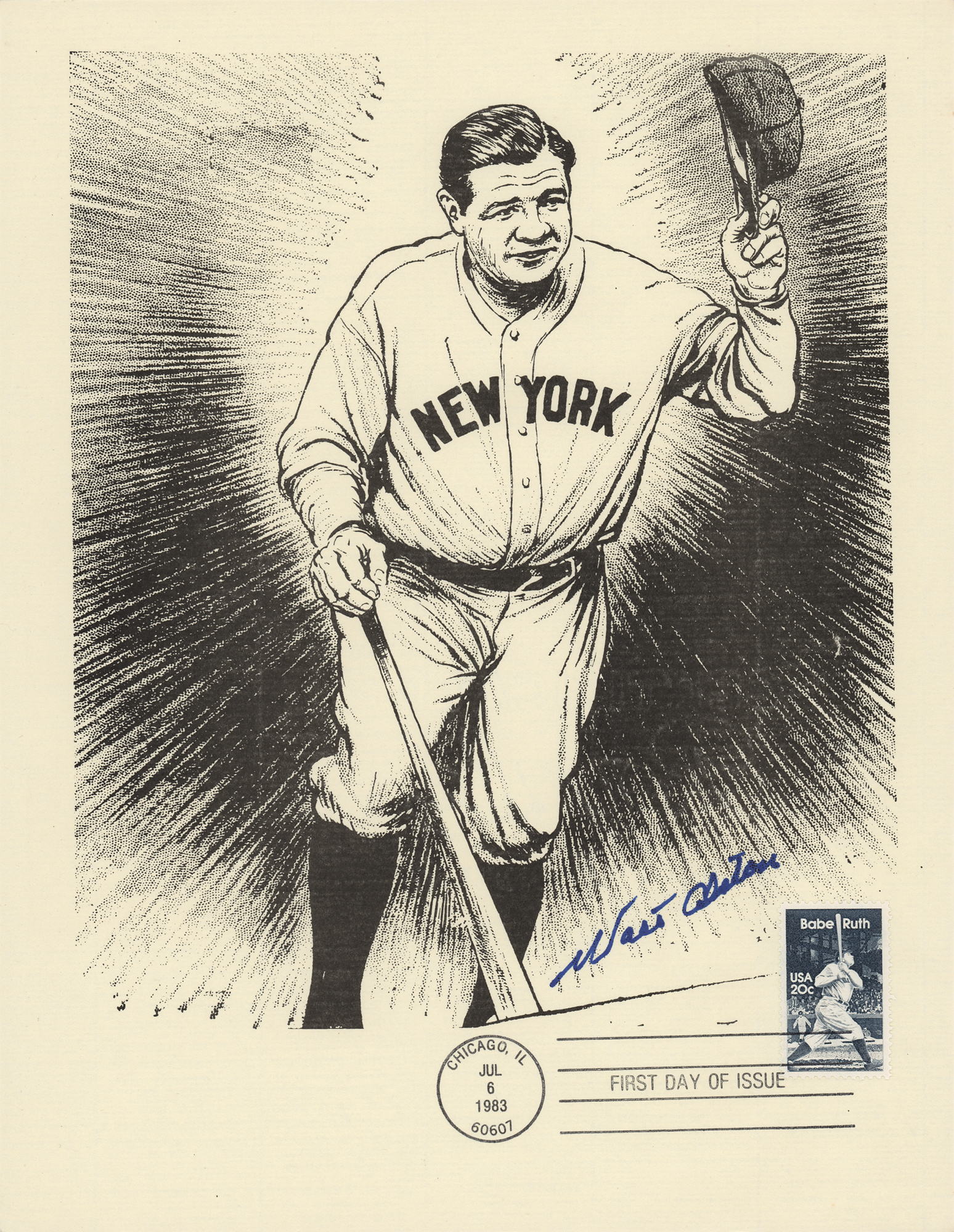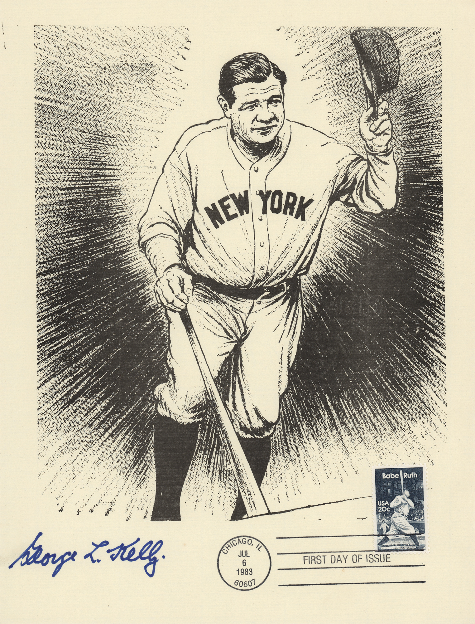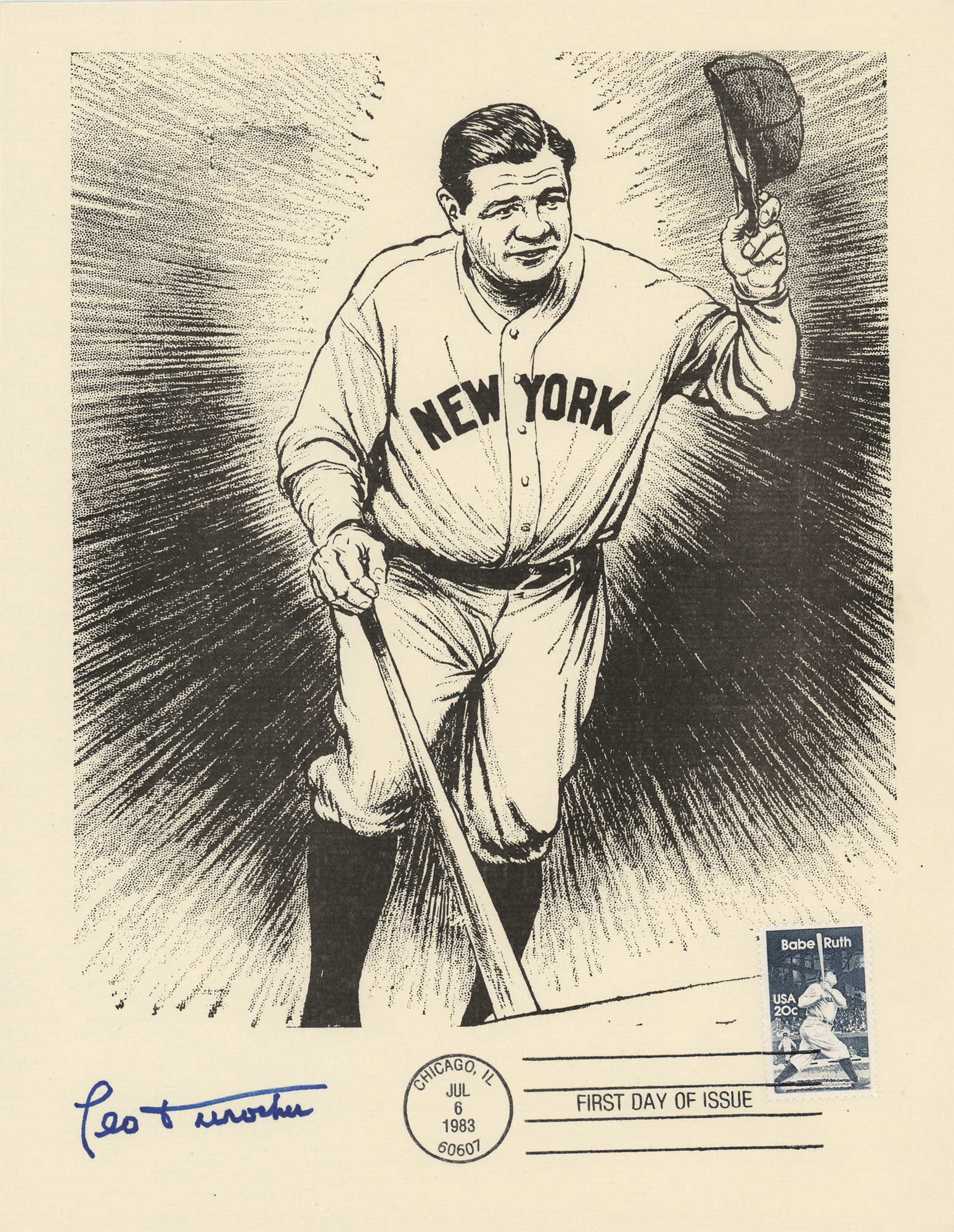 Group of 15 commemorative 8.5 x 11 prints honoring Babe Ruth and Ebbets Field, all carrying affixed postage stamps with first day cancellations, each signed in ink by a Hall of Famer. Signers are: Joe DiMaggio, George L. Kelly, Ted Lyons, Charlie Gehringer, Carl Hubbell, Walter Alston, Stanley Coveleski, Leo Durocher, Lefty Gomez, James 'Cool Papa' Bell, Joe Sewell, Waite Hoyt, Buck Leonard, Bill Dickey, and Burleigh Grimes. In fine condition. Also accompanied by a glossy 10 x 8 photo of Bobby Thomson celebrating his 'Shot Heard Round the World,' signed in blue felt tip by the New York Giants outfielder.