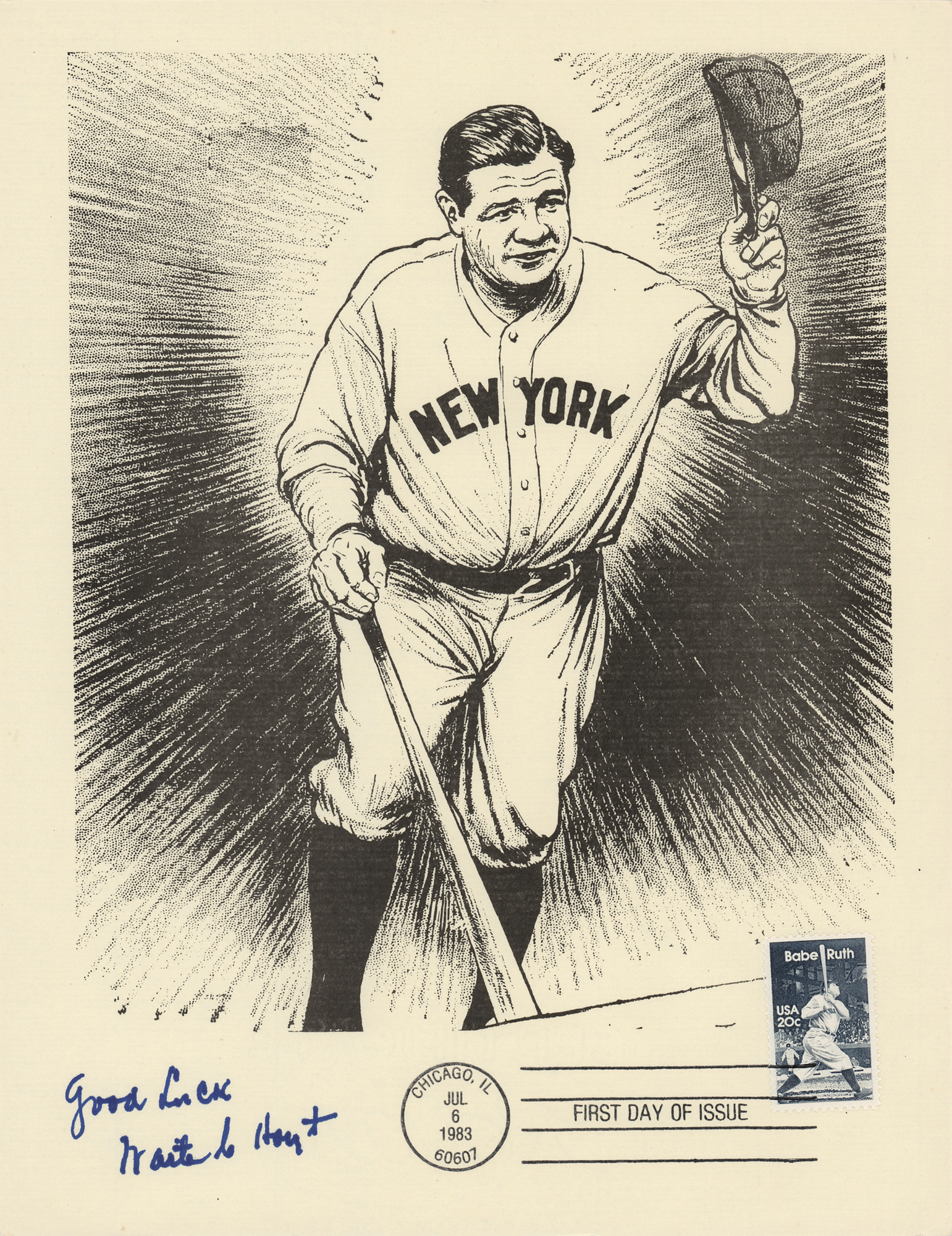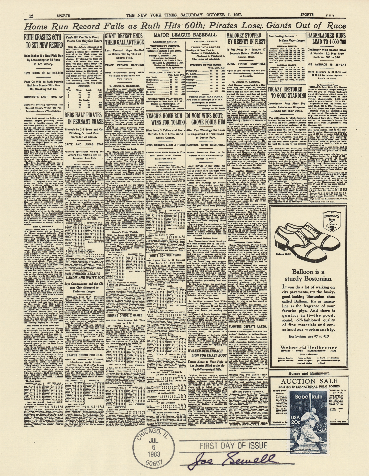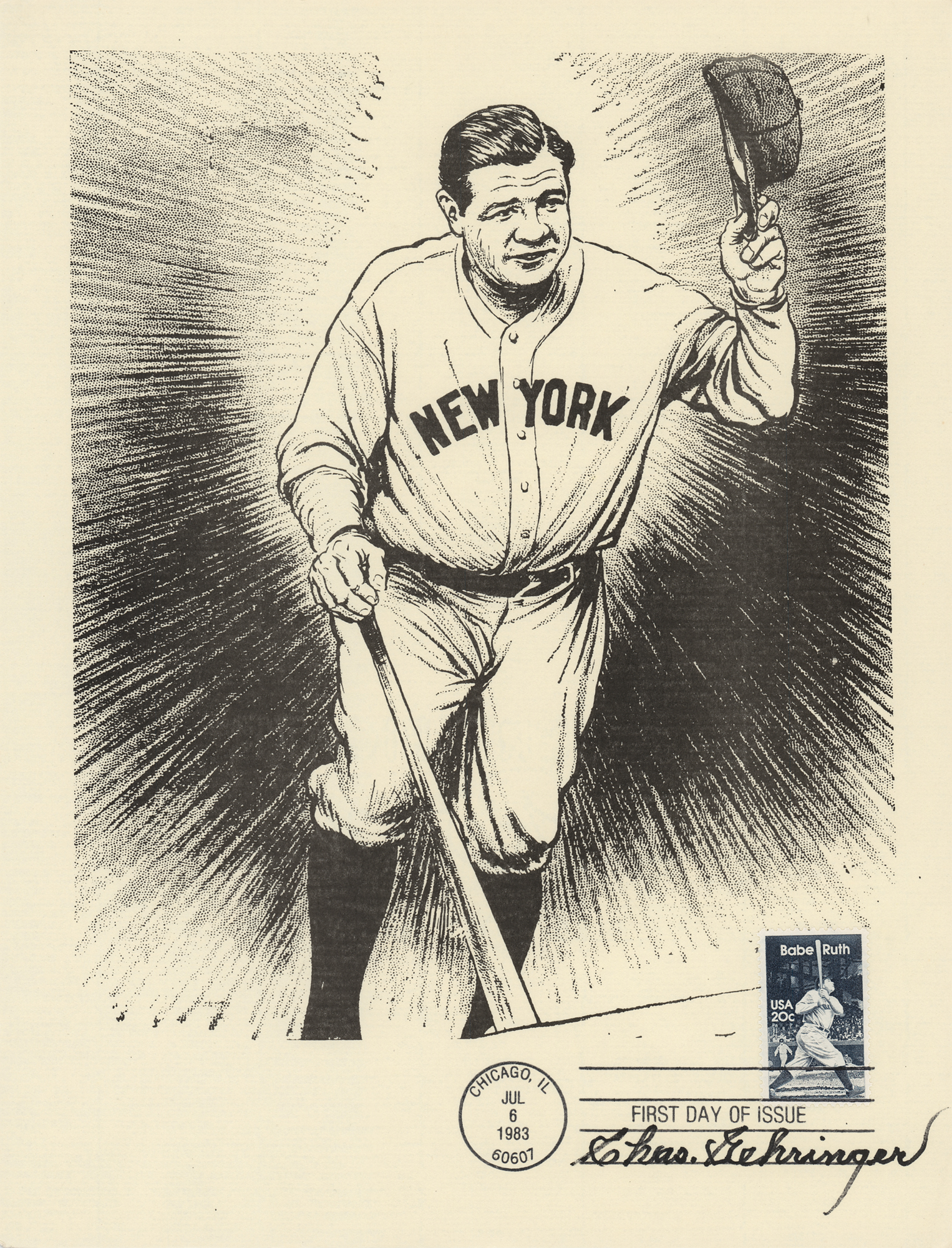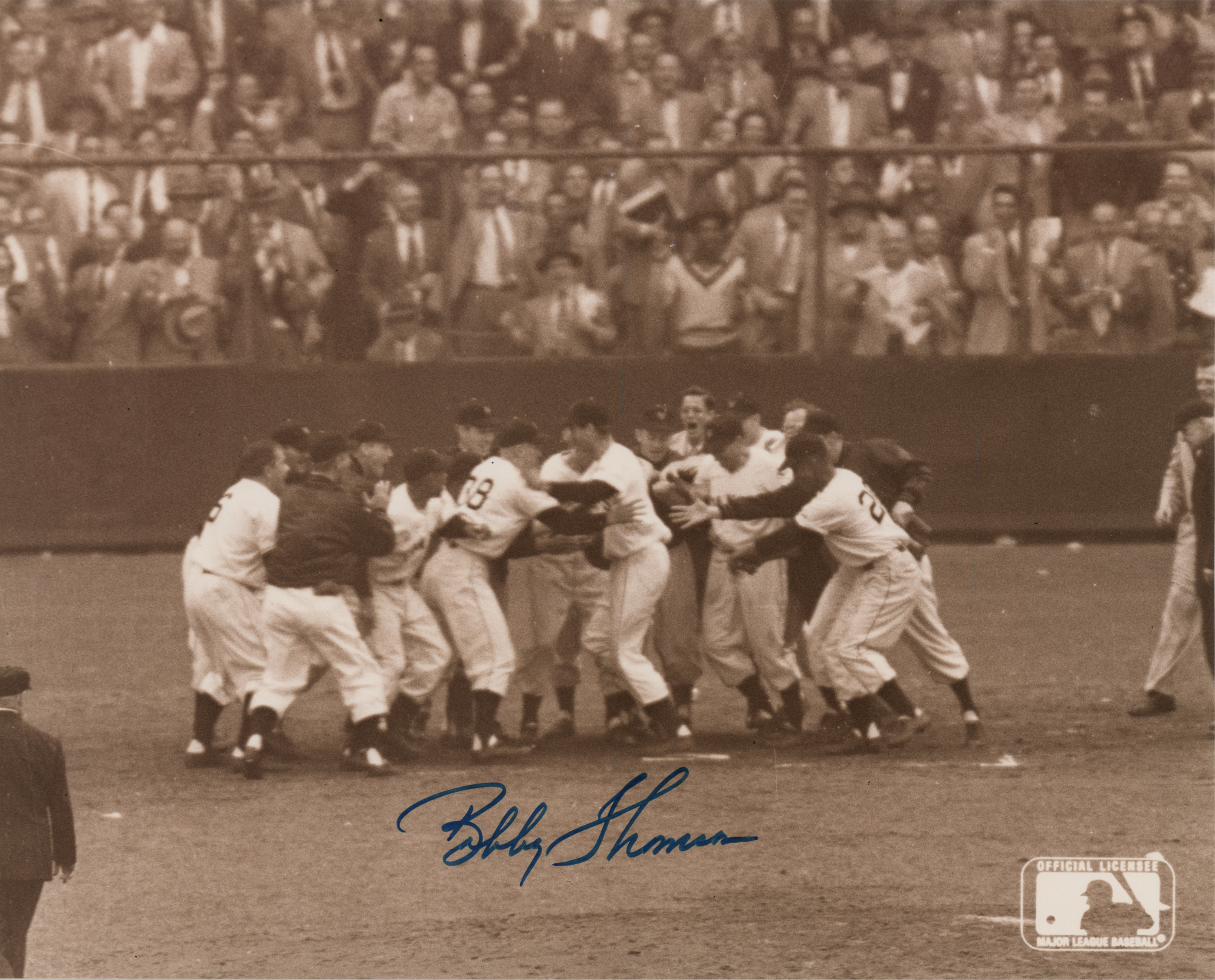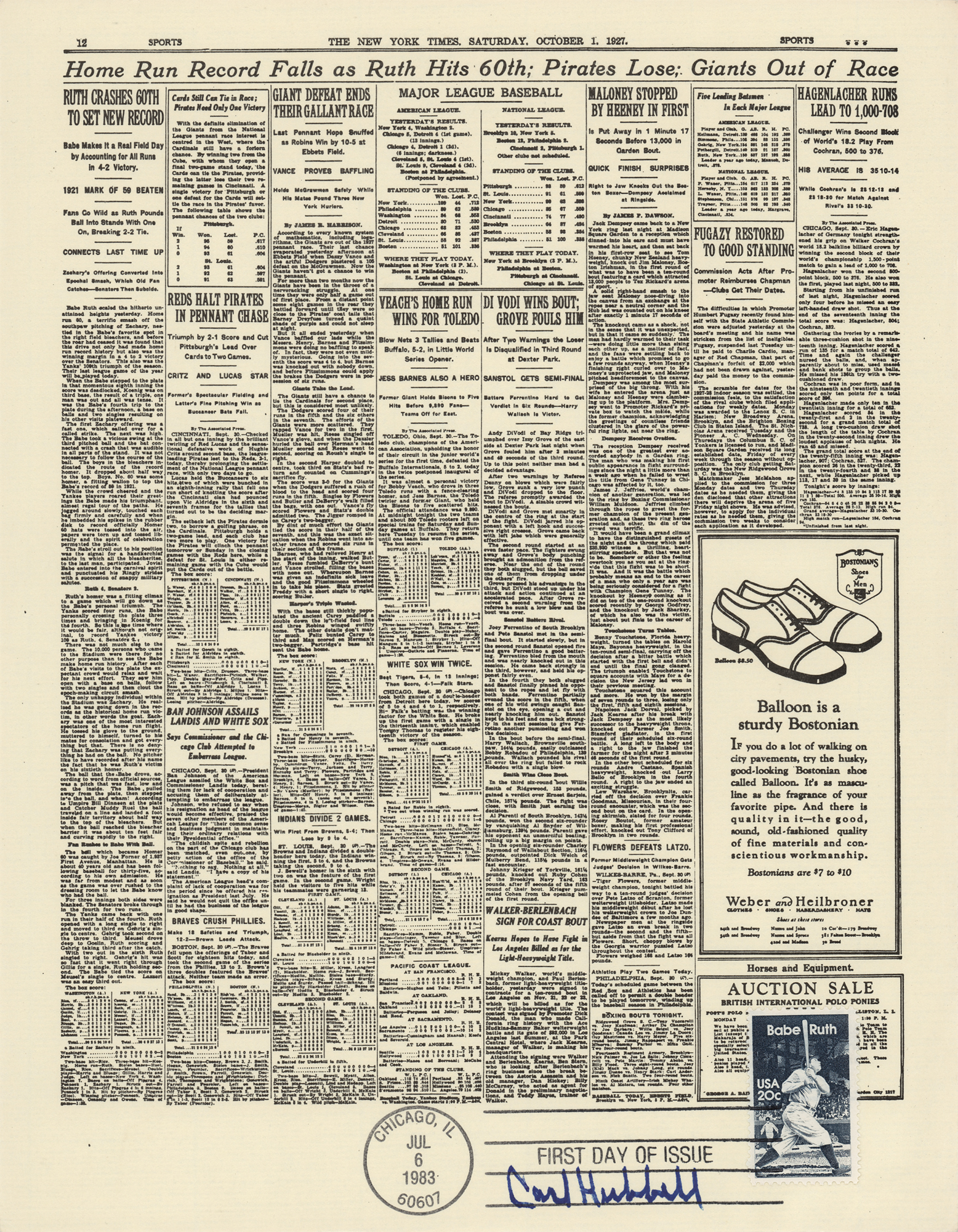 Group of 15 commemorative 8.5 x 11 prints honoring Babe Ruth and Ebbets Field, all carrying affixed postage stamps with first day cancellations, each signed in ink by a Hall of Famer. Signers are: Joe DiMaggio, George L. Kelly, Ted Lyons, Charlie Gehringer, Carl Hubbell, Walter Alston, Stanley Coveleski, Leo Durocher, Lefty Gomez, James 'Cool Papa' Bell, Joe Sewell, Waite Hoyt, Buck Leonard, Bill Dickey, and Burleigh Grimes. In fine condition. Also accompanied by a glossy 10 x 8 photo of Bobby Thomson celebrating his 'Shot Heard Round the World,' signed in blue felt tip by the New York Giants outfielder.