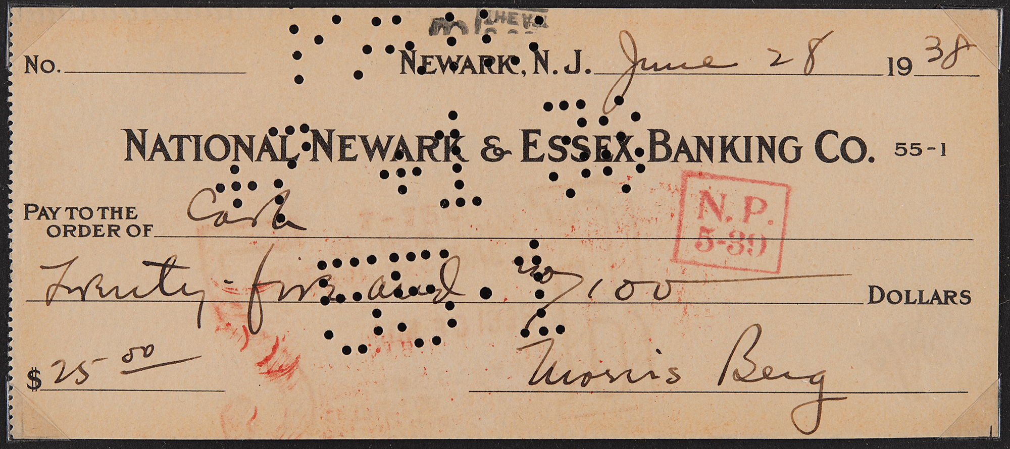 Baseball catcher (1902-1972) who also served briefly as a spy for the United States. Casey Stengel once described Berg as 'the strangest man ever to play baseball.' National Newark & Essex Banking Co. check, 6.25 x 2.75, filled out and signed by Moe Berg, "Morris Berg," payable to "Cash" for $25, June 28, 1938. Matted and framed with a photo of Berg to an overall size of 12 x 15. In fine condition.