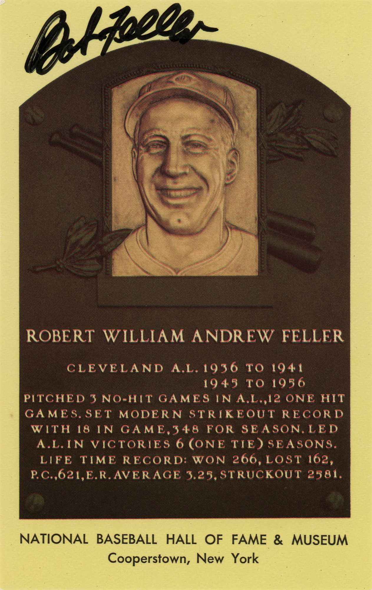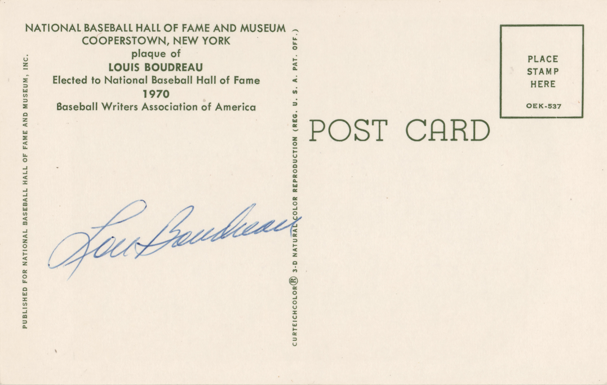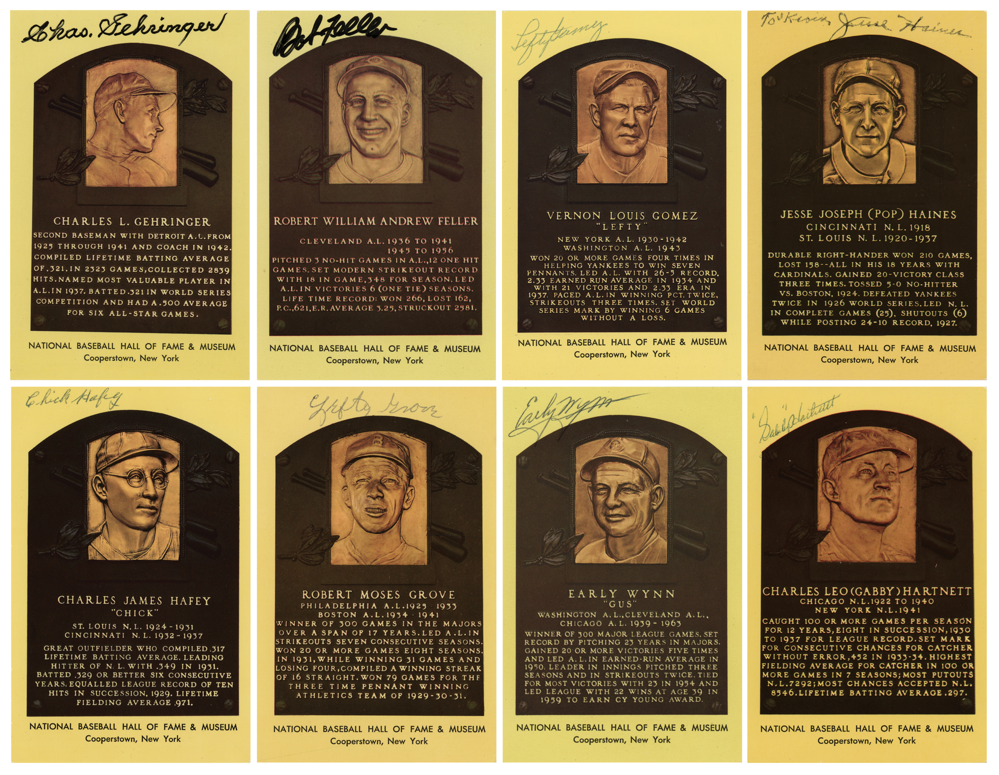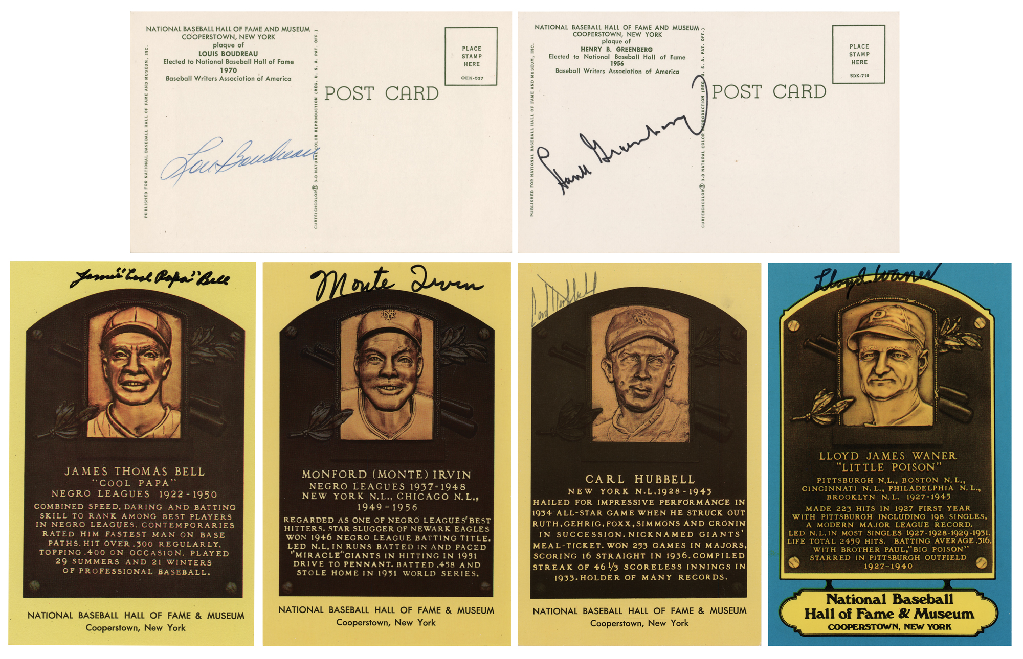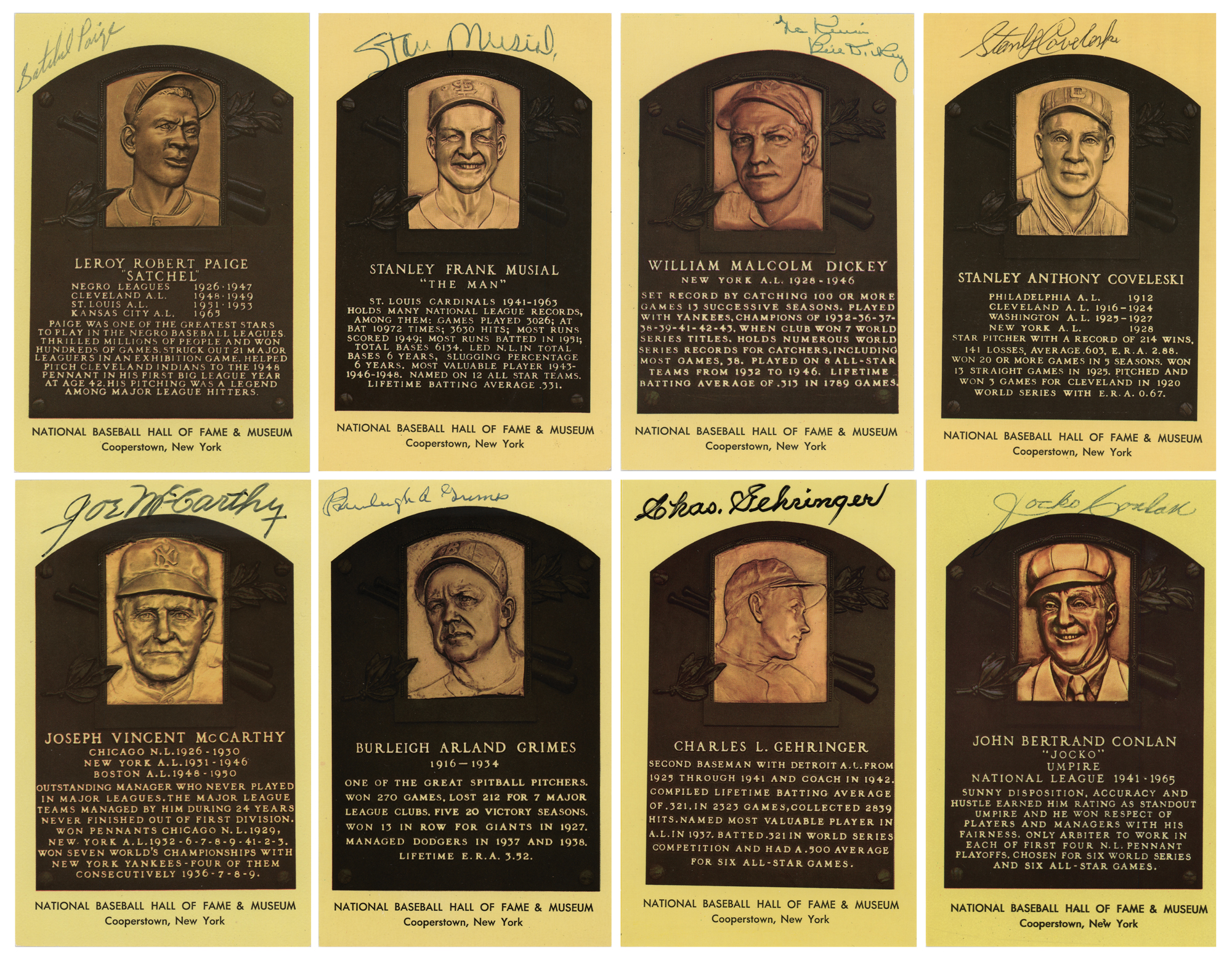 Collection of 21 Hall of Fame plaque cards from the National Baseball Hall of Fame & Museum in Cooperstown, New York, each 3.5 x 5.5, individually signed in ballpoint and felt tip by the following baseball players: James ‘Cool Papa’ Bell, Lou Boudreau, Jocko Conlan, Stanley Coveleski, Bill Dickey (ins), Bob Feller, Charles Gehringer, Lefty Gomez, Hank Greenberg, Burleigh Grimes, Lefty Grove, Chick Hafey, Jesse Haines (ins), Gabby Hartnett, Carl Hubbell, Monte Irvin, Joe McCarthy, Stan Musial, Satchel Paige, Lloyd Waner, and Early Wynn. Boudreau and Greenberg have signed on the reverse. In overall fine condition.