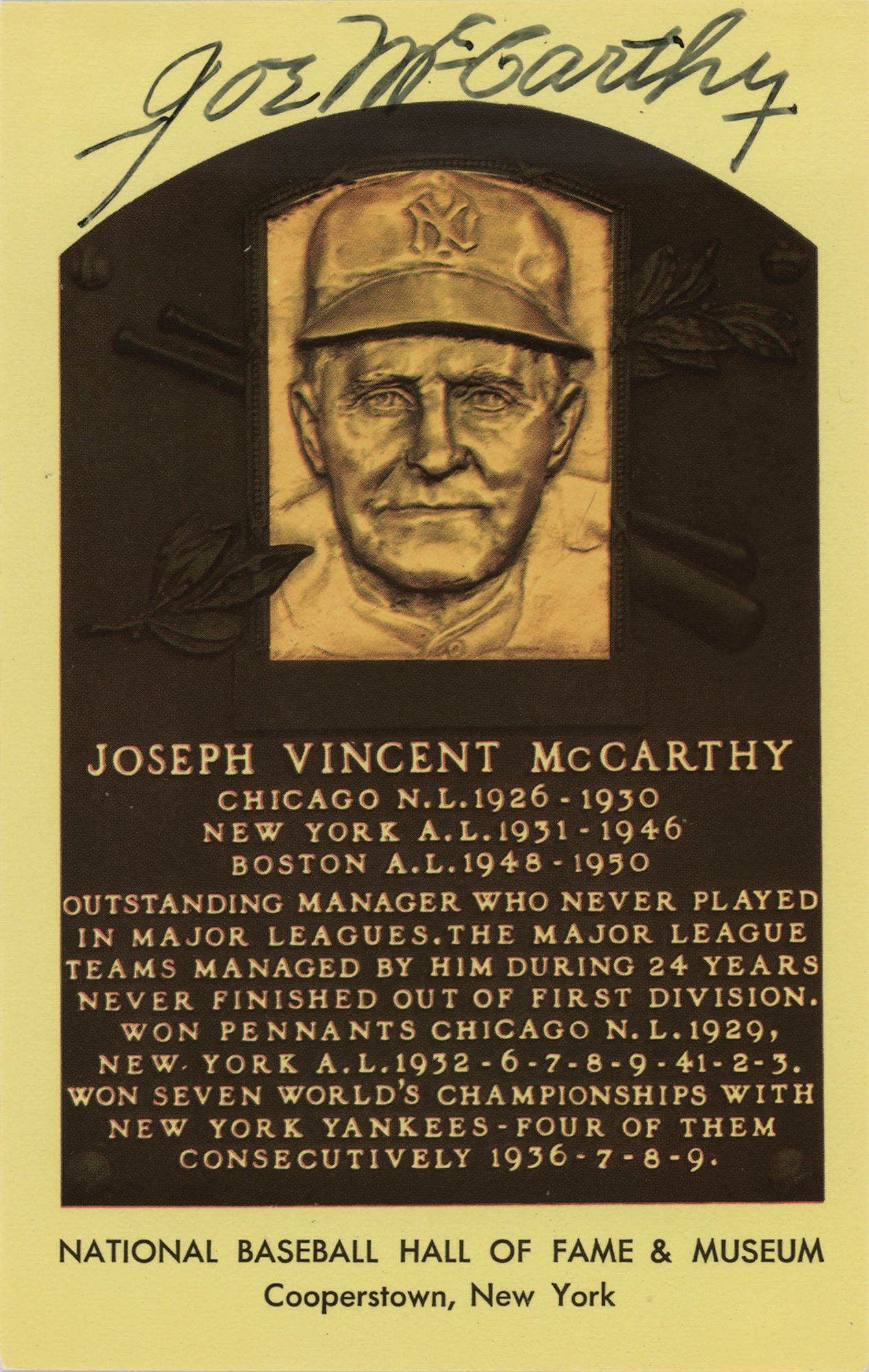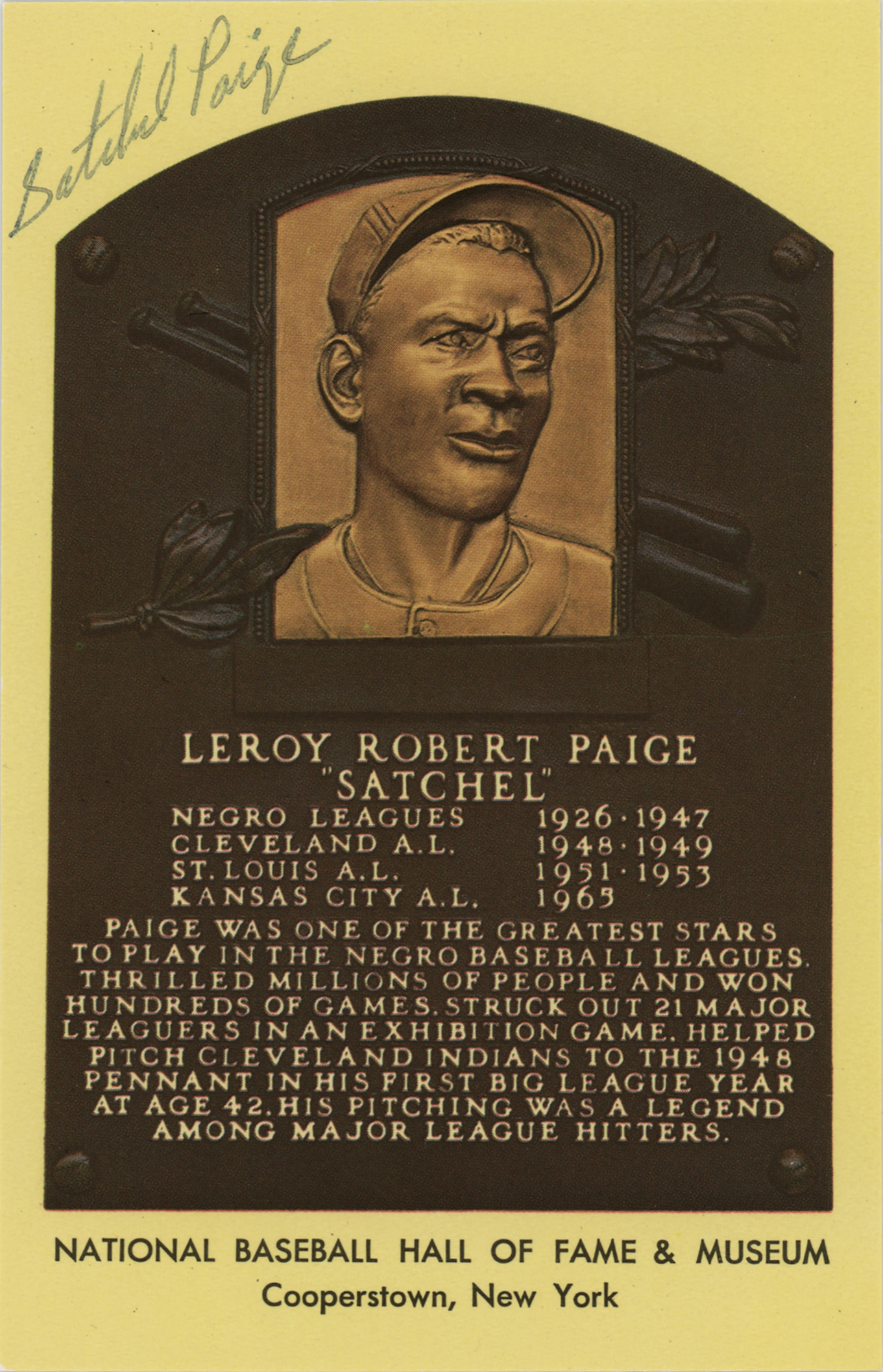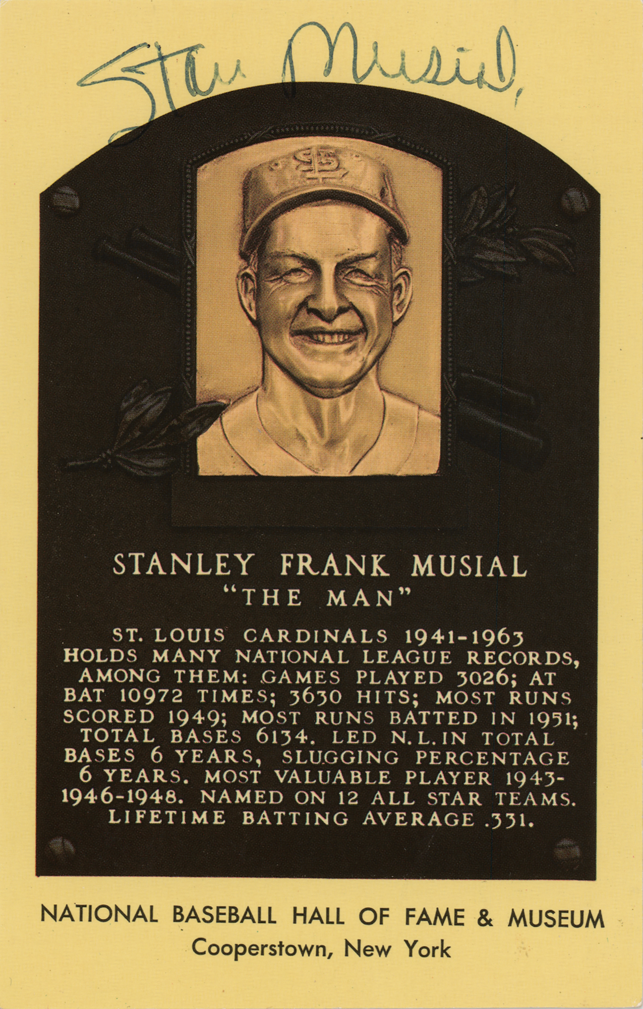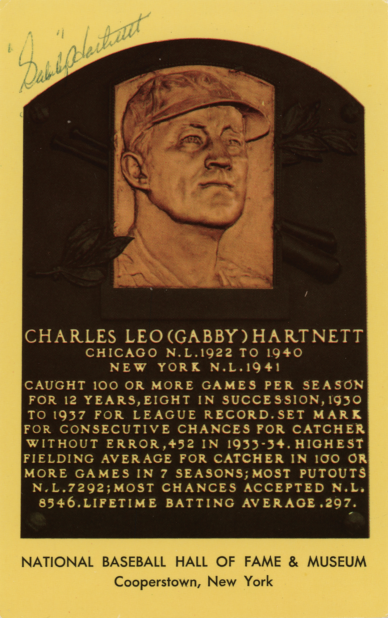 Collection of 21 Hall of Fame plaque cards from the National Baseball Hall of Fame & Museum in Cooperstown, New York, each 3.5 x 5.5, individually signed in ballpoint and felt tip by the following baseball players: James ‘Cool Papa’ Bell, Lou Boudreau, Jocko Conlan, Stanley Coveleski, Bill Dickey (ins), Bob Feller, Charles Gehringer, Lefty Gomez, Hank Greenberg, Burleigh Grimes, Lefty Grove, Chick Hafey, Jesse Haines (ins), Gabby Hartnett, Carl Hubbell, Monte Irvin, Joe McCarthy, Stan Musial, Satchel Paige, Lloyd Waner, and Early Wynn. Boudreau and Greenberg have signed on the reverse. In overall fine condition.