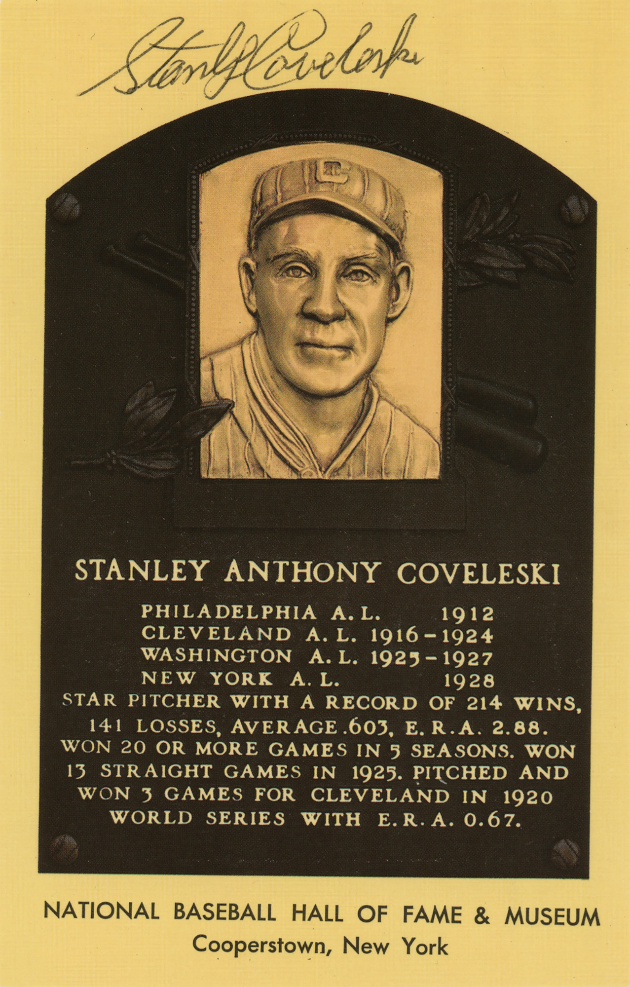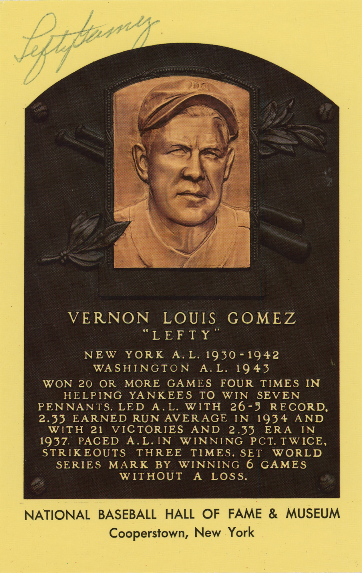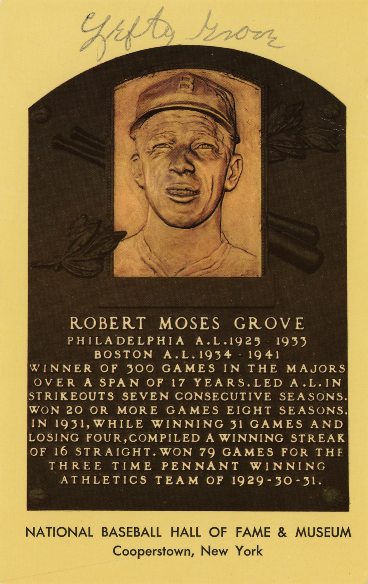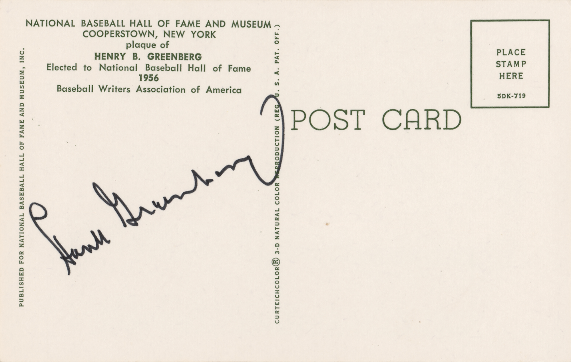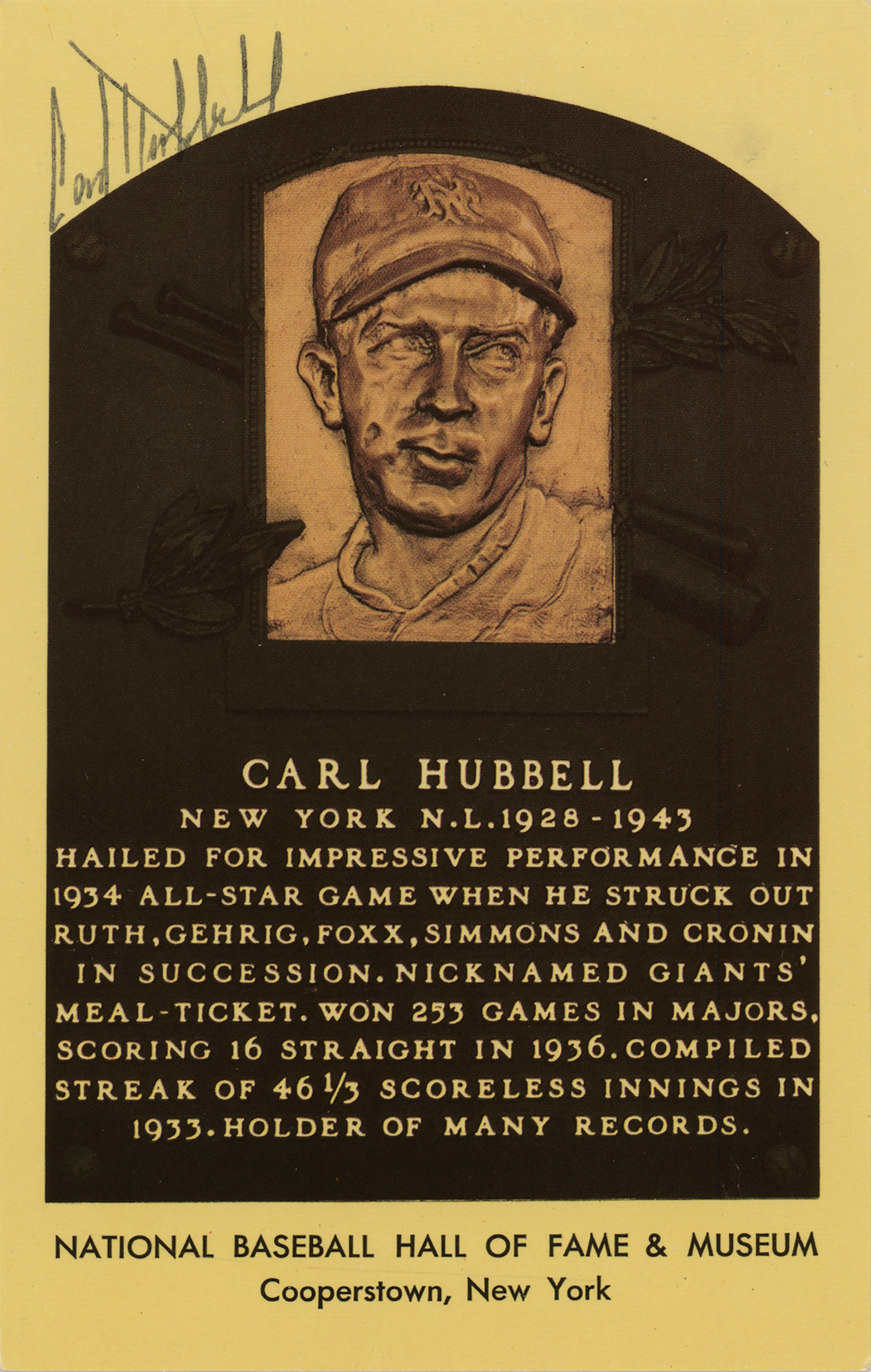 Collection of 21 Hall of Fame plaque cards from the National Baseball Hall of Fame & Museum in Cooperstown, New York, each 3.5 x 5.5, individually signed in ballpoint and felt tip by the following baseball players: James ‘Cool Papa’ Bell, Lou Boudreau, Jocko Conlan, Stanley Coveleski, Bill Dickey (ins), Bob Feller, Charles Gehringer, Lefty Gomez, Hank Greenberg, Burleigh Grimes, Lefty Grove, Chick Hafey, Jesse Haines (ins), Gabby Hartnett, Carl Hubbell, Monte Irvin, Joe McCarthy, Stan Musial, Satchel Paige, Lloyd Waner, and Early Wynn. Boudreau and Greenberg have signed on the reverse. In overall fine condition.