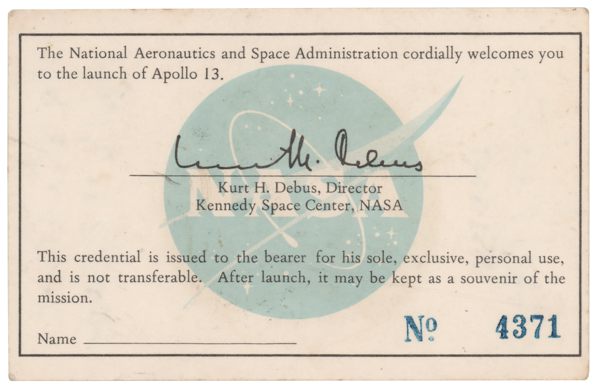 Original Apollo 13 launch pass featuring the mission insignia on a white background, 4 x 2.5, signed in black felt tip, "Eugene F. Kranz, Flight" and "Sy Liebergot, Apollo 13 EECOM." Stamped as "No. 4371" on the reverse. The reverse also features the facsimile signature of Kurt H. Debus, the director of the Kennedy Space Center, with text reading: "The National Aeronautics and Space Administration cordially welcomes you to the launch of Apollo 13. This credential is issued to the bearer for his sole, exclusive, personal use, and is not transferable. After launch, it may be kept as a souvenir of the mission." In fine condition.