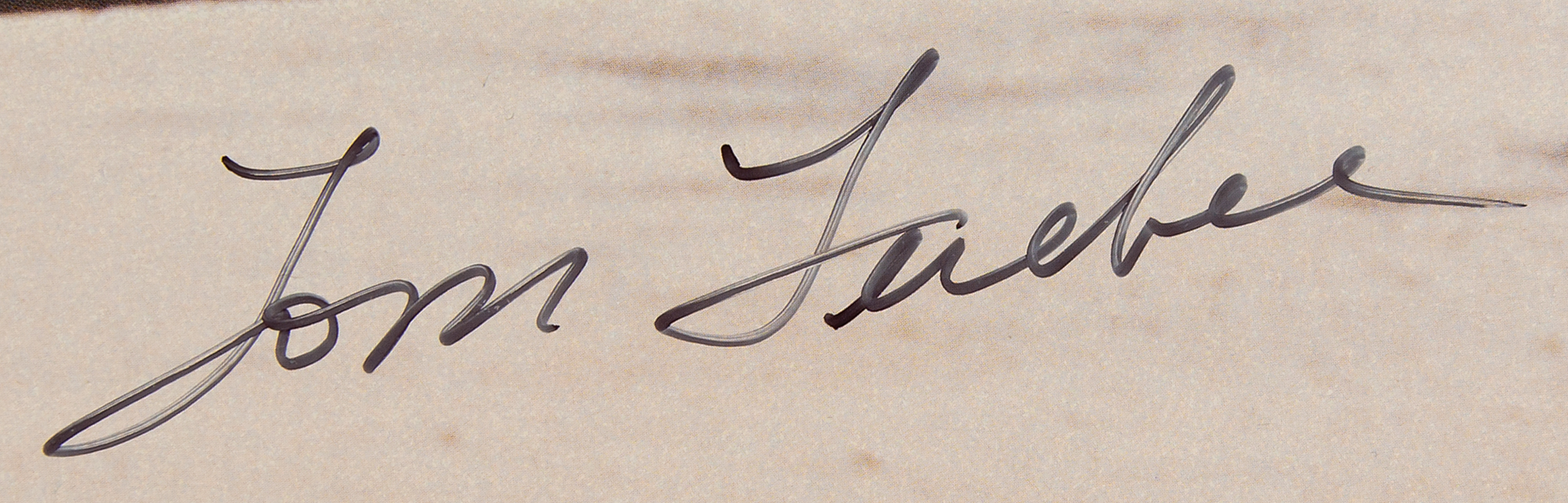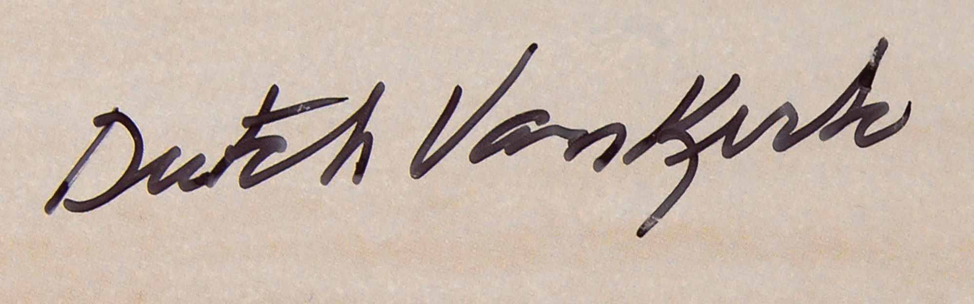 Color 30 x 24 poster entitled “The Enola Gay,” which depicts the infamous B-29 Superfortress bomber resting on a runway, presented by the National Air and Space Museum and Smithsonian Institution in 1995, signed in black felt tip by Paul Tibbets, Tom Ferebee, and Dutch Van Kirk. In very fine condition.