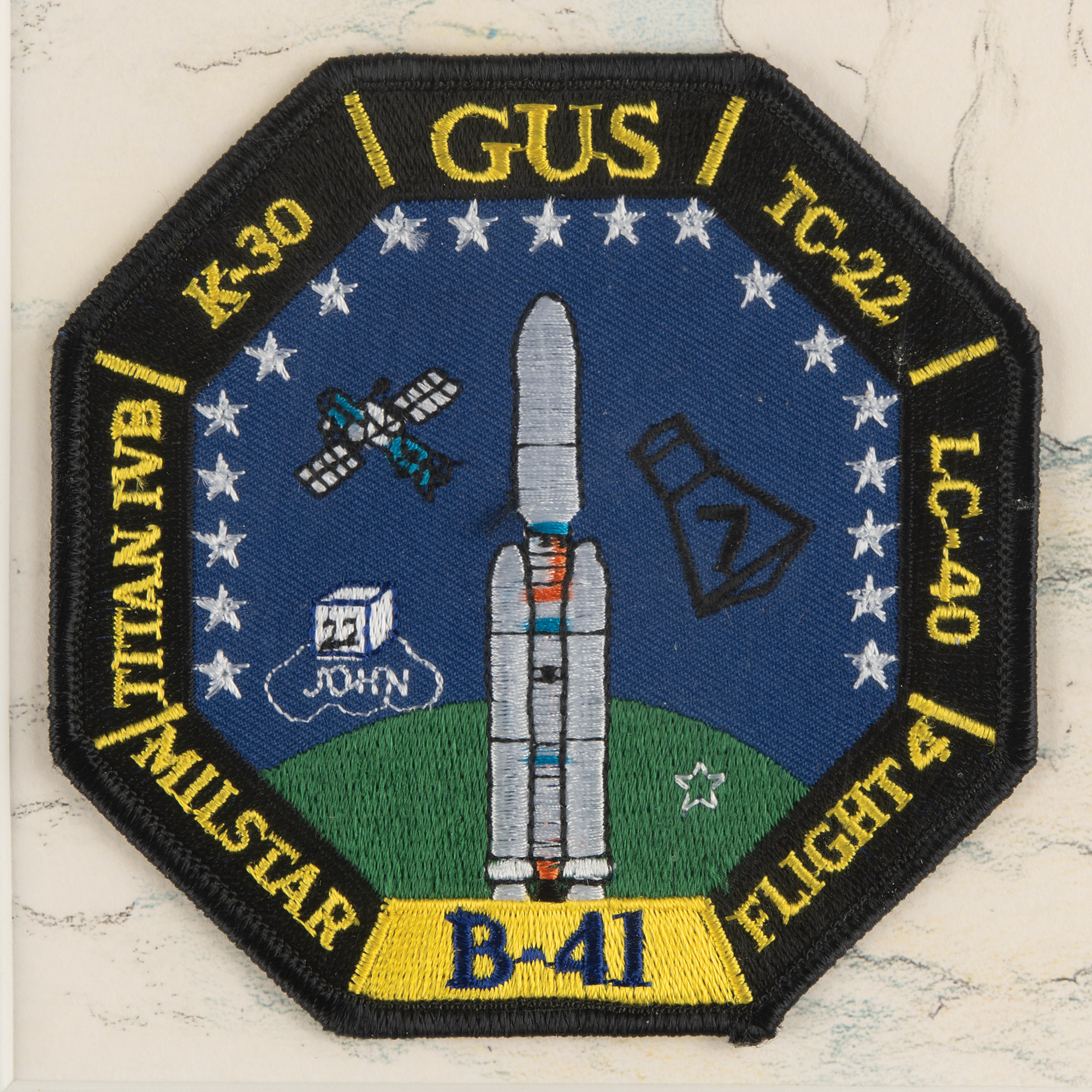 Limited edition color 13.5 x 10.5 print of a drawing by artist Michele Tate commemorating the crew of the tragic Apollo 1 mission, which depicts Gus Grissom, Edward H. White II, and Roger Chaffee next to a soaring Titan IV rocket, numbered 8/15, signed in the lower right corner by the artist. The print is double-matted and framed with two embroidered patches for the 45th Space Wing and the launch of a Titan IV Centaur rocket (mission B-41) on February 27, 2001, which was named “Gus,” in honor of Gus Grissom. Framed together to an overall size of 20.25 x 16.25. In very fine condition.