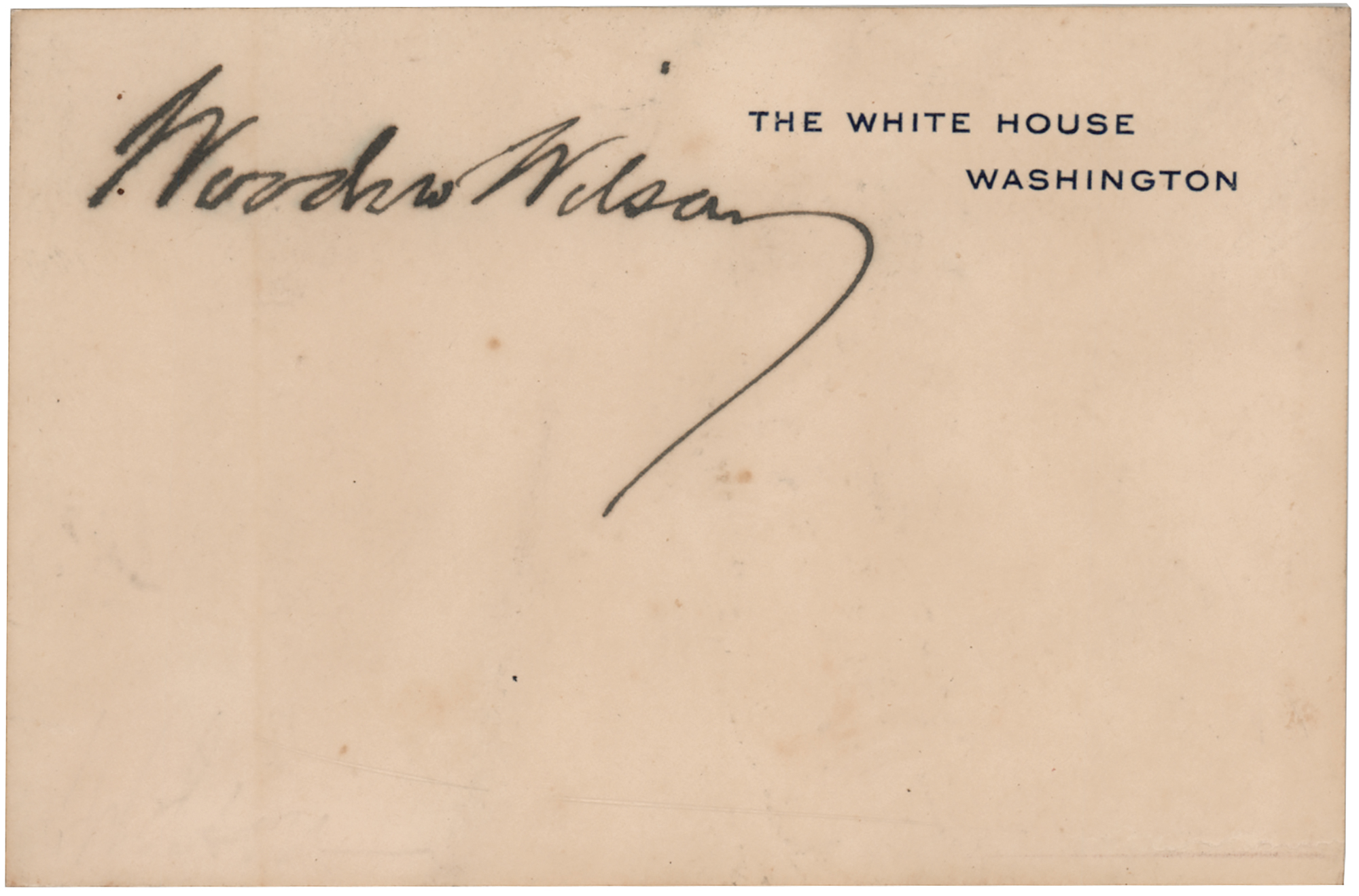 Official White House card, 4 x 2.75, signed in bold ink, "Woodrow Wilson.” In very good to fine condition, with faint overall staining.