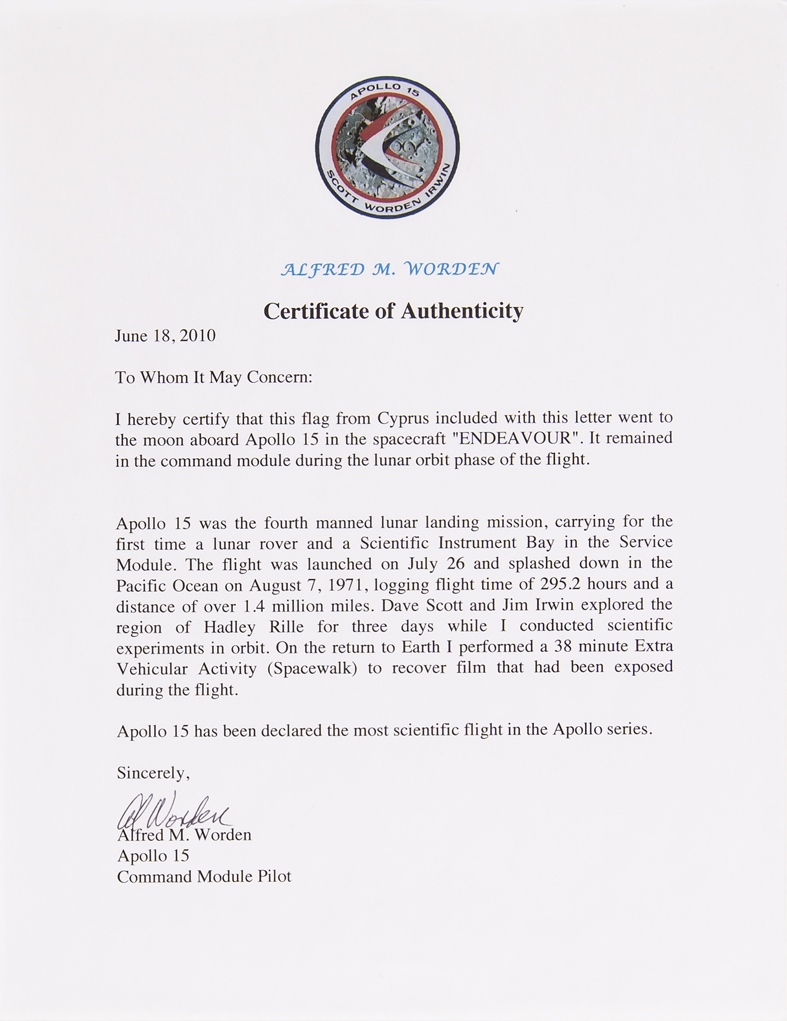 From the personal collection of Apollo 15 CMP Al Worden—a flown fabric flag of Cyprus, 6 x 4.25, carried into lunar orbit on the Apollo 15 Command Module 'Endeavour,' signed and flight-certified in black ballpoint, "Flown to the Moon on Apollo 15, Al Worden, CMP." In fine condition. Accompanied by a letter of provenance signed by Worden, in part: "I hereby certify that this flag from Cyprus included with this letter went to the moon aboard Apollo 15 in the spacecraft 'Endeavour.' It remained in the command module during the lunar orbit phase of the flight."