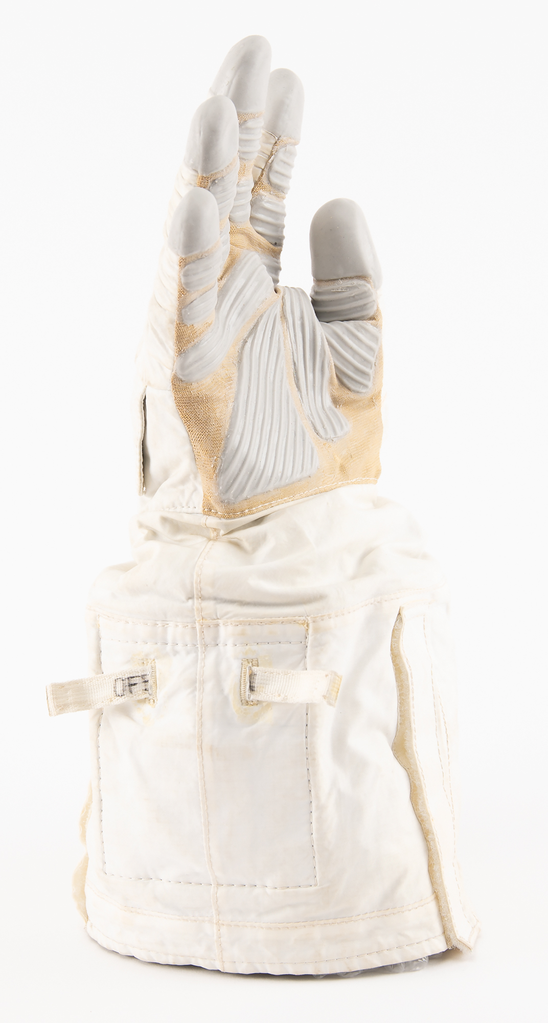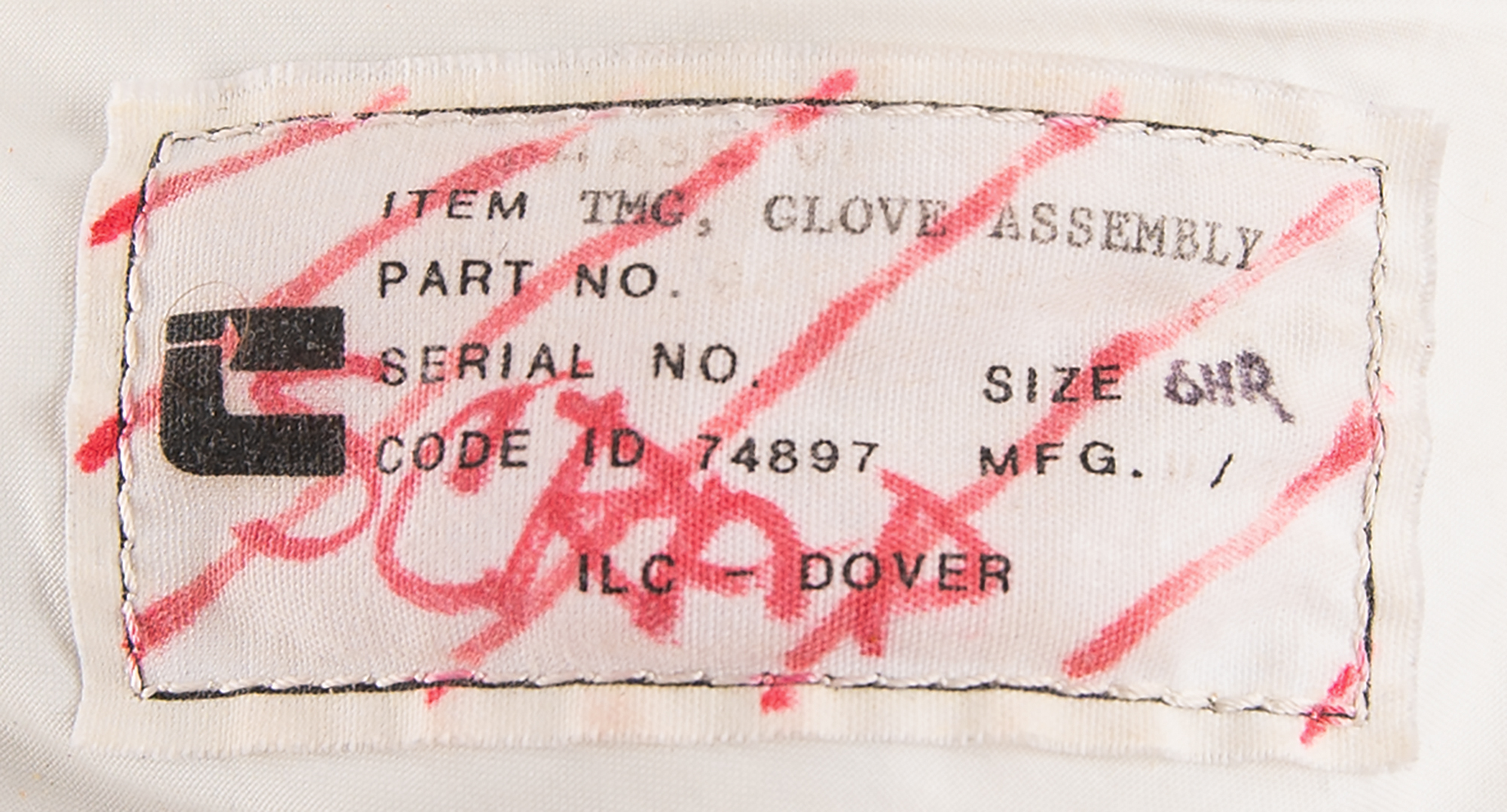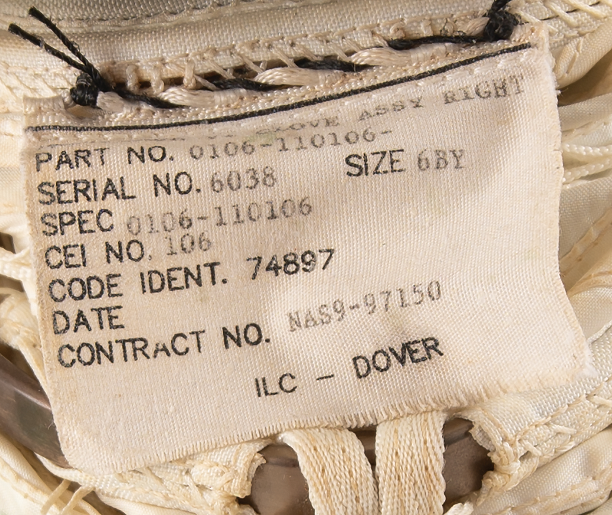 Scarce right-handed Phase VI Space Shuttle glove, complete with the exterior TMG (Thermal Micrometeoroid Garment), internal restraint assembly, and internal bladder. Sewn inside the wrist is an ILC-Dover tag, reading: "Item: Phase VI Glove Assy Right, Part No. 0106-110106-, Serial No. 6038, Size 6BY, Spec 0106-110106, CEI No. 106, Code Ident. 74897, Contract No. NAS9-97150." Further ILC-Dover tags identify the TMG, restraint assembly, and softgoods subassembly, with the TMG tag struck through in red felt tip and marked "Scrap." The TMG?the outermost layer of the spacesuit?provides insulation, radiation shielding, and protection from micrometeorites that could otherwise puncture the suit. It features a gray silicon palm and fingertips, a handback flap, and built-in electronics for supporting a remote power supply for an active fingertip heating system (on/off pull strap and cables intact). The internal bladder, which has been filled with silicone to maintain the shape of the glove, is made of a green urethane material and designed to maintain pressure in the EMU glove assembly, while not limiting the finger joints and wrist gimbal. In fine condition.