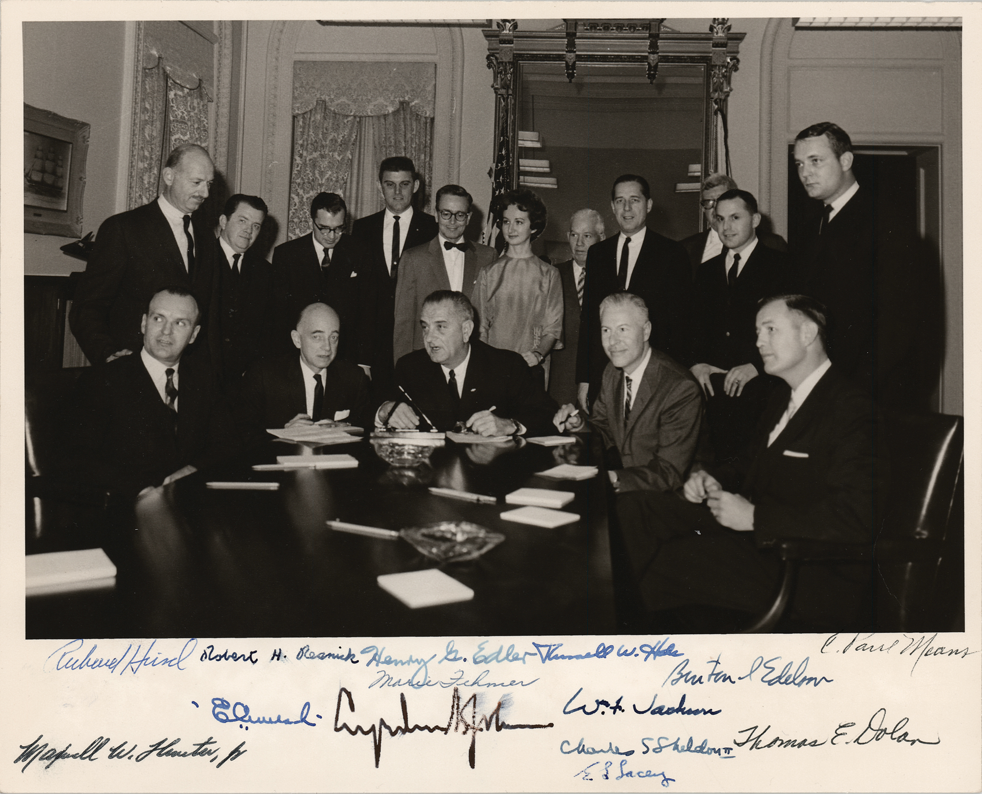 Official vintage matte-finish 10 x 8 White House photo of Lyndon B. Johnson at a White House ceremony, signed in the lower border in fountain pen by President Johnson and a dozen of those depicted, including: his secretary, Marie Fehmer; aerospace engineer Maxwell Hunter; aerospace researcher Charles S. Sheldon II; and others. Reverse bears the credit stamp of official White House photographer Cecil W. Stoughton. In fine condition, with a small creases to the image, and brushing to Johnson's signature.