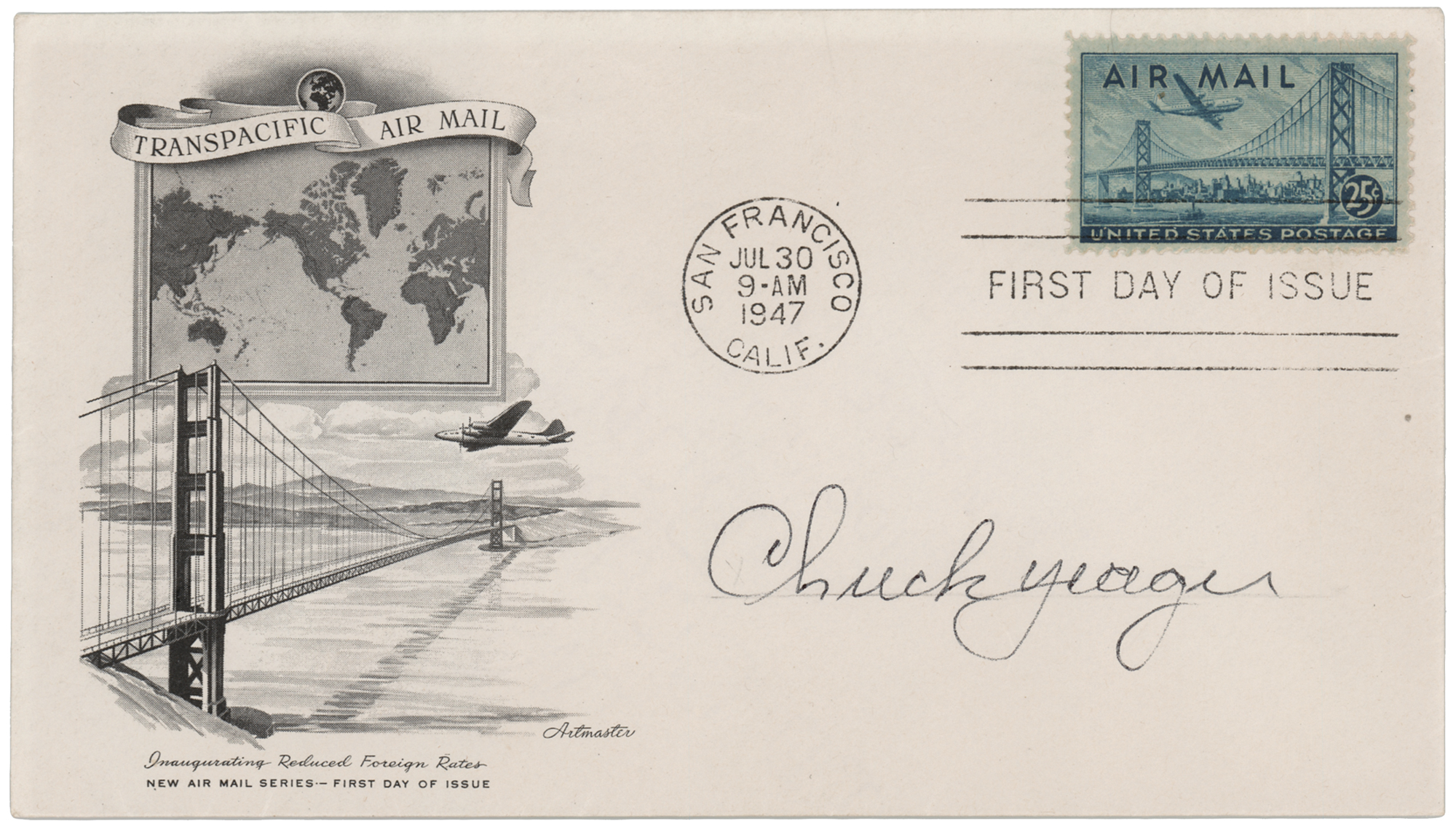 FDC with a cachet honoring Transpacific Air Mail, a new air mail series inaugurating reduced foreign mail rates, signed in black ballpoint, "Chuck Yeager." In fine condition.