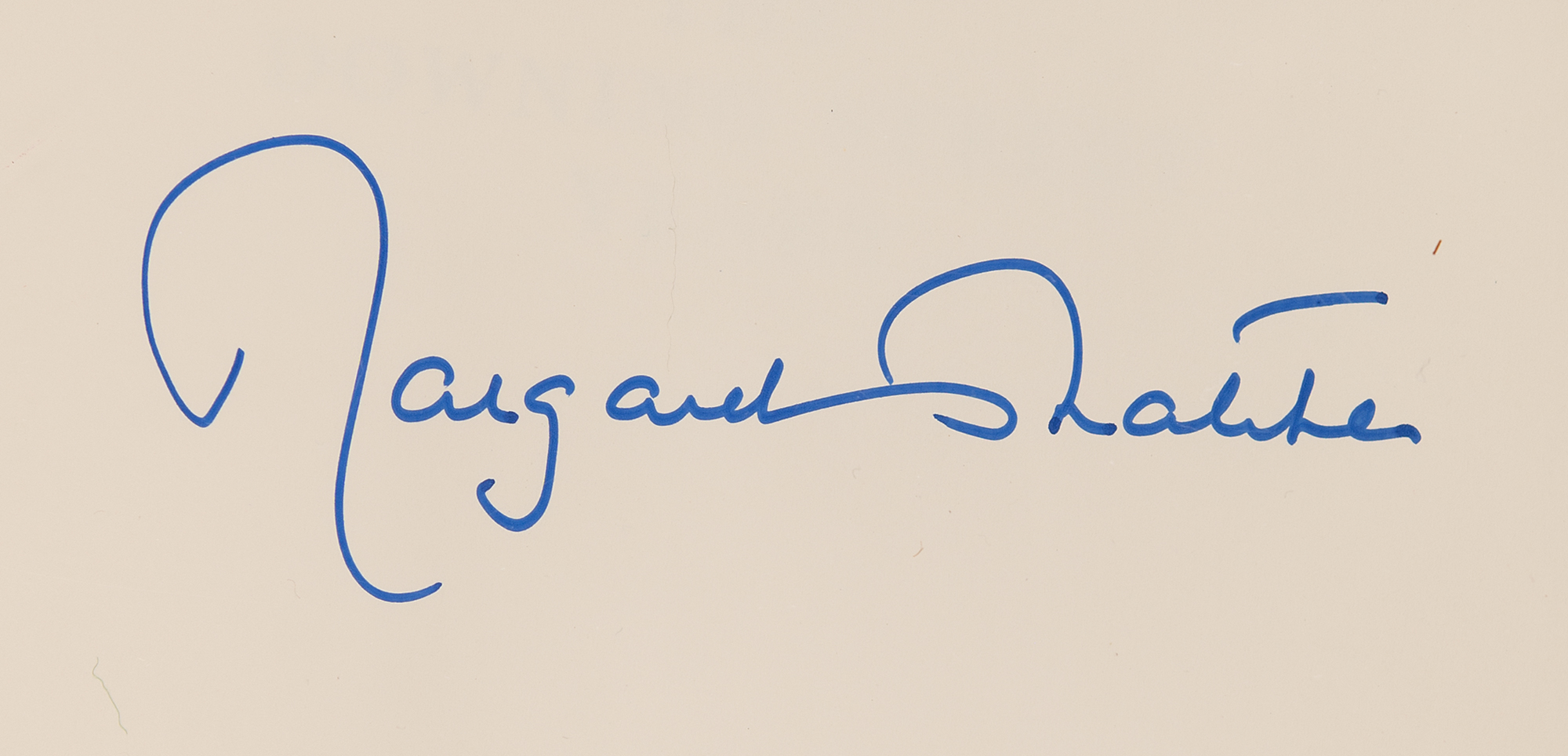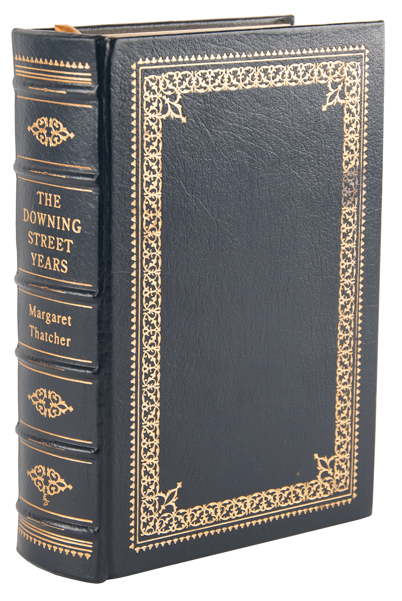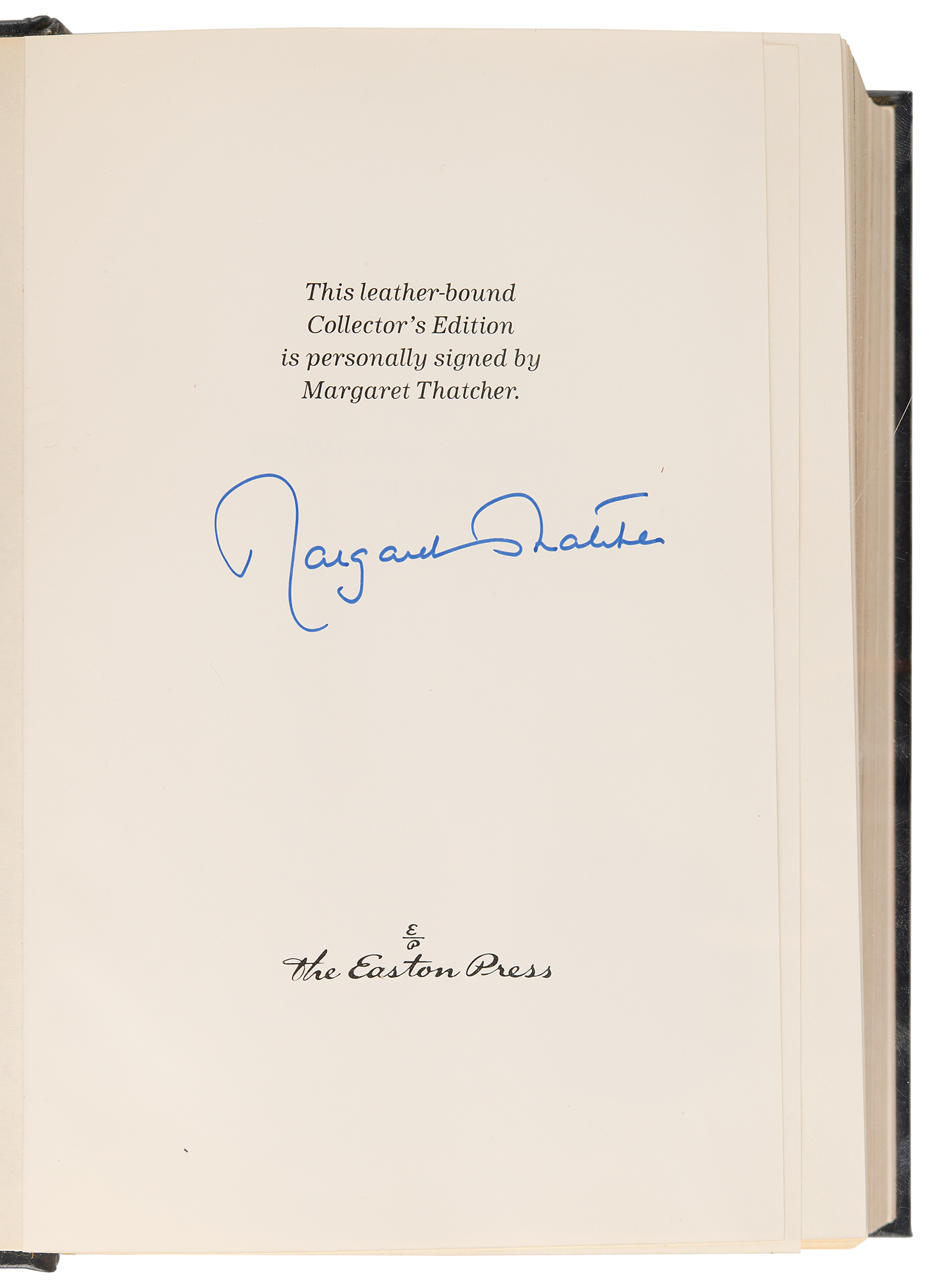 Signed book: The Downing Street Years. Collector's edition. Norwalk, CT: Easton Press, 1994. Leatherbound hardcover, 6.5 x 9.5, 914 pages. Boldly signed on the colophon in blue felt tip by Margaret Thatcher. In fine condition, with rubbing to gilt on the front cover and textblock edges, and a collector's personal seal to the half-title page.