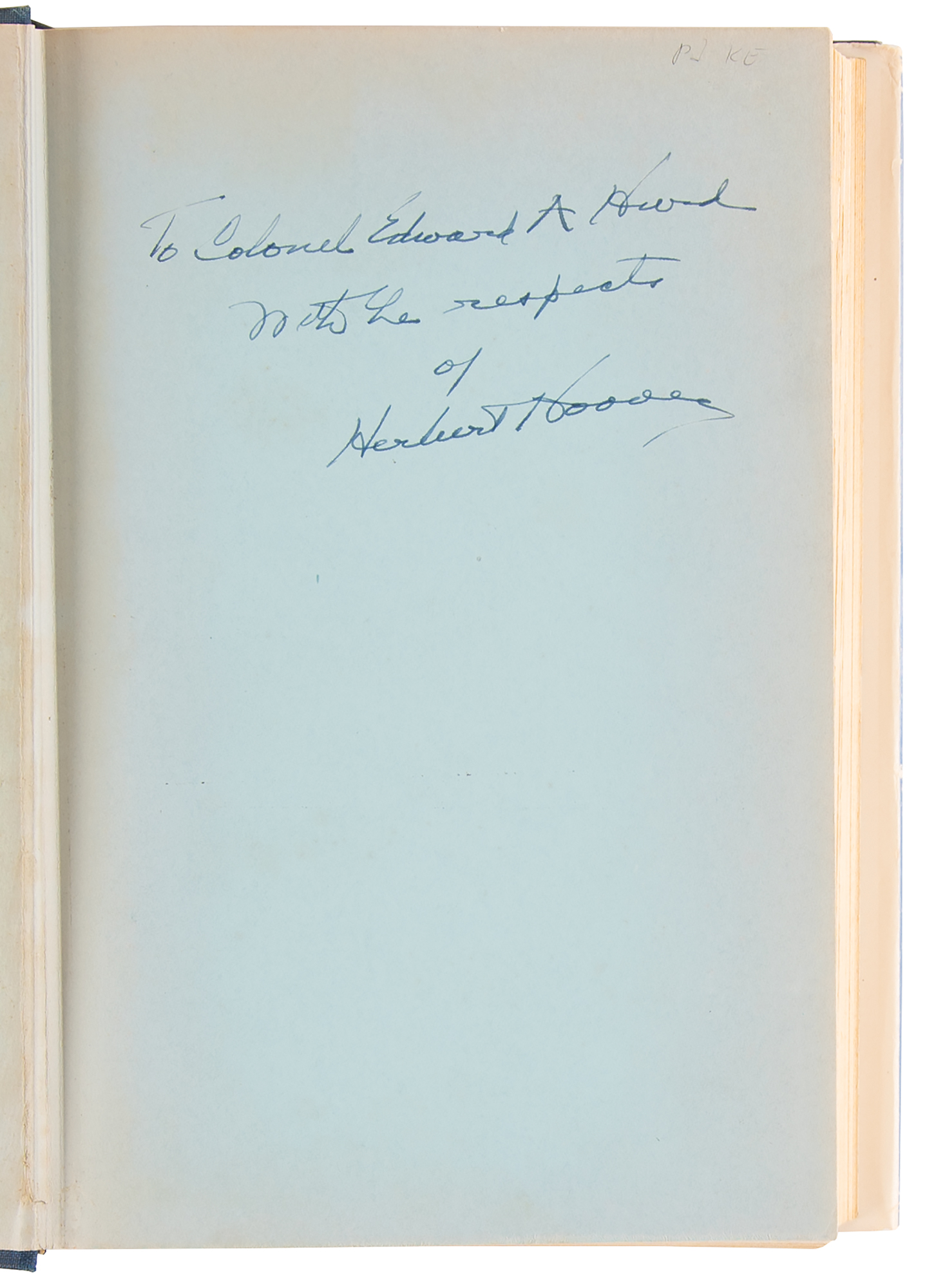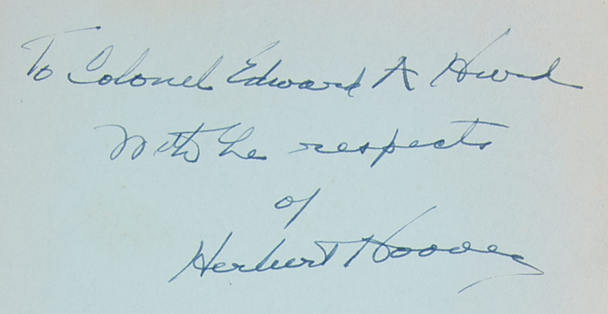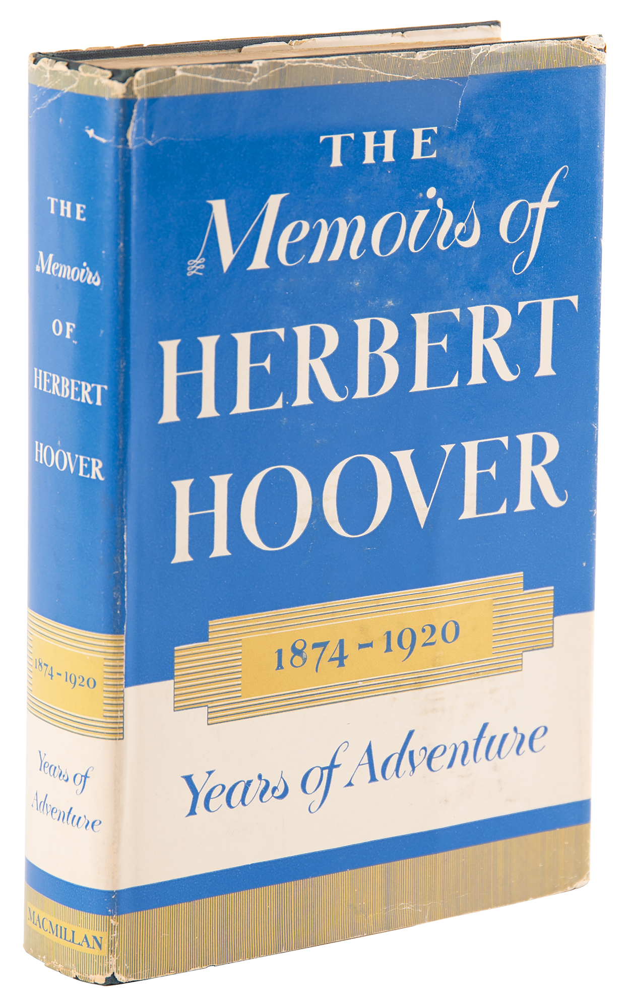 Signed book: The Memoirs of Herbert Hoover: Years of Adventure, 1874-1920. First edition. NY: The Macmillan Company, 1951. Hardcover with dust jacket, 6.5 x 9.5, 496 pages. Signed and inscribed on the first free end page, "To Colonel Edward A. Hurd, With the respect of Herbert Hoover." In very good to fine condition, with toning to the edges of the signed page and pastedowns, and light wear to the price-clipped dust jacket.