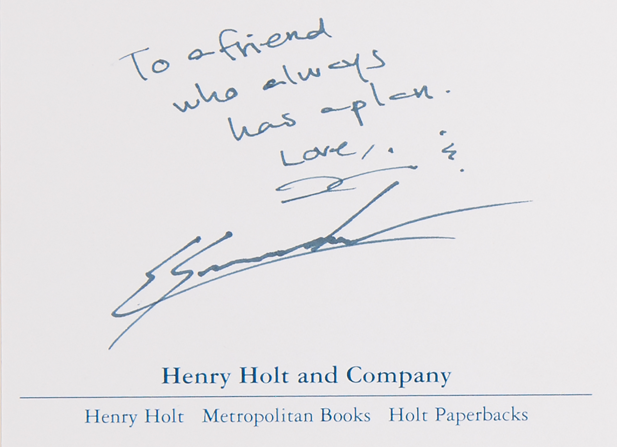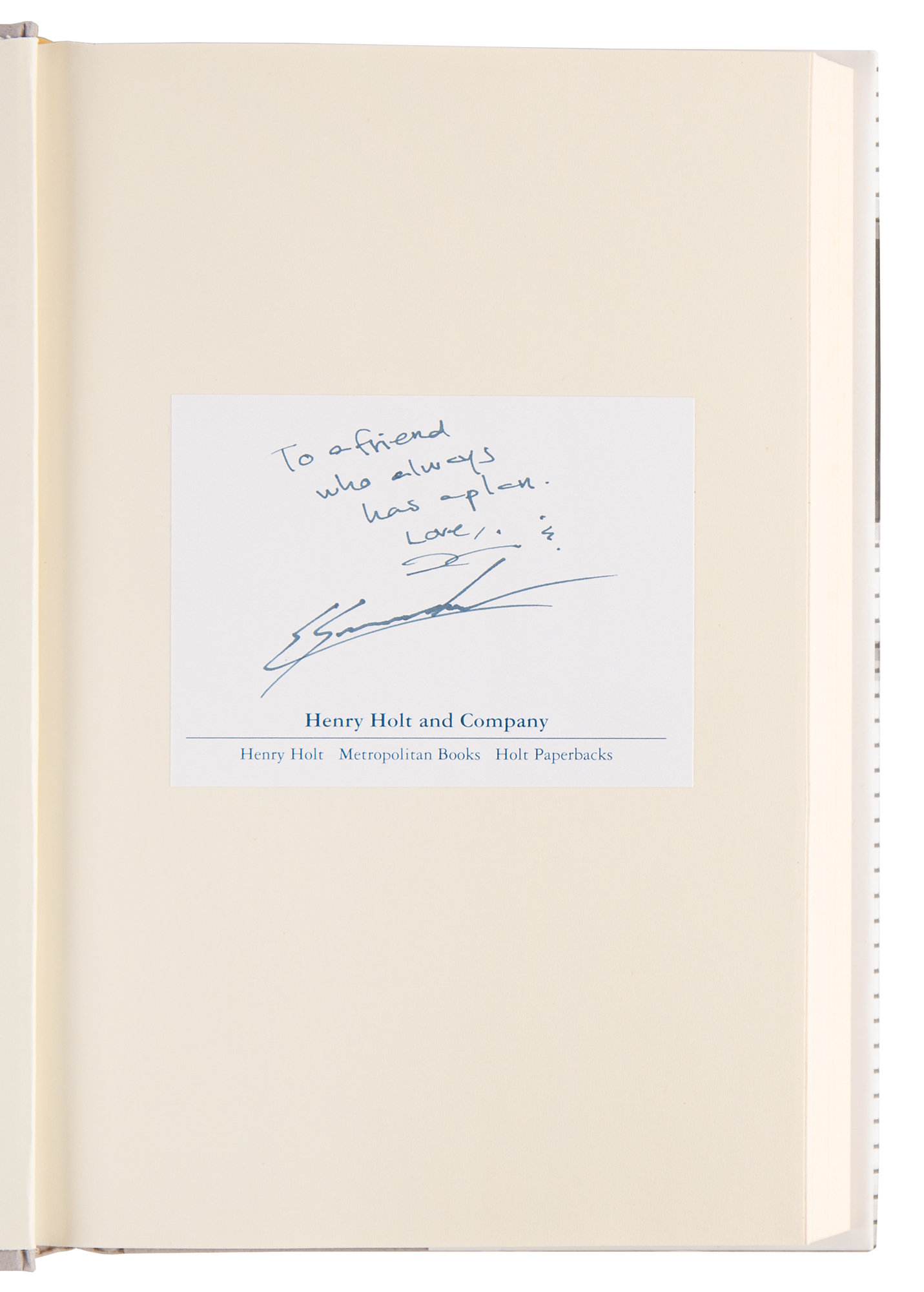 Signed book: Permanent Record. Later printing. NY: Metropolitan Books, 2019. Hardcover with dust jacket, 6.5 x 9.5, 339 pages. Signed and inscribed on a bookplate affixed to the first free end page in black felt tip, "To a friend who always has a plan. Love, E. Snowden." In very fine condition.