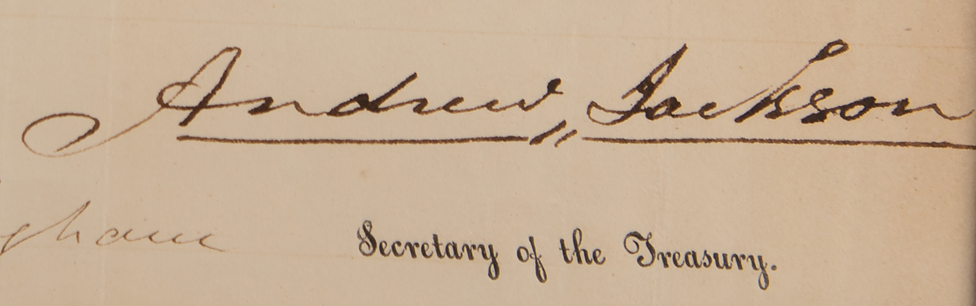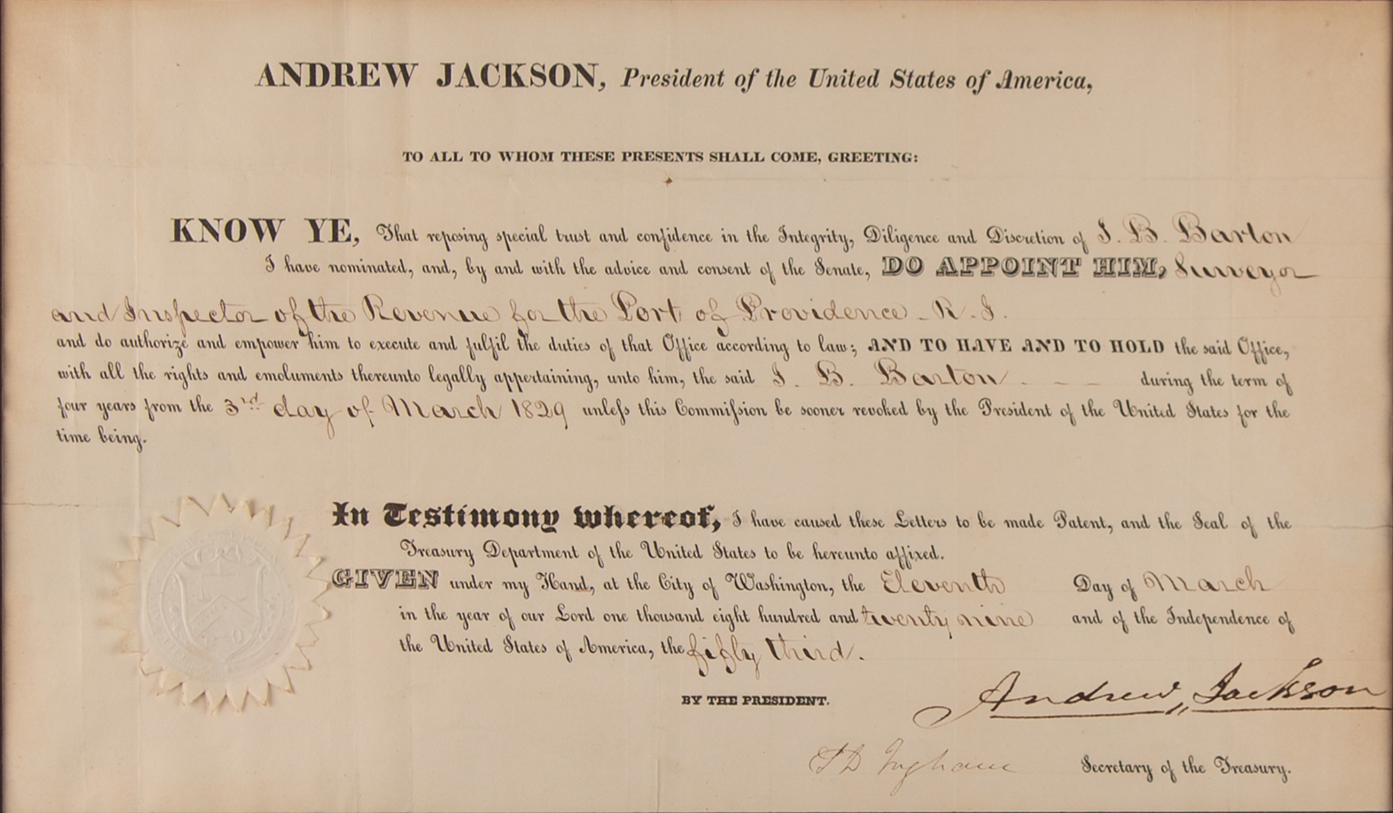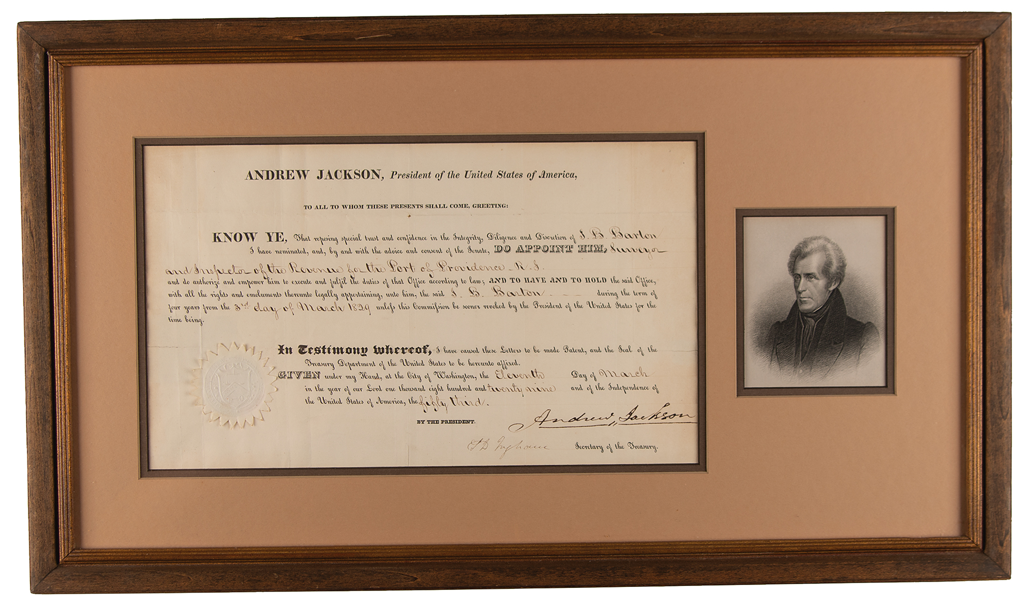 Partly-printed DS as president, one page, 14.5 x 8.5, March 11, 1829. President Jackson appoints J. B. Barton as "Surveyor and Inspector of the Revenue for the Port of Providence, R.I." Boldly signed at the conclusion in ink by President Andrew Jackson, and countersigned by Secretary of the Treasury Samuel D. Ingham. The white paper seal affixed at the lower left remains intact. Nicely double-matted and framed with an engraved portrait to an overall size of 25.75 x 15. In fine condition. Accompanied by the original 1979 receipt from B. Altman & Co.