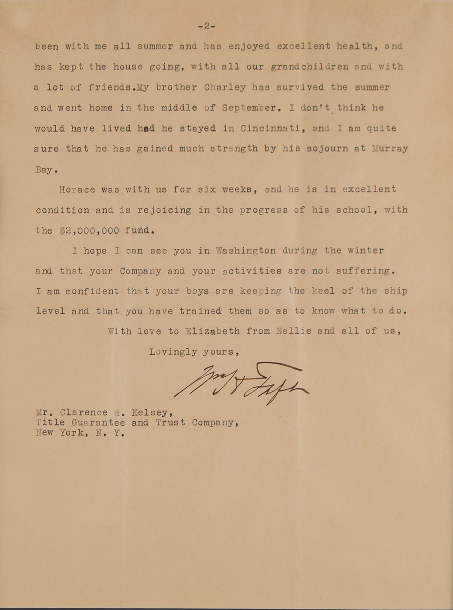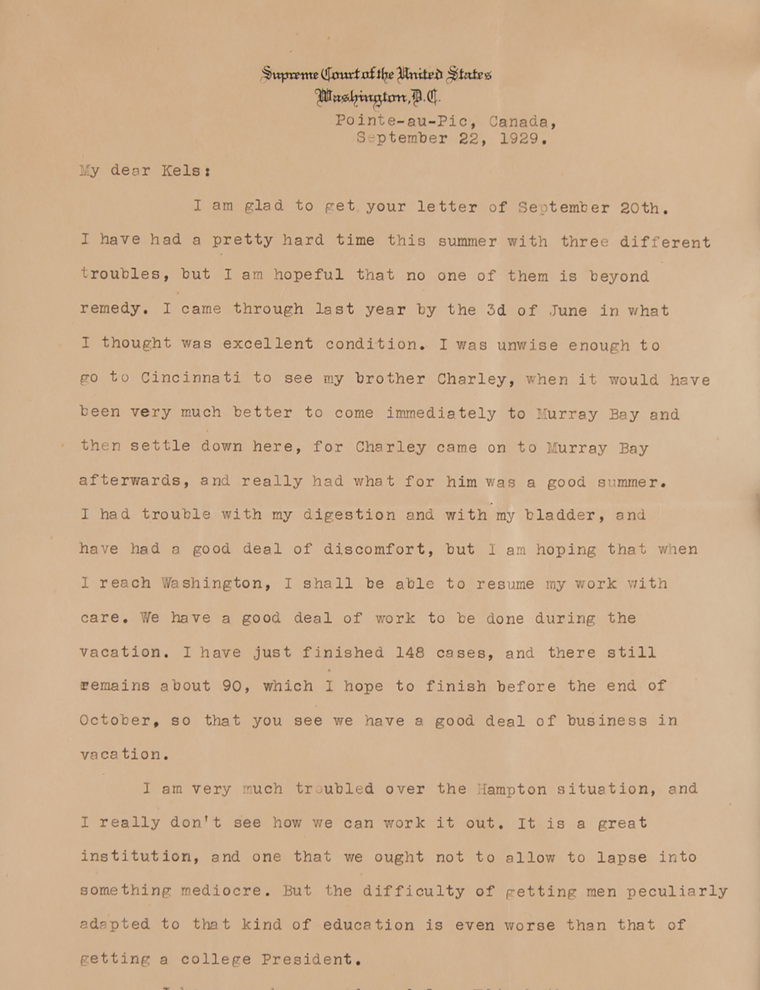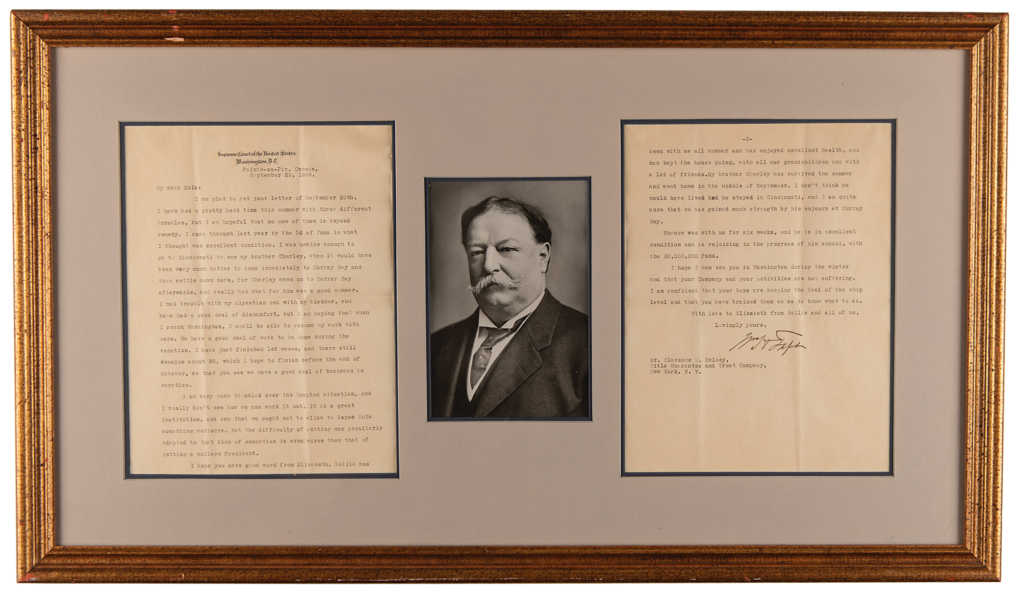 TLS signed “Wm. H. Taft,” two pages, 7.75 x 10, Supreme Court of the United States letterhead, September 22, 1929. Letter to Clarence H. Kelsey of the Title Guarantee and Trust Company, in part: "I have had a pretty hard time this summer with three different troubles, but I am hopeful that no one of them is beyond remedy. I came through last year by the 3d of June in what I thought was excellent condition. I was unwise enough to go to Cincinnati to see my brother Charley, when it would have been very much better to come immediately to Murray Bay and then settle down here, for Charley came on to Murray Bay afterwards, and really had what was a good summer. I had trouble with my digestion and with my bladder, and have had a good deal of discomfort, but I am hoping that when I reach Washington, I shall be able to resume my work with care. We have had a good deal of work to be done during the vacation. I have just finished 148 cases, and there still remains about 90, which I hope to finish before the end of October." Double-matted and framed with a portrait to an overall size of 28.25 x 16.25. In fine condition, with heavy intersecting folds. Accompanied by the original receipt from B. Altman & Co.
