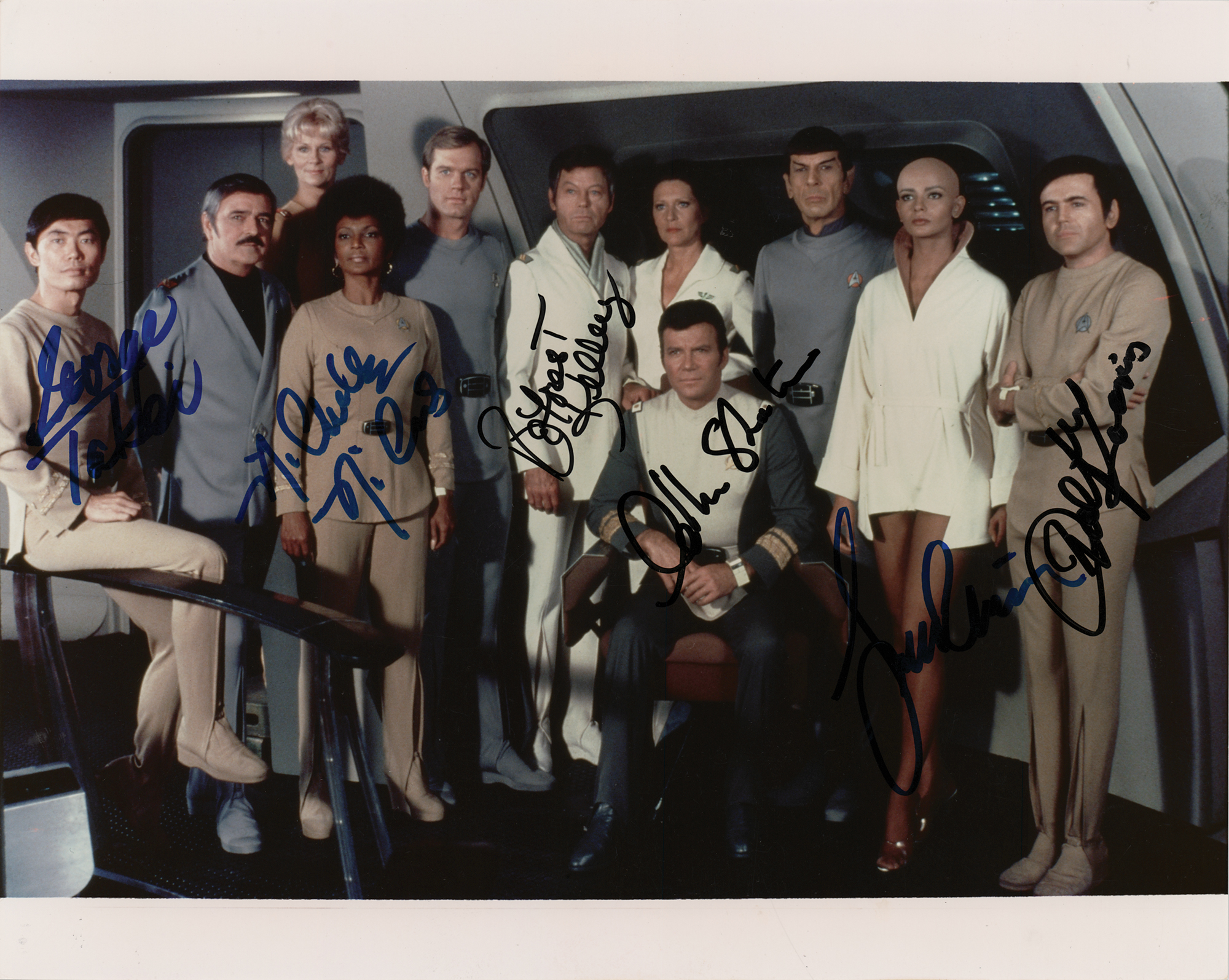 Color glossy 10 x 8 photo of the Star Trek cast, signed in various inks by William Shatner, Leonard Nimoy, George Takei, Nichelle Nichols, DeForest Kelley, and Walter Koenig. In fine condition.