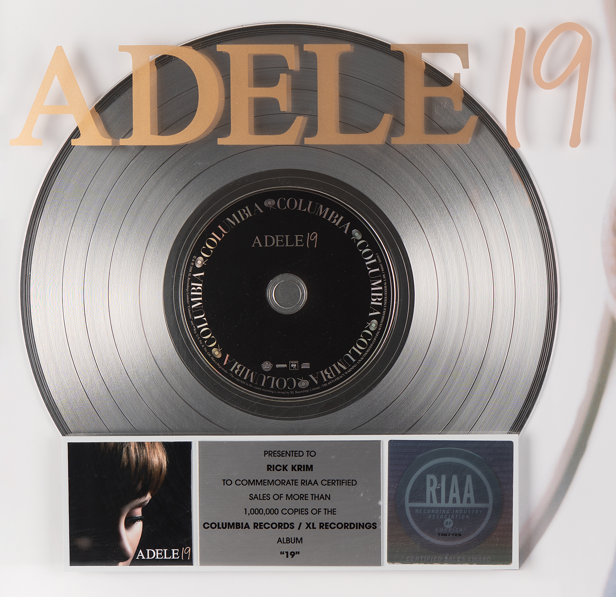 Official serial number hologram-style RIAA platinum sales award presented "to commemorate RIAA certified sales of more than 1,000,000 copies of the Columbia Records / XL Recordings album '19.'" Framed with its disc and plate bearing a small image of the album cover against a large image of Adele to an overall size of 31.75 x 18.75. Award retains its original backing with a Jewel Box Platinum label. In fine condition, with some chipping to bottom edge of the frame, and some dampstaining to lower portion of backing.
