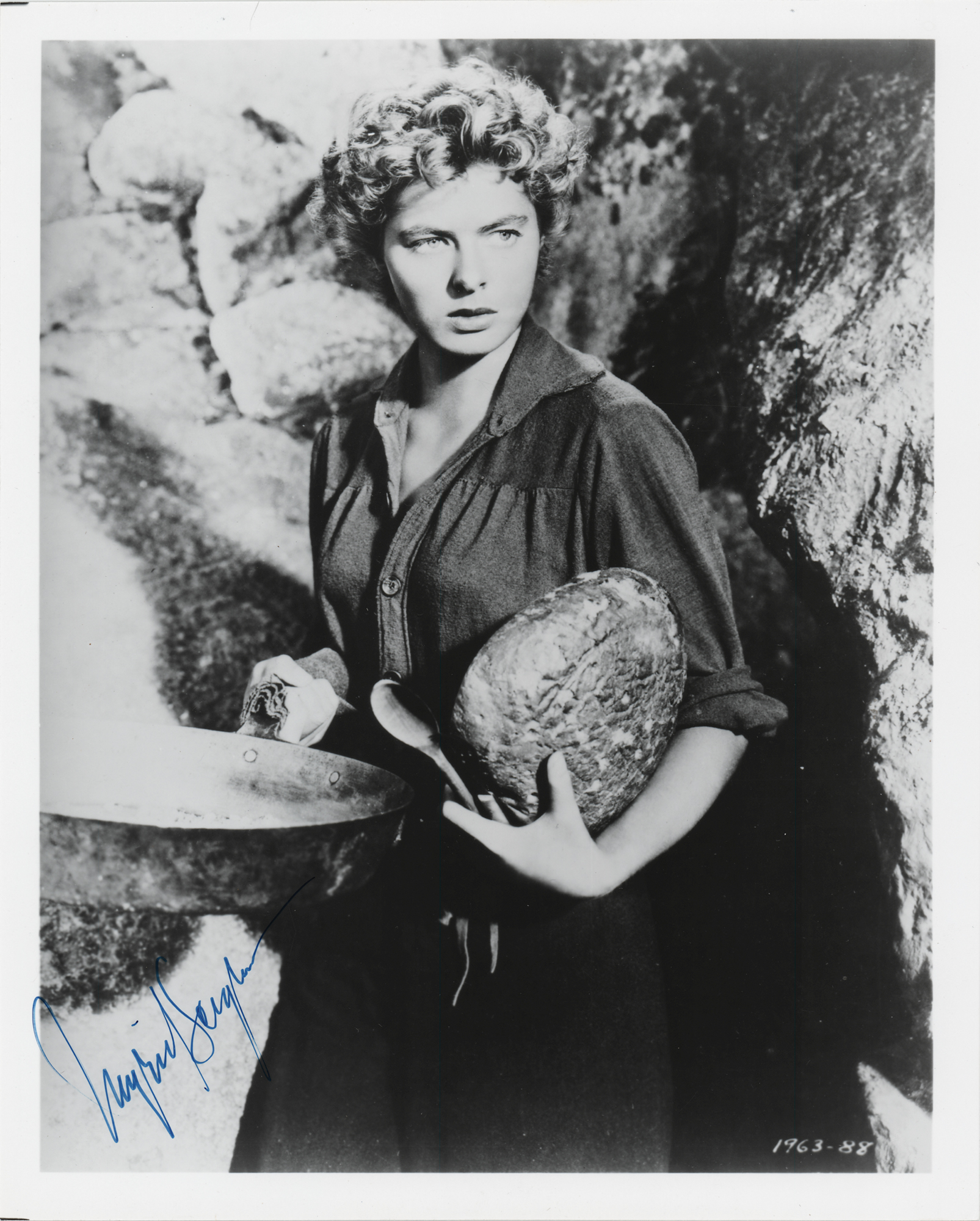 Glossy 8 x 10 three-quarter photo of Ingrid Bergman, signed in blue felt tip. In fine condition, with a light crease to the top edge.