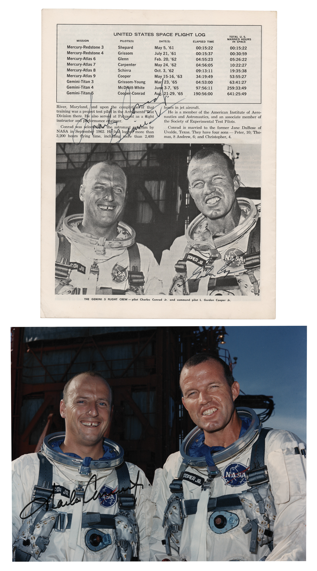 Two signed items: a color satin-finish 10 x 8 photo of the Gemini V astronauts smiling in their white space suits, signed in black felt tip by Charles Conrad and Gordon Cooper; and a NASA Manned Spacecraft Center Fact Sheet from October 1965, signed on the back in black felt tip, "Charles Conrad, Gemini 5" and “Gordon Cooper.” In overall fine condition, with poor contrast to the Cooper signature on the color photo.
