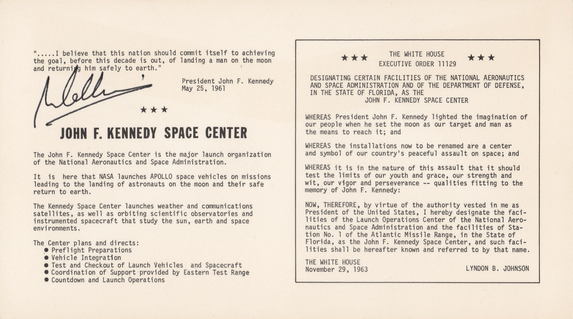 Felt tip signature of the Apollo 11 CMP, "M. Collins," on a white card imprinted with "White House Executive Order 11129," creating the John F. Kennedy Space Center. In very fine condition.