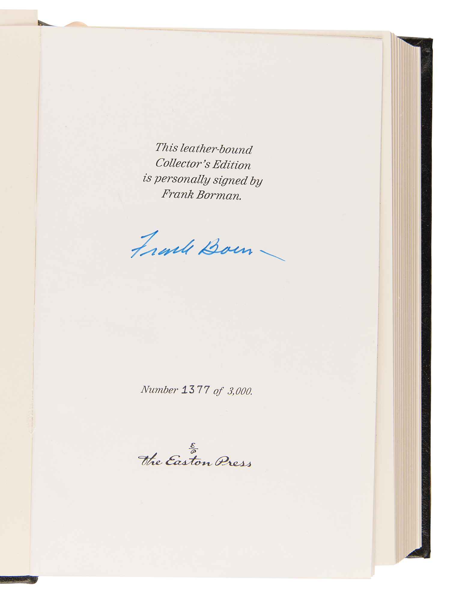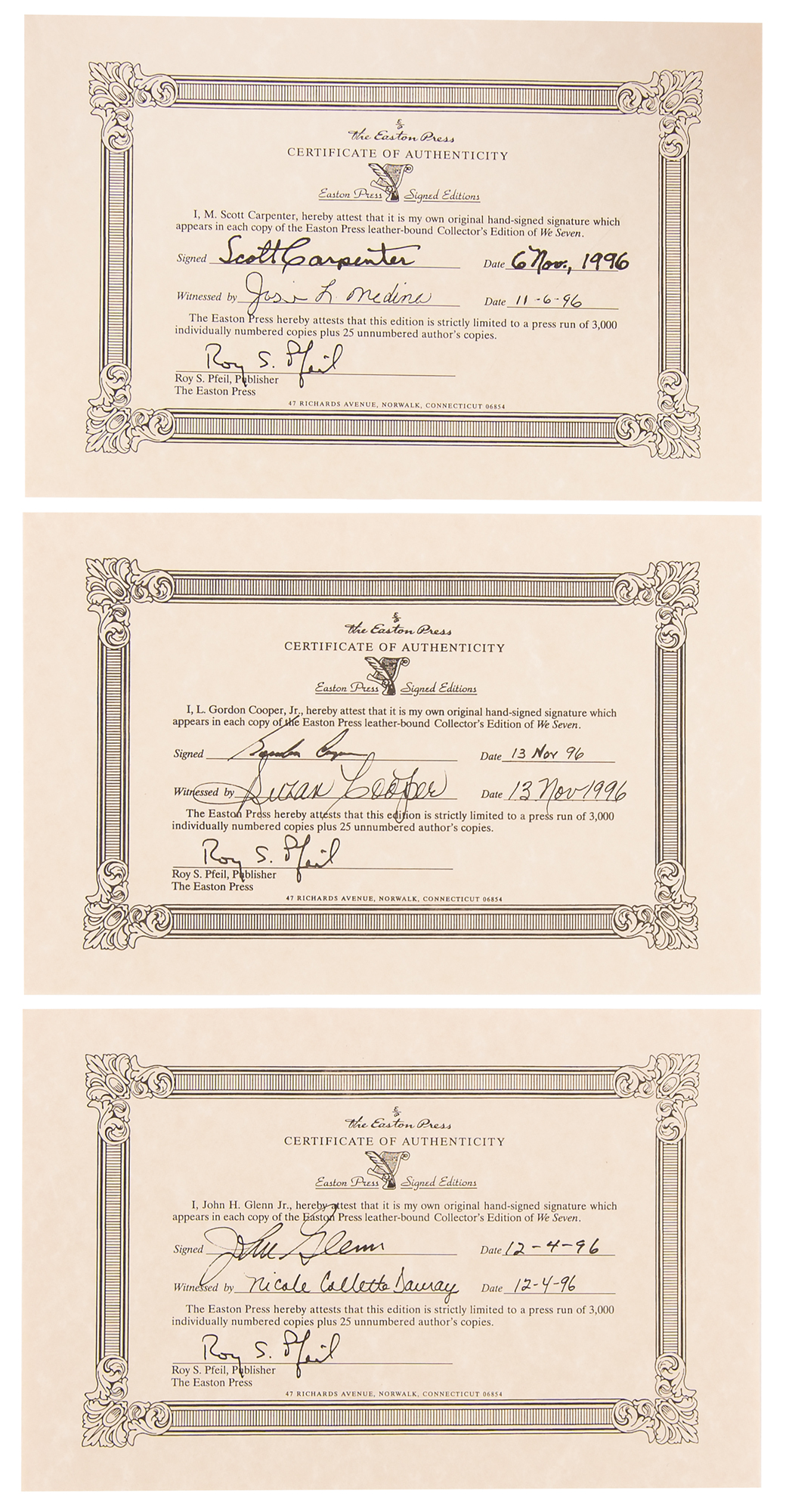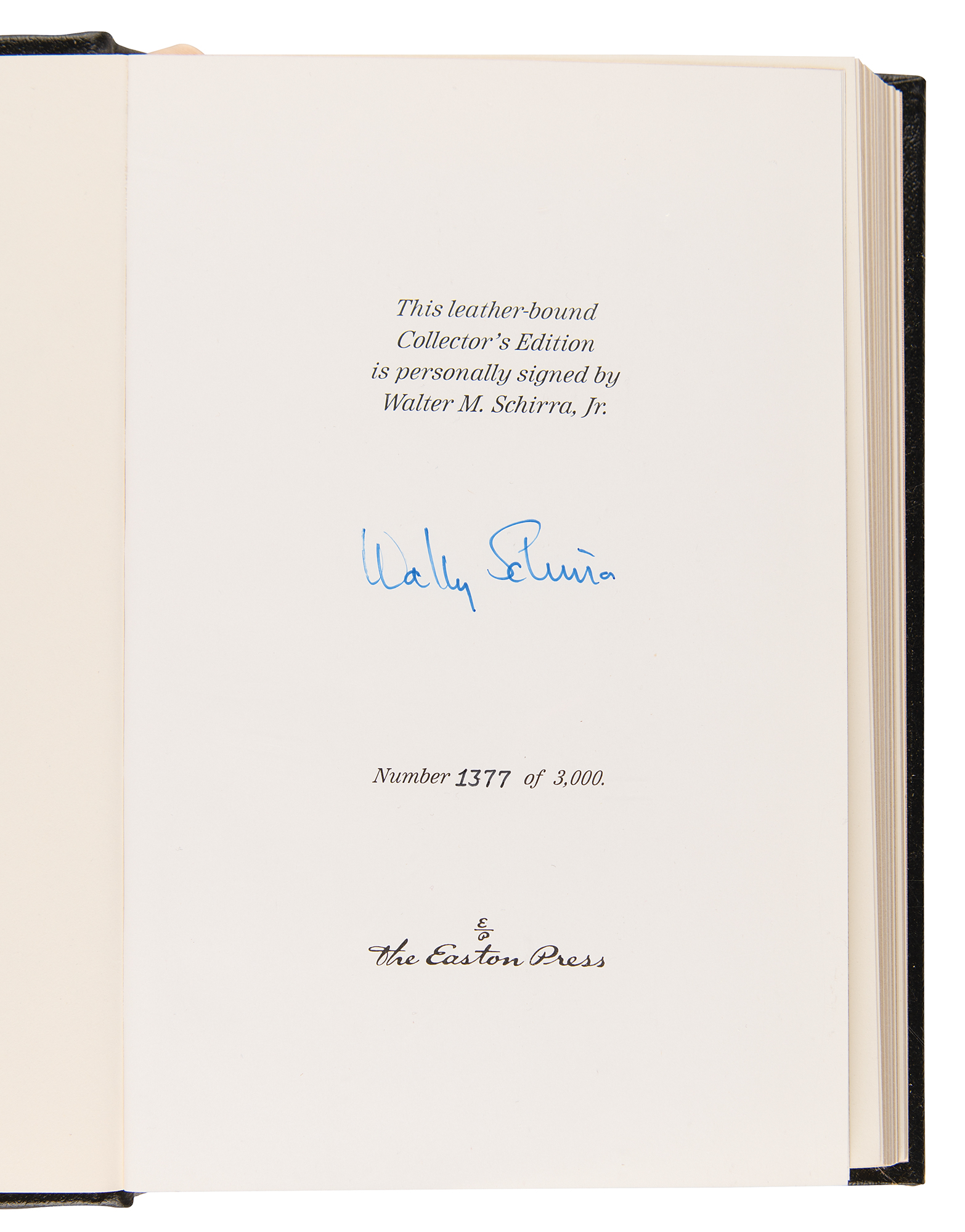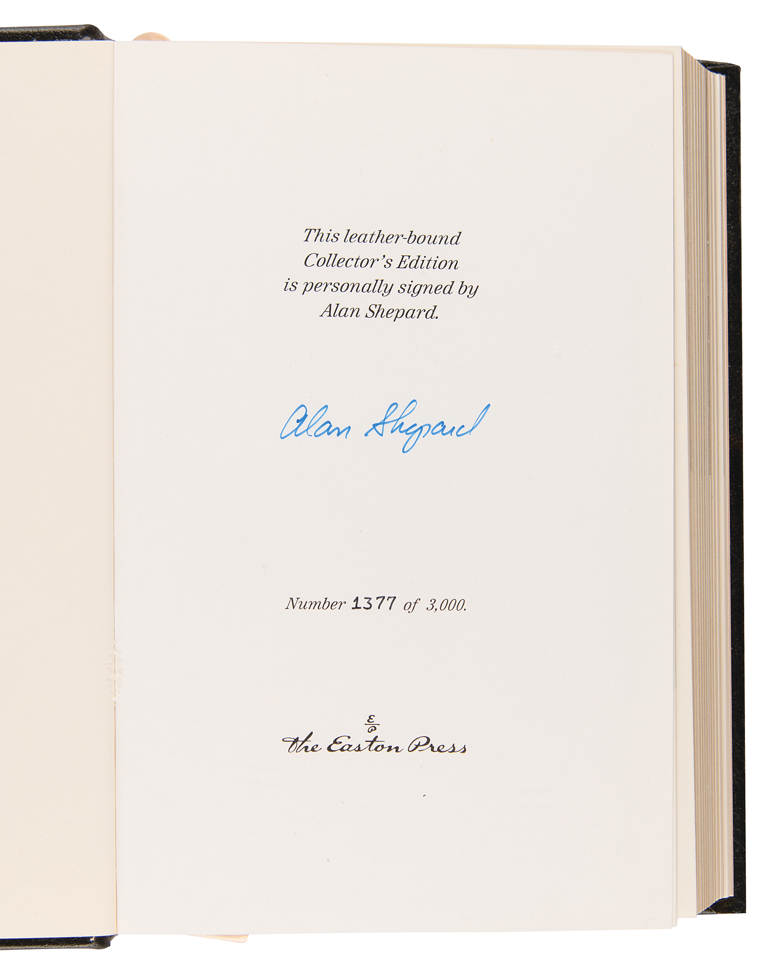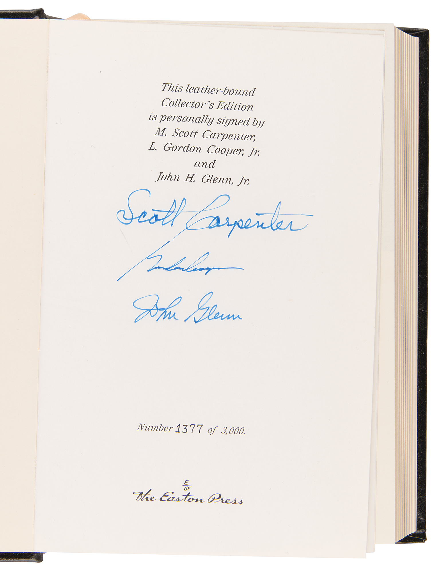 Signed books: a six-volume set of The Astronaut’s Library. Each a limited collector’s edition, numbered 1377/3000. Leatherbound hardcovers, 6.25 x 9.25. Each book is signed on the colophon in ink by one or more astronauts, including: We Seven (Scott Carpenter, Gordon Cooper, and John Glenn), Men from Earth (Buzz Aldrin), Lost Moon (Jim Lovell), Countdown (Frank Borman), Schirra’s Space (Wally Schirra), and Moon Shot (Alan Shepard). In overall fine to very fine condition. Each accompanied by the publisher’s certificate of authenticity.